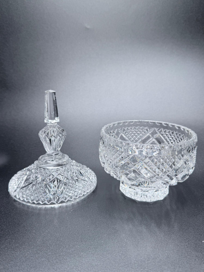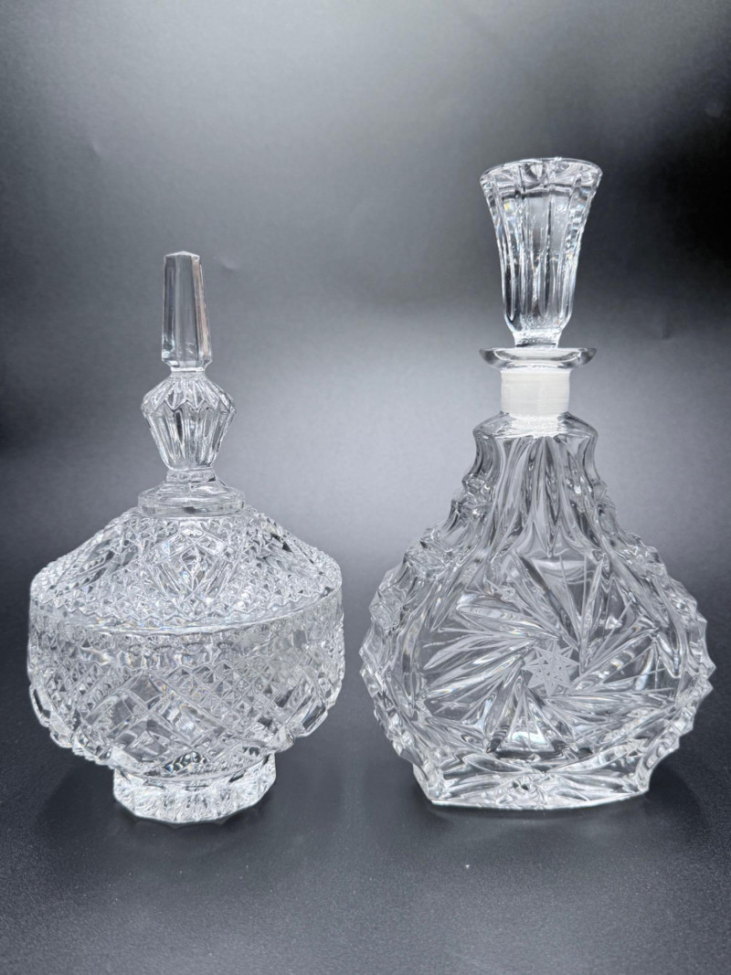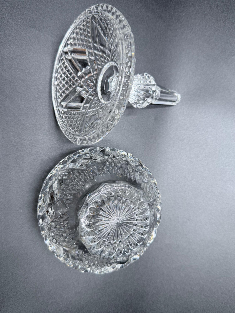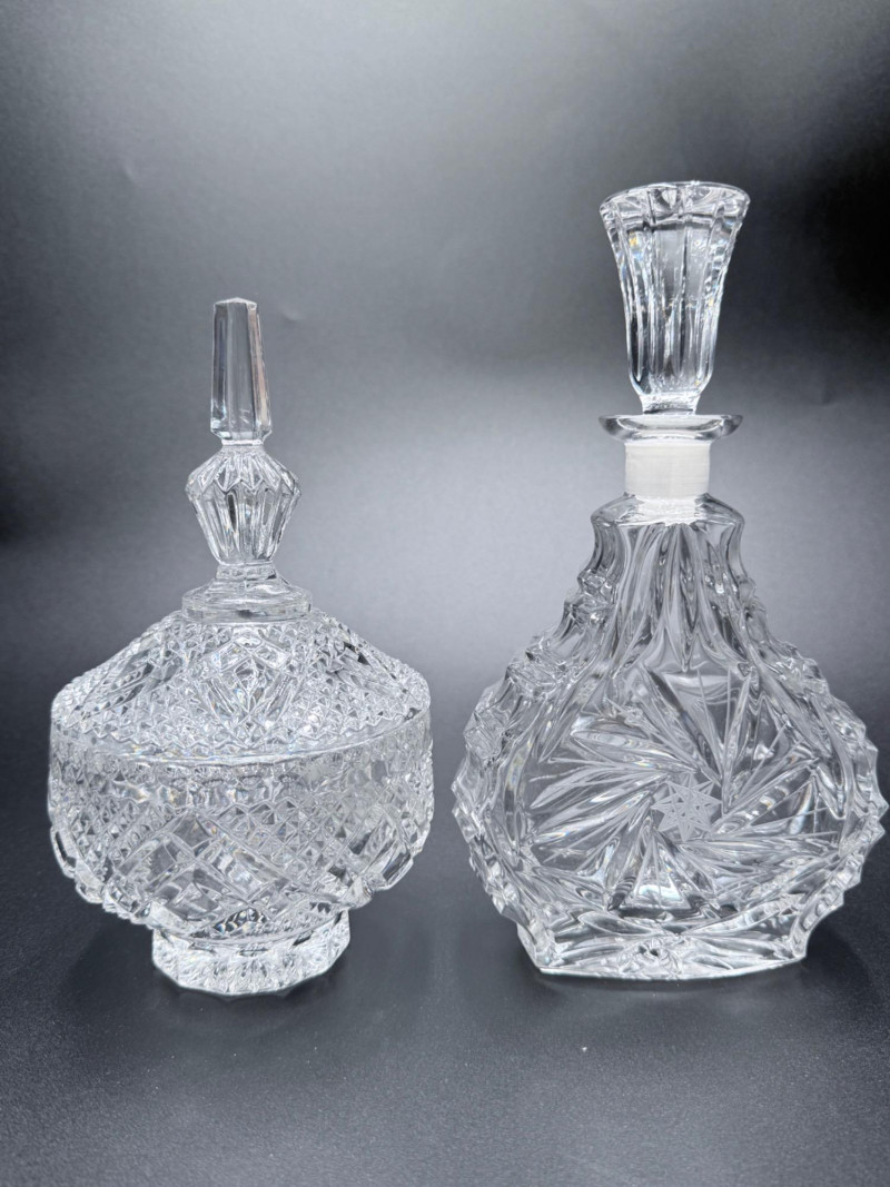 Vintage Crystal Candy Dish and Decanter Vintage pressed or lead crystal glassware set, showcasing detailed cut-style patterns such as pinwheel, starburst, fan, and crosshatch designs. Each piece features faceted surfaces that enhance light reflection. Set Includes: Candy Dish with Lid Decanter with Stopper