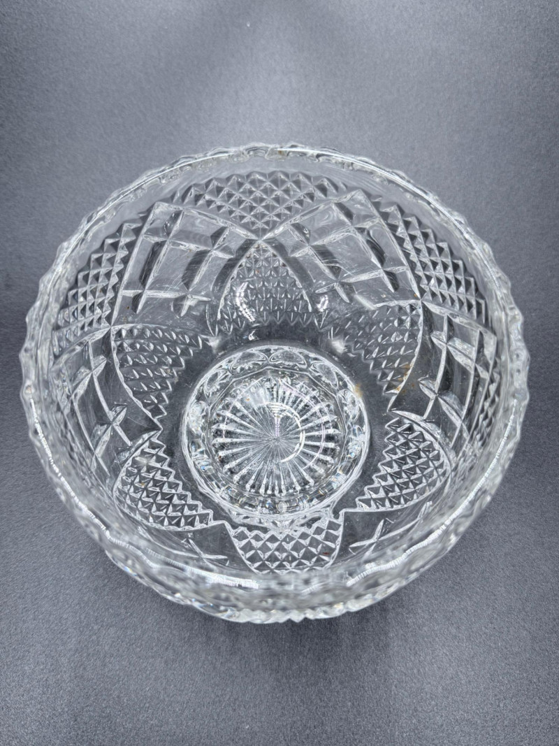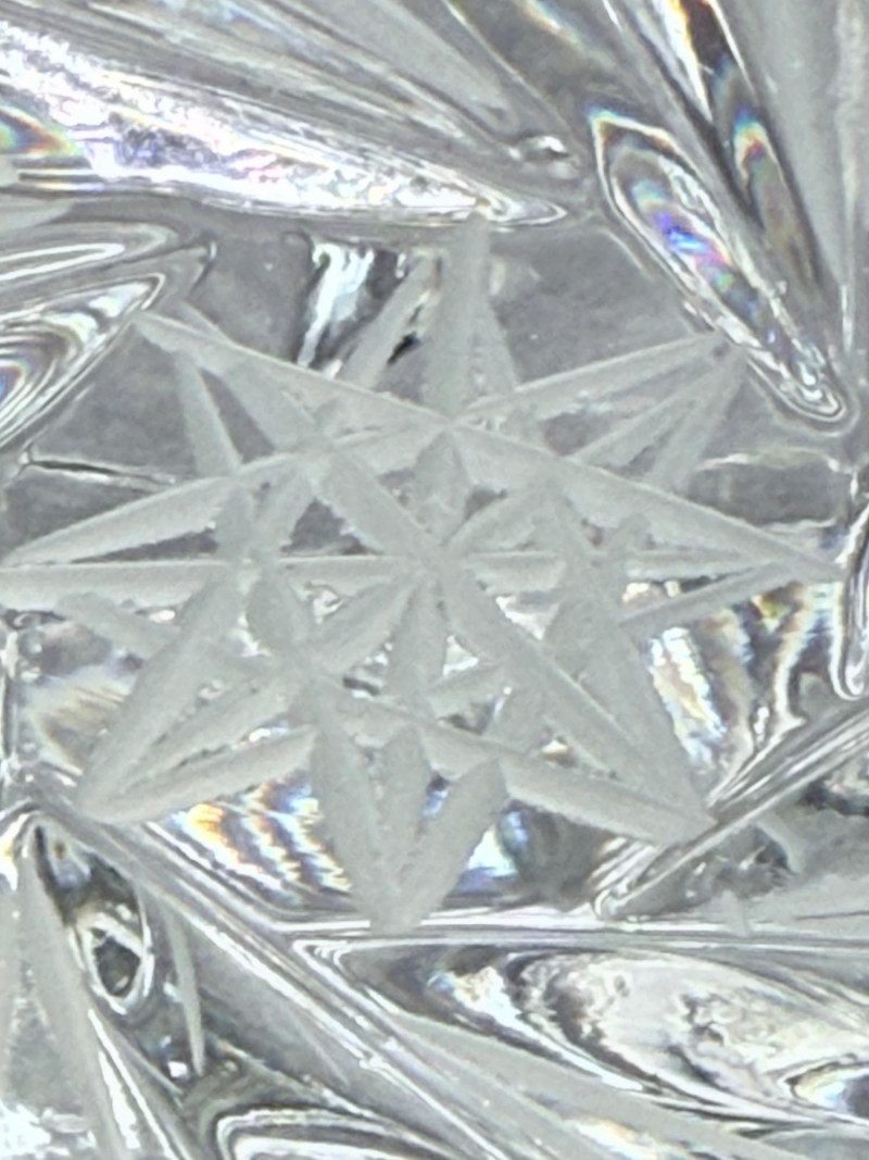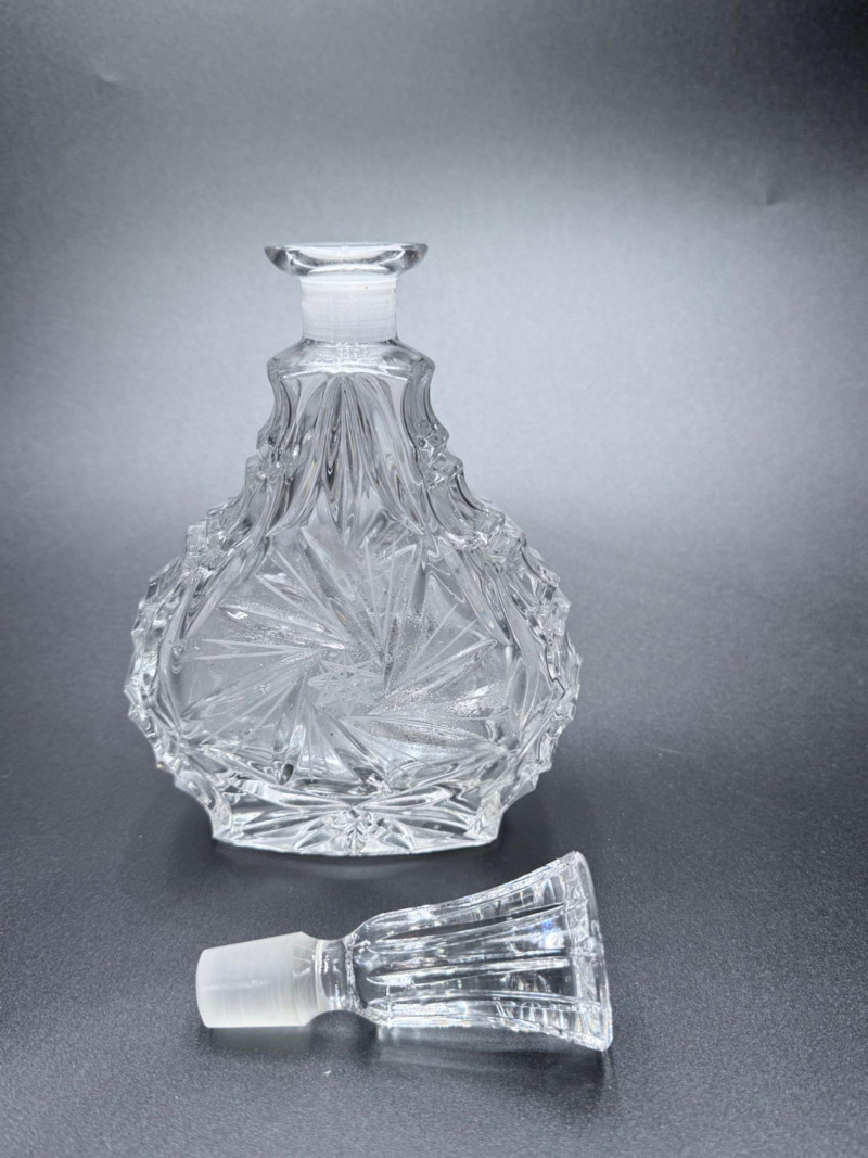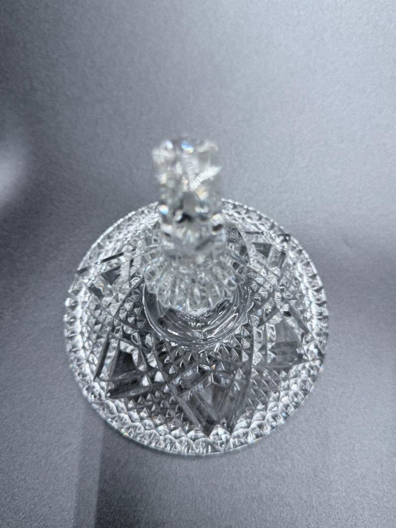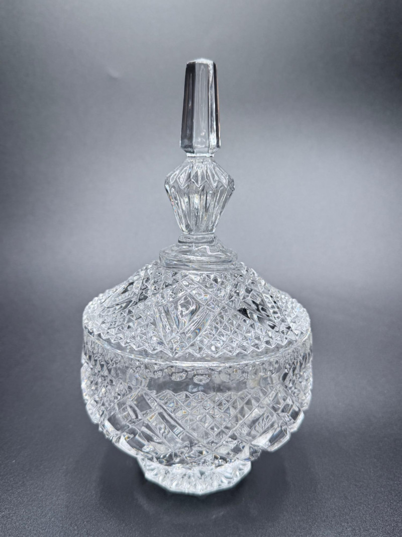 Vintage Crystal Candy Dish and Decanter Vintage pressed or lead crystal glassware set, showcasing detailed cut-style patterns such as pinwheel, starburst, fan, and crosshatch designs. Each piece features faceted surfaces that enhance light reflection. Set Includes: Candy Dish with Lid Decanter with Stopper