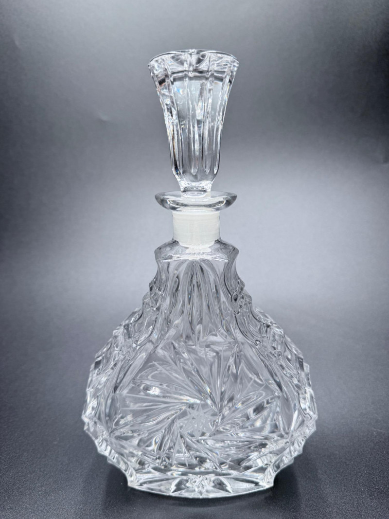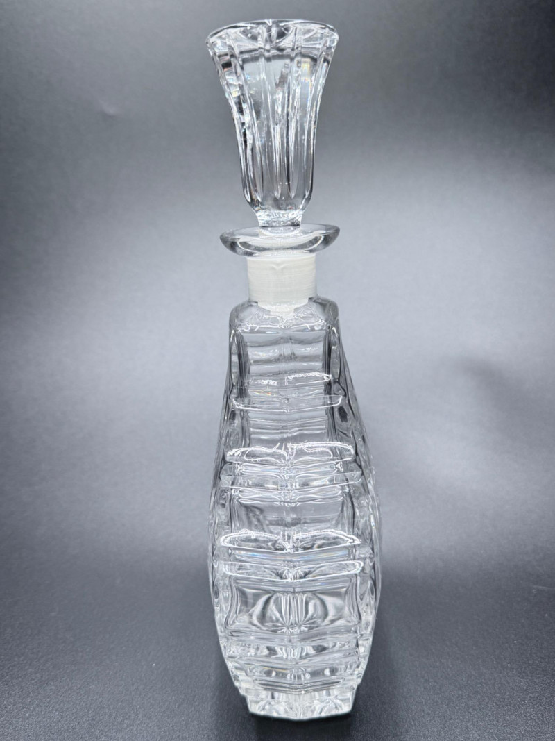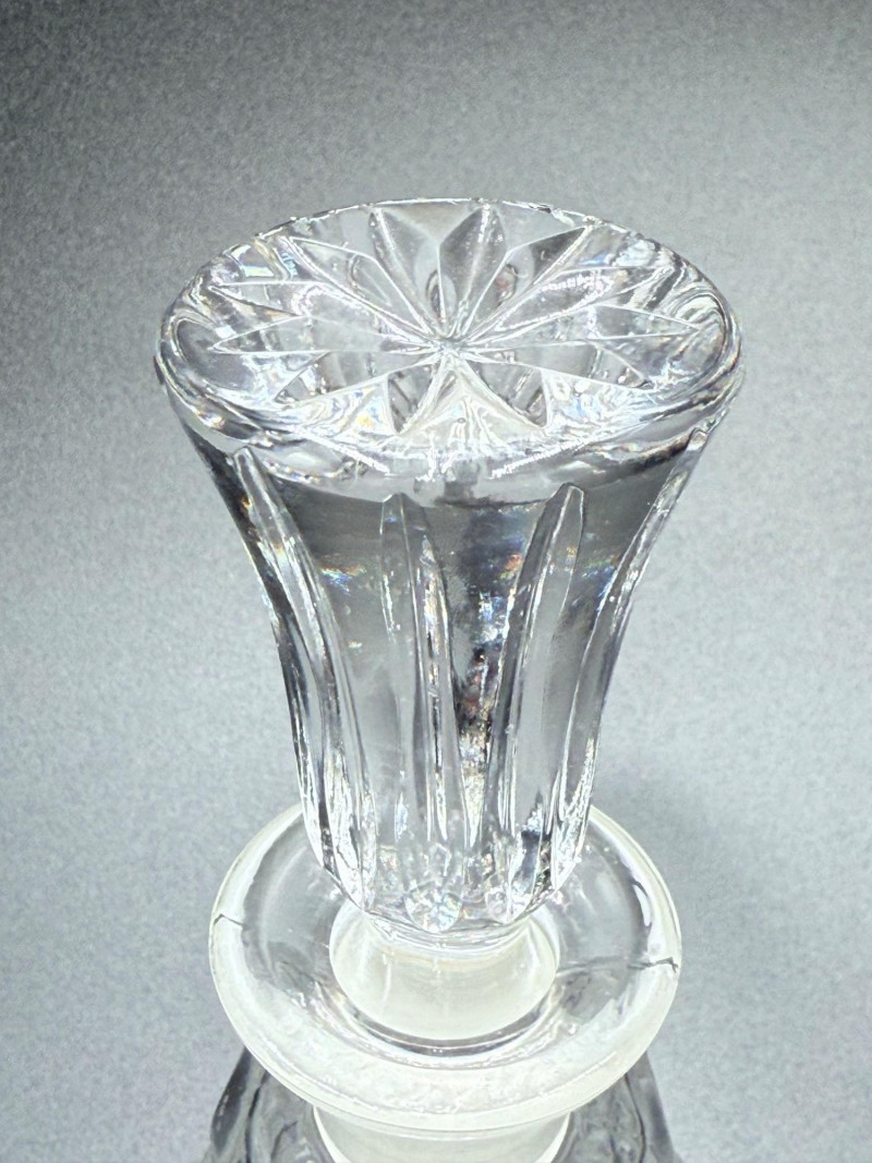 Wide-body decanter with narrow neck and a flared base. Decorated with prominent starburst and fan motifs. The stopper is faceted and shaped to complement the body.