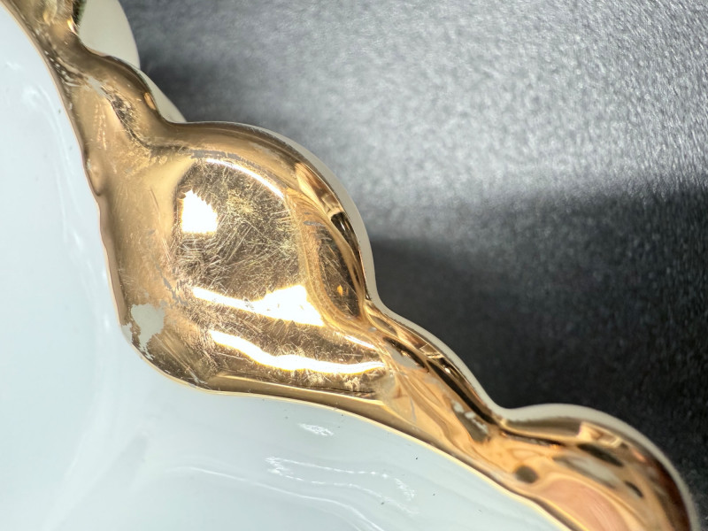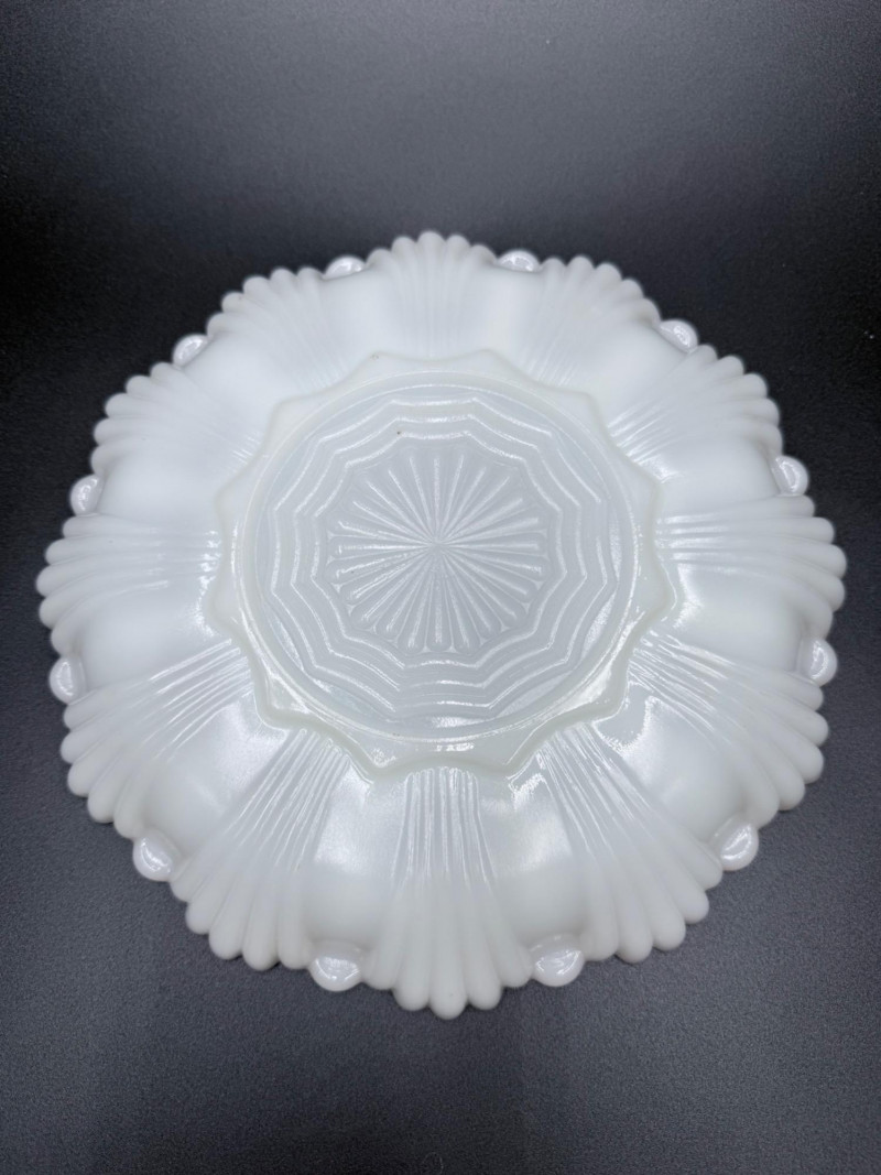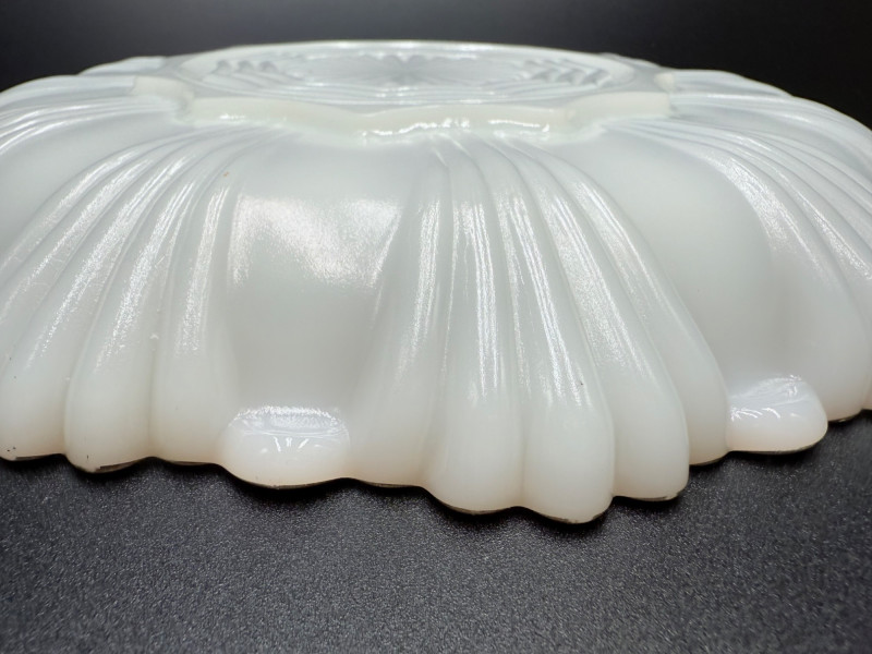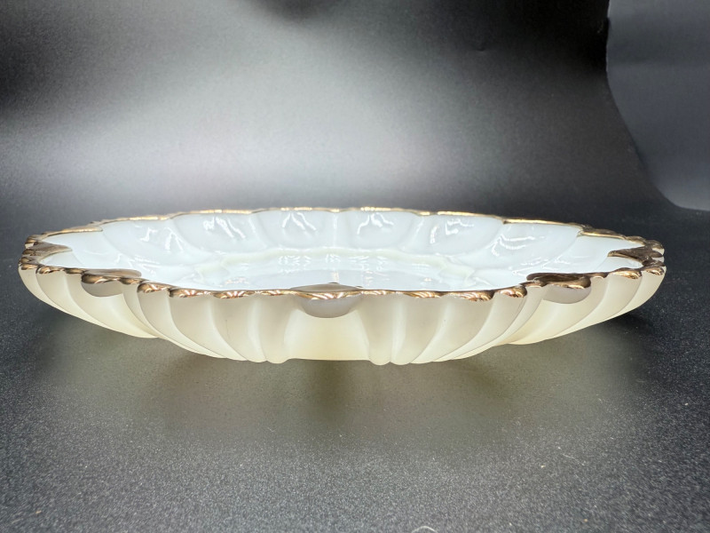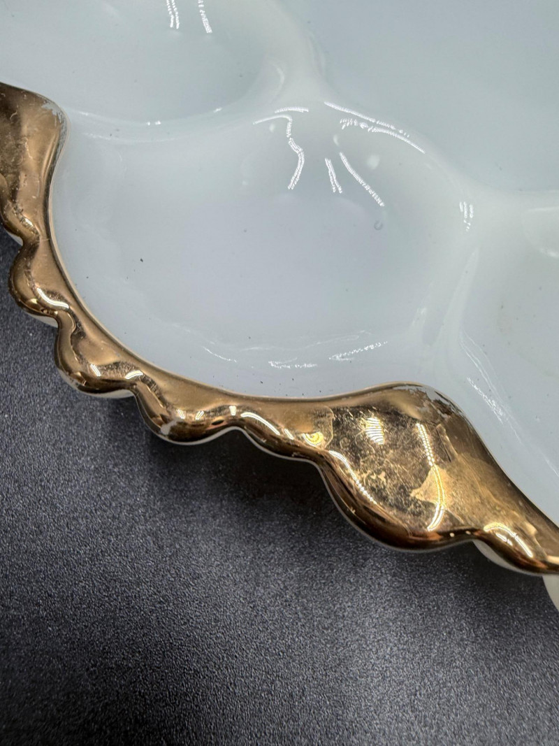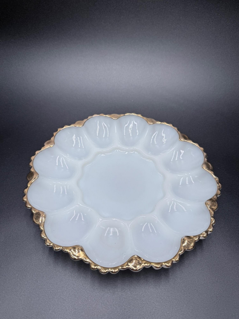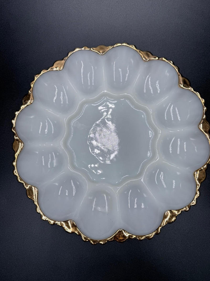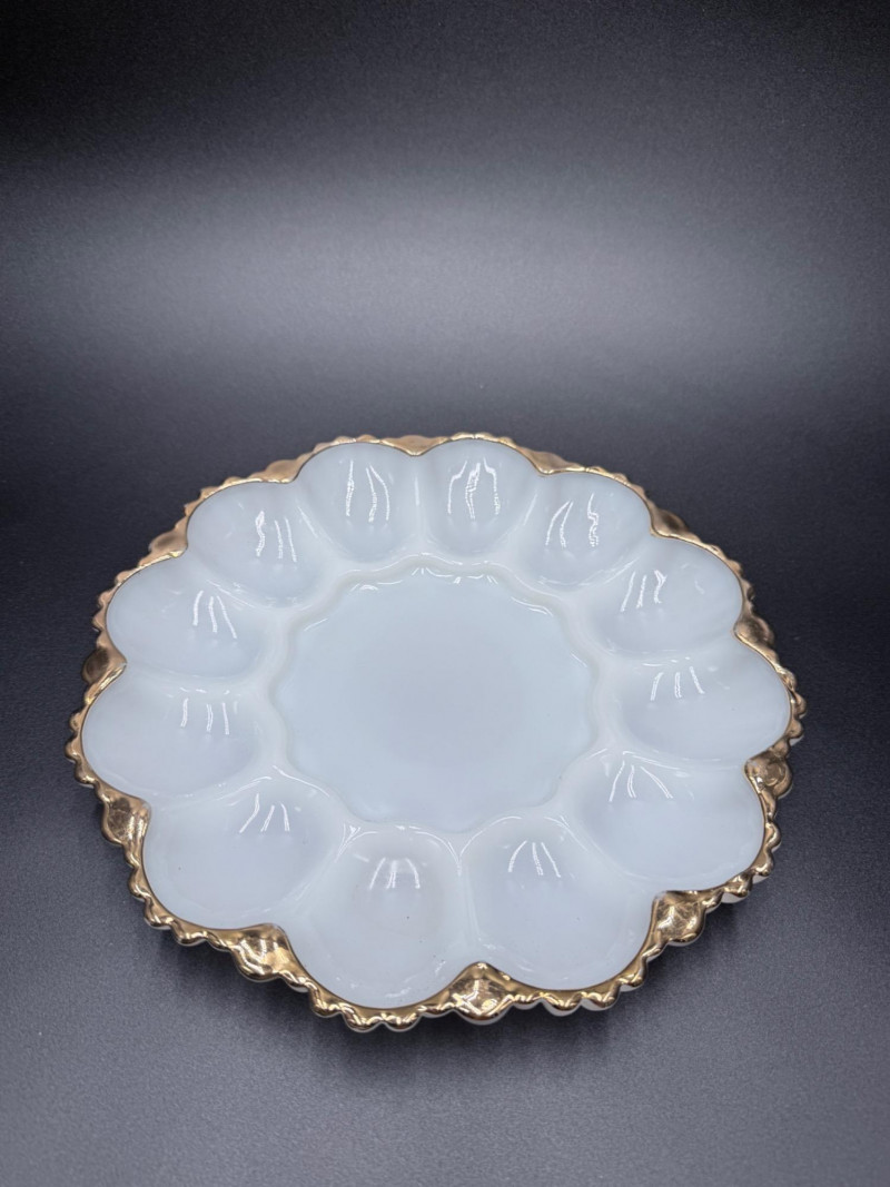 Milk Glass Deviled Egg Plate with Gold Trim White milk glass deviled egg plate with twelve oval compartments surrounding a central round section. The rim is scalloped and trimmed with gold paint. The underside features molded drapery-style detailing. Likely made by Anchor Hocking.