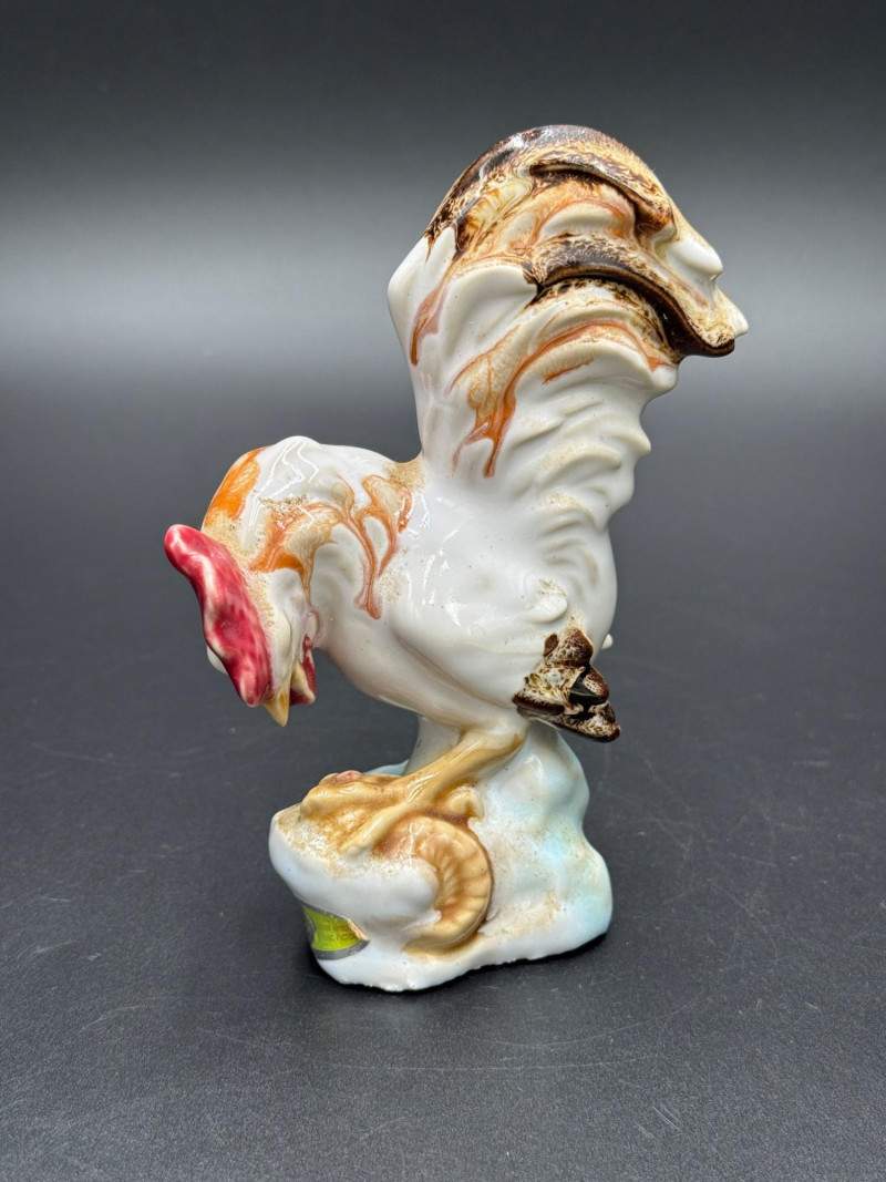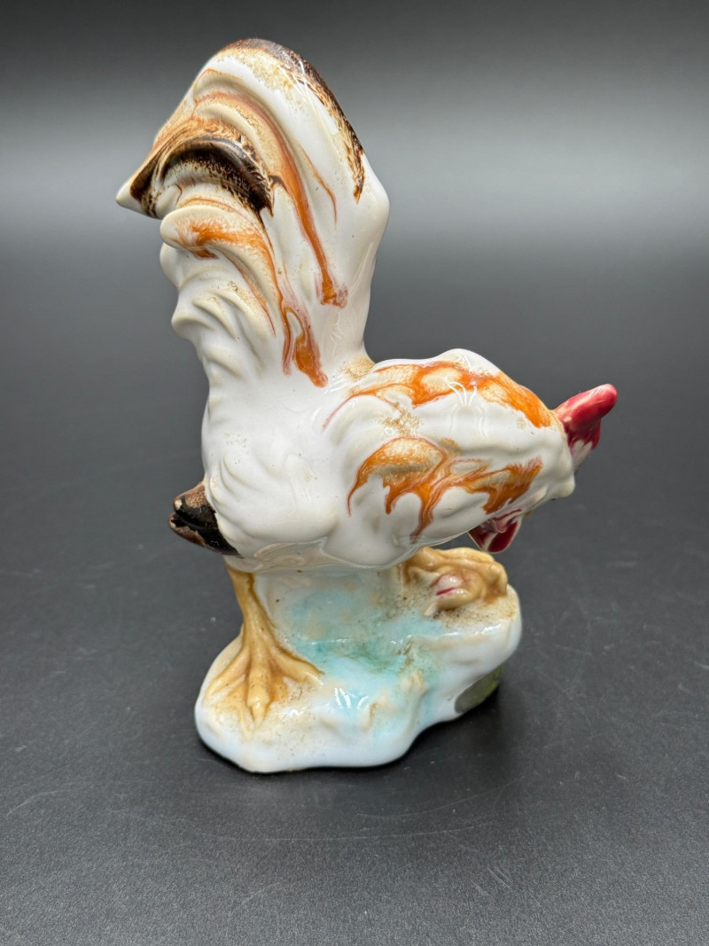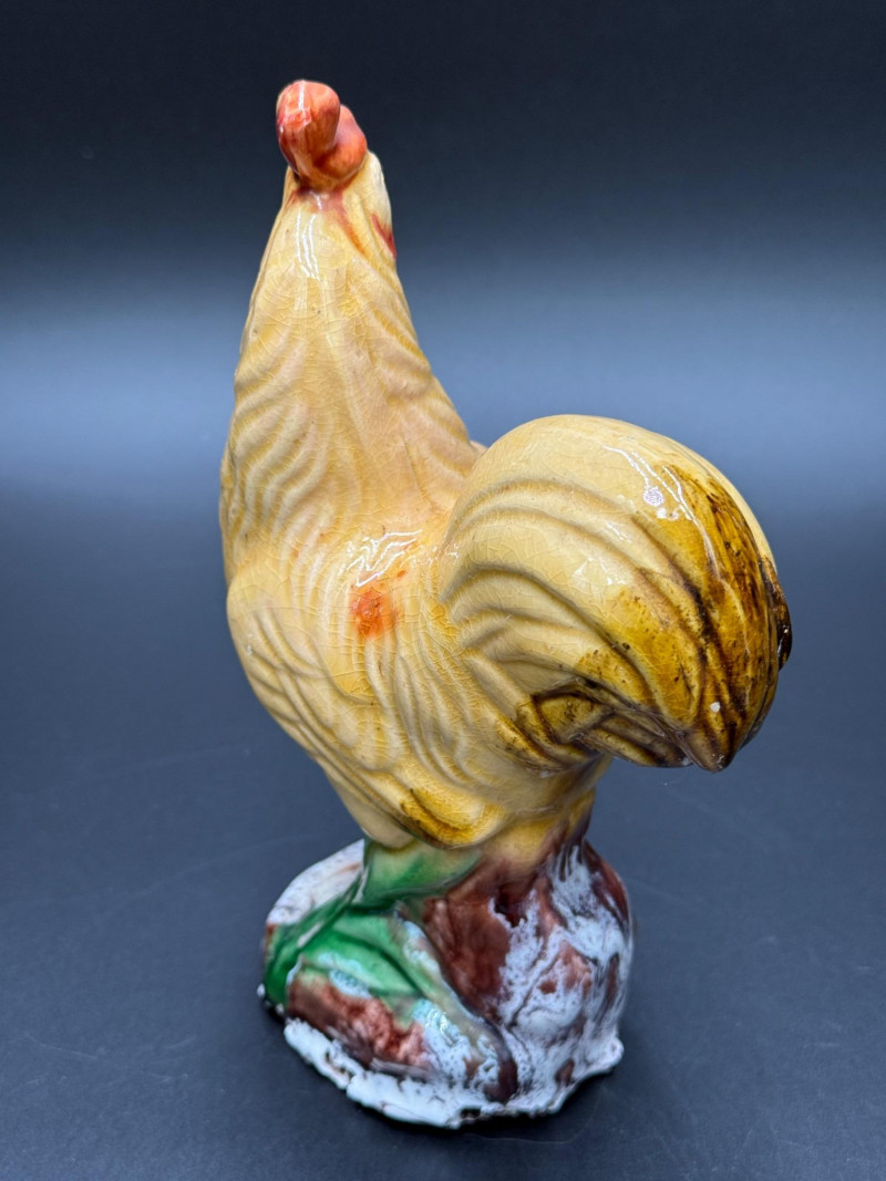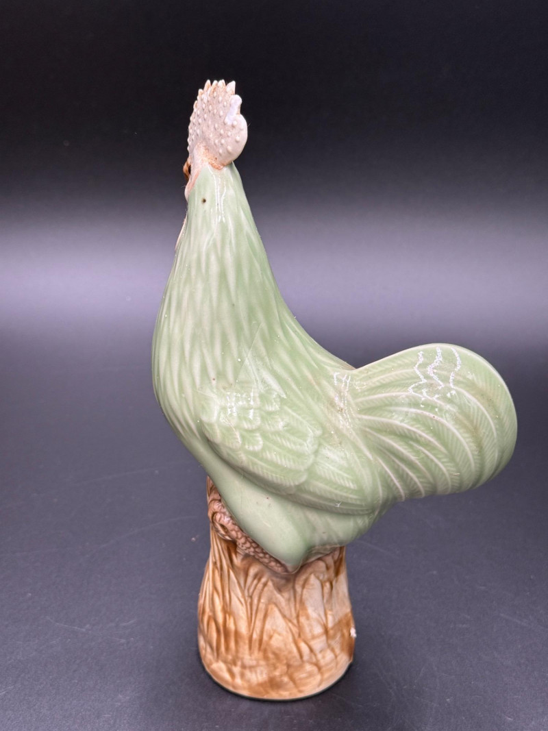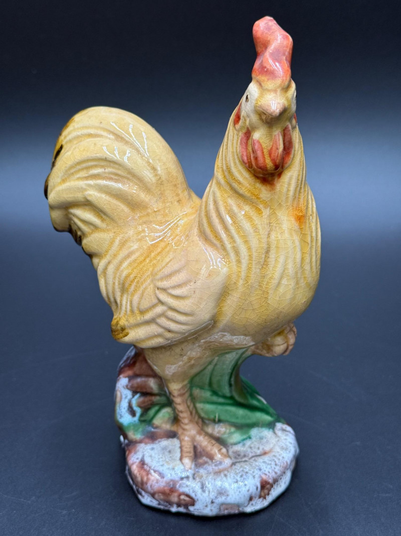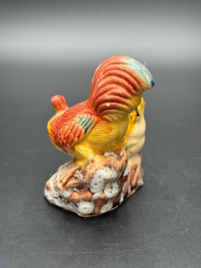 Rooster and Hen Figurine Assortment Assortment of rooster and hen figurines in various poses. Includes individual roosters, hens with chicks, and rooster-hen pairs. Glazed in multicolor tones such as yellow, red, white, green, and brown. Each figure stands on a sculpted base with elements like grass, rock, or tree stumps. Material appears to be ceramic or similar composite. Sizes: 3"–8.5" tall