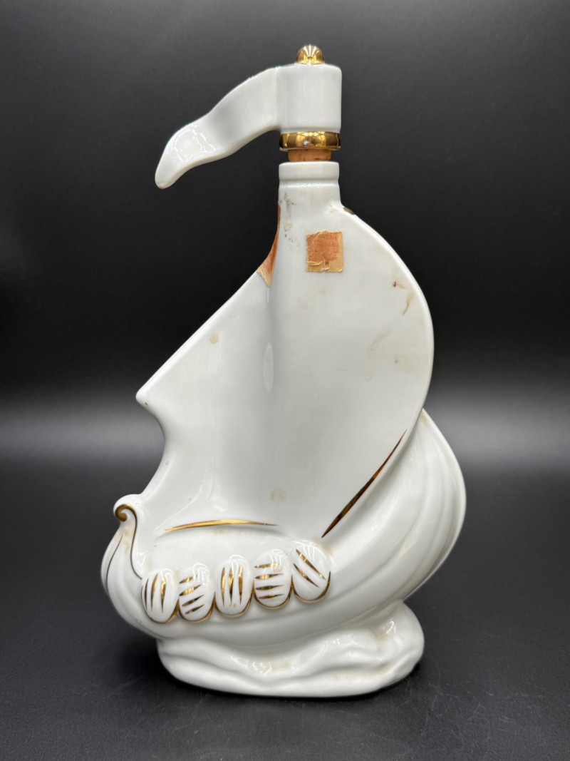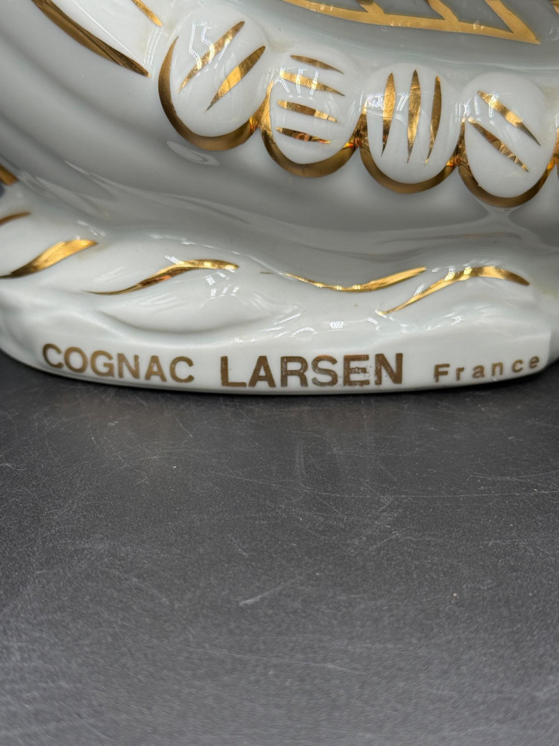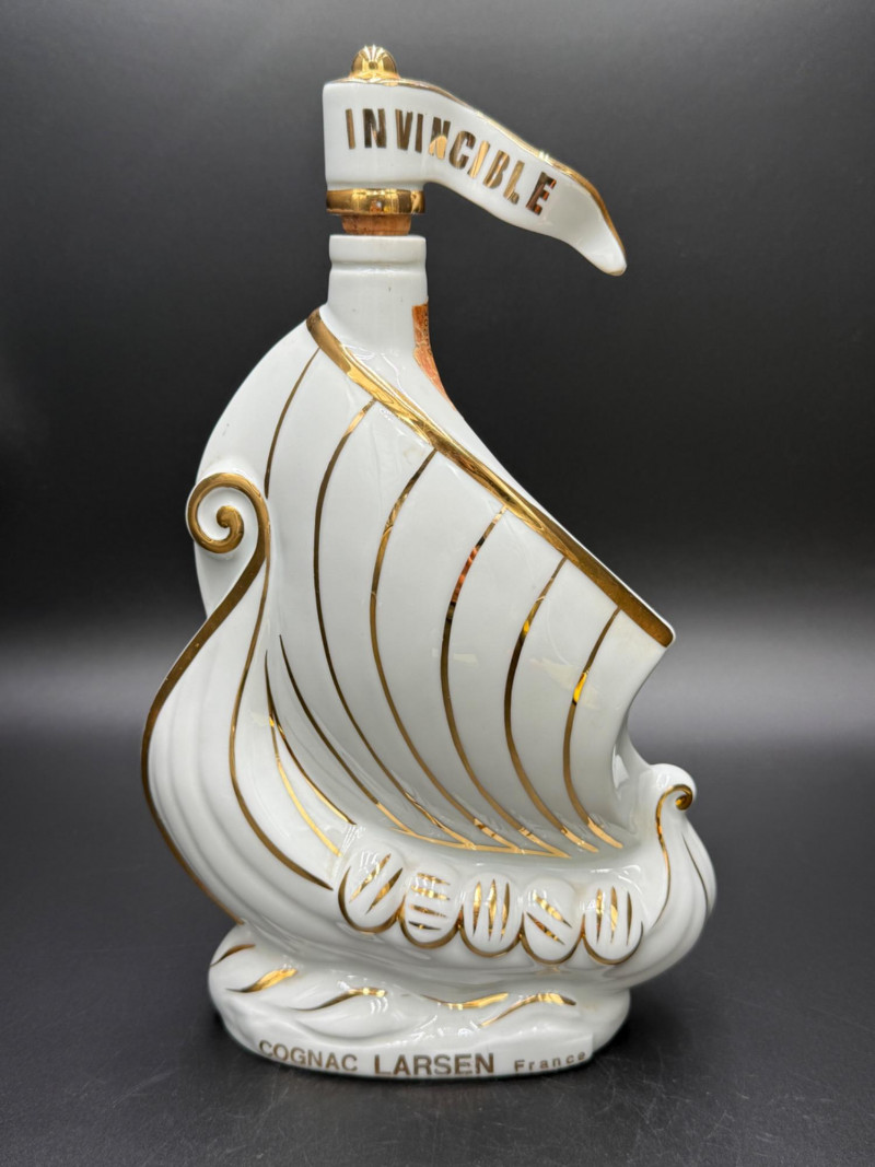 Porcelain Cognac Decanter – Larsen “Invincible” Porcelain decanter in the shape of a stylized Viking ship. The front features the word "INVINCIBLE” on the sail and "COGNAC LARSEN France" on the base. The surface is decorated with raised, wave-like patterns and gold trim. The stopper is shaped to resemble a flag and is also accented with gold. The underside is marked: Measurements:
