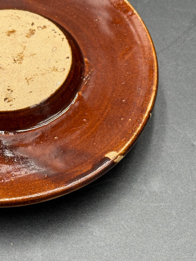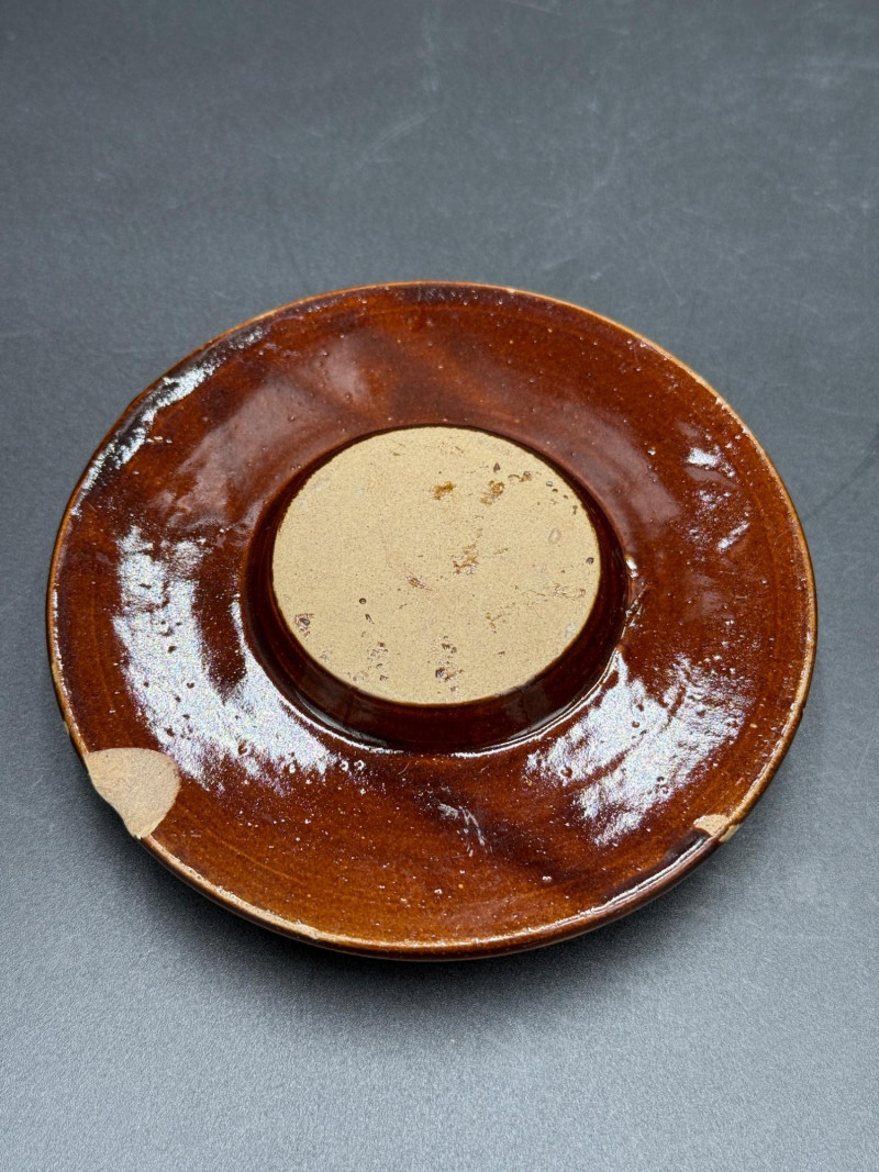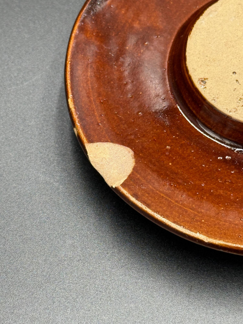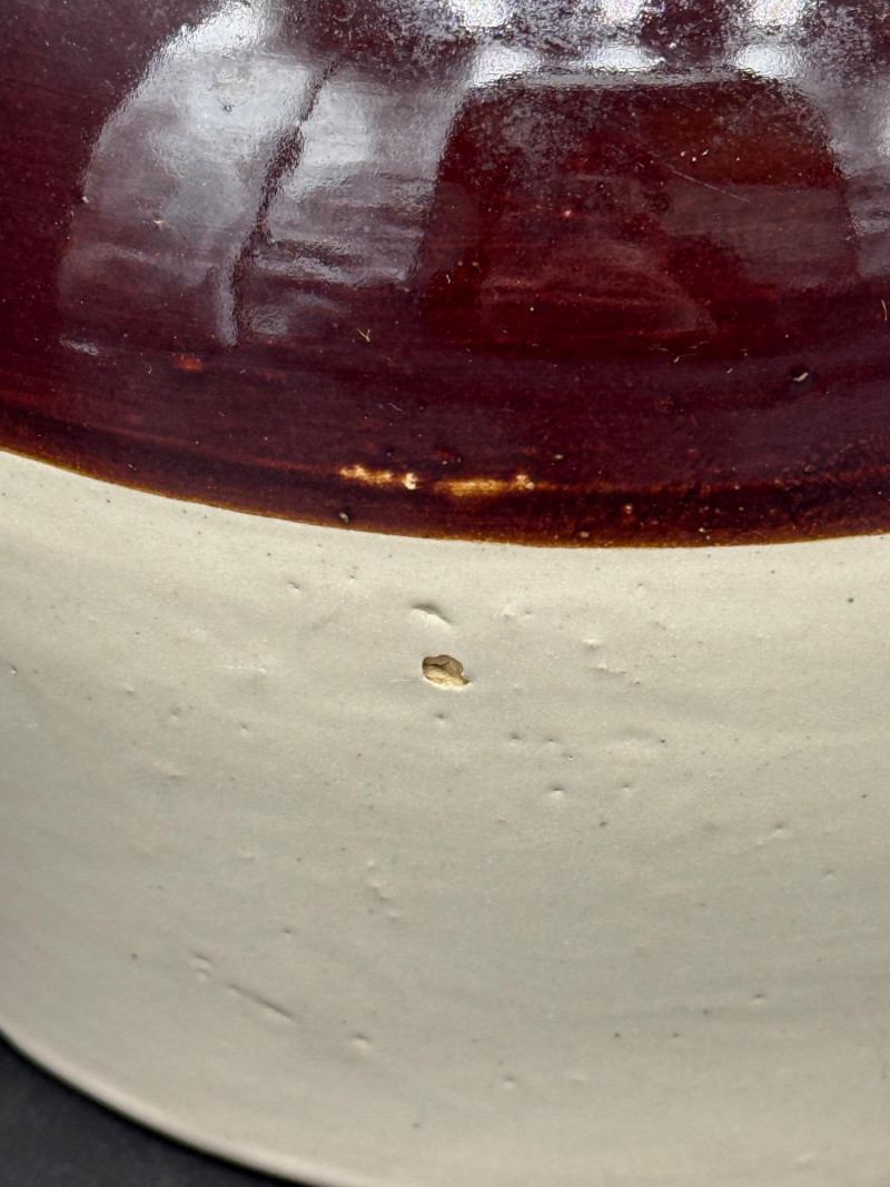 Two-tone bean pot-style container with lid and side handles. The upper half is dark brown and glossy, and the lower half is matte light beige. The lid has a central cork insert. The interior is coated in the same dark brown finish. The base is unglazed with kiln marks. Noted defects include a chip on the lid and a small flaw on the side.
