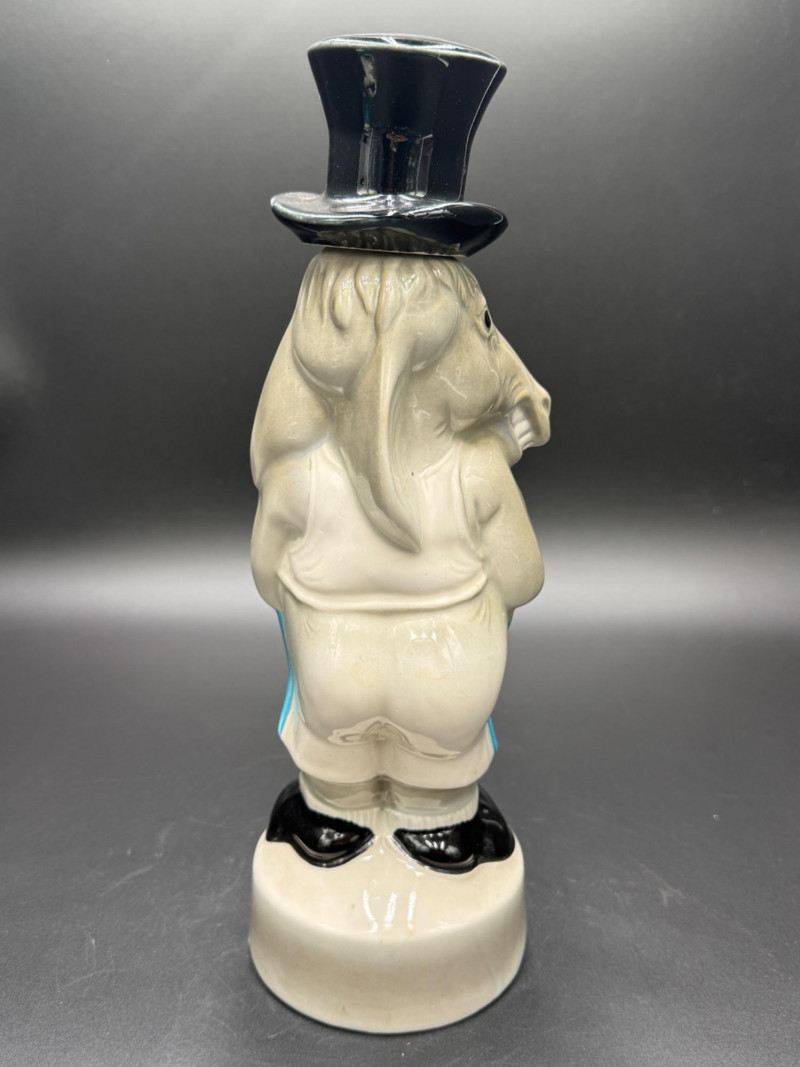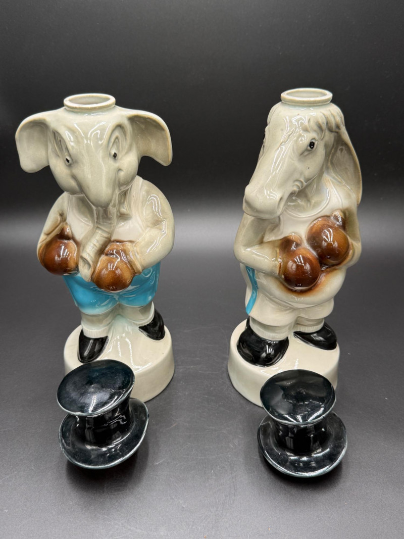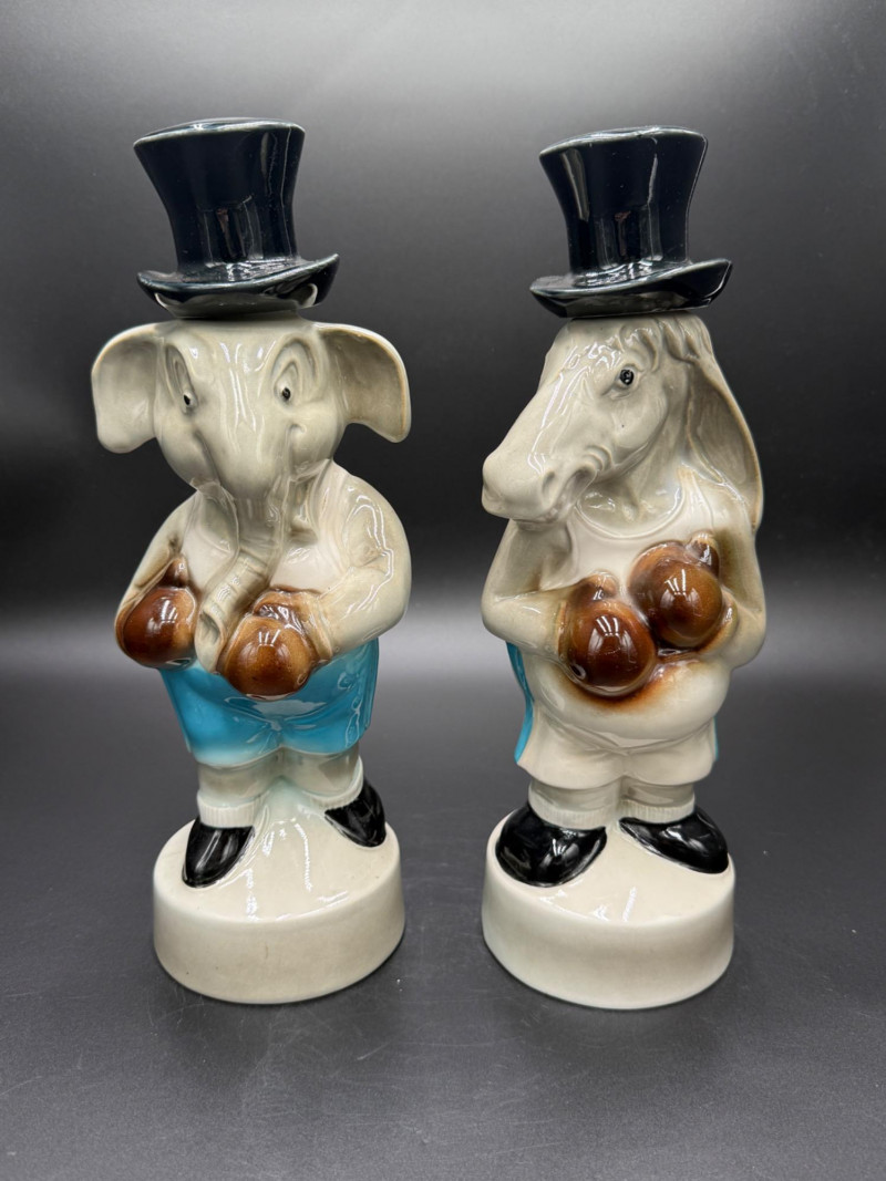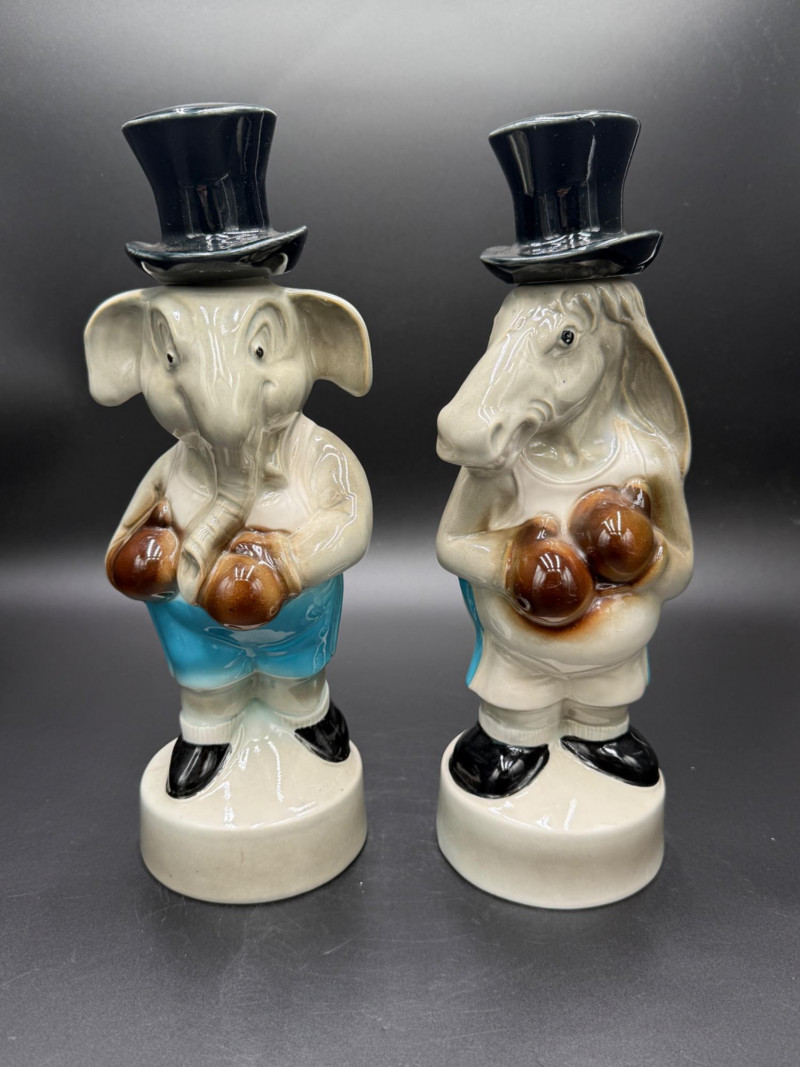 Pair of ceramic figural decanters representing an elephant and a donkey, each wearing a black top hat, blue trousers, black shoes, and brown boxing gloves. These character bottles were created by James B. Beam Distilling Co. and manufactured by Regal China in 1964. Each bottle has molded text on the base stating: