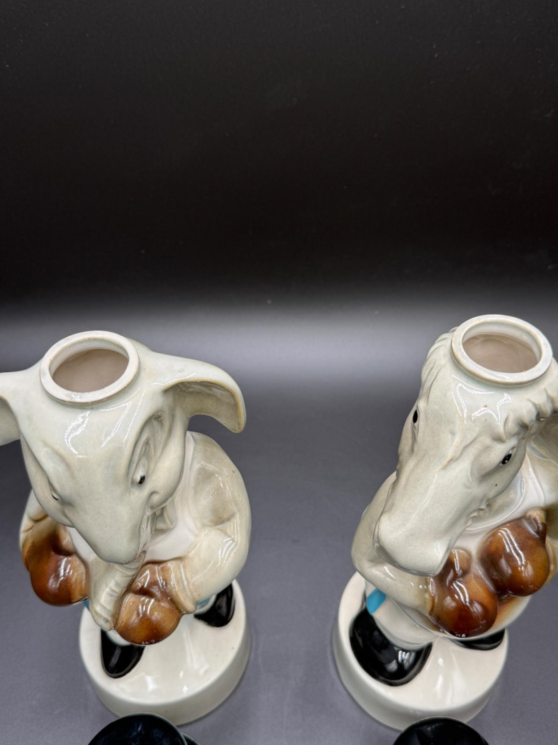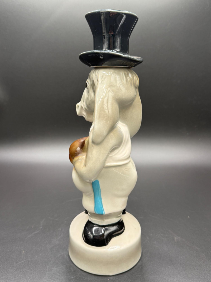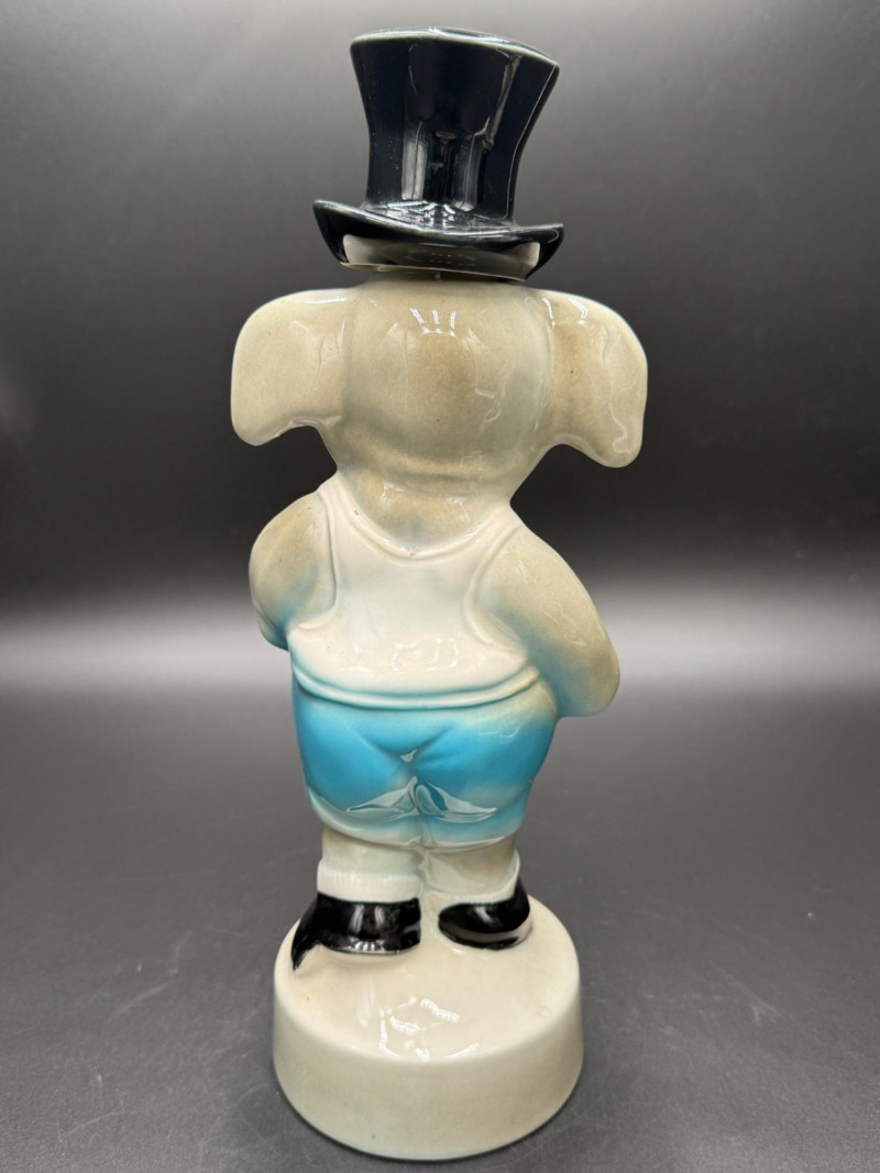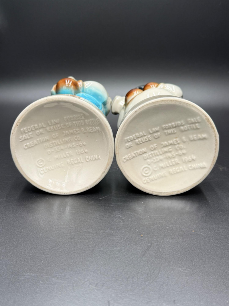 Pair of ceramic figural decanters representing an elephant and a donkey, each wearing a black top hat, blue trousers, black shoes, and brown boxing gloves. These character bottles were created by James B. Beam Distilling Co. and manufactured by Regal China in 1964. Each bottle has molded text on the base stating: