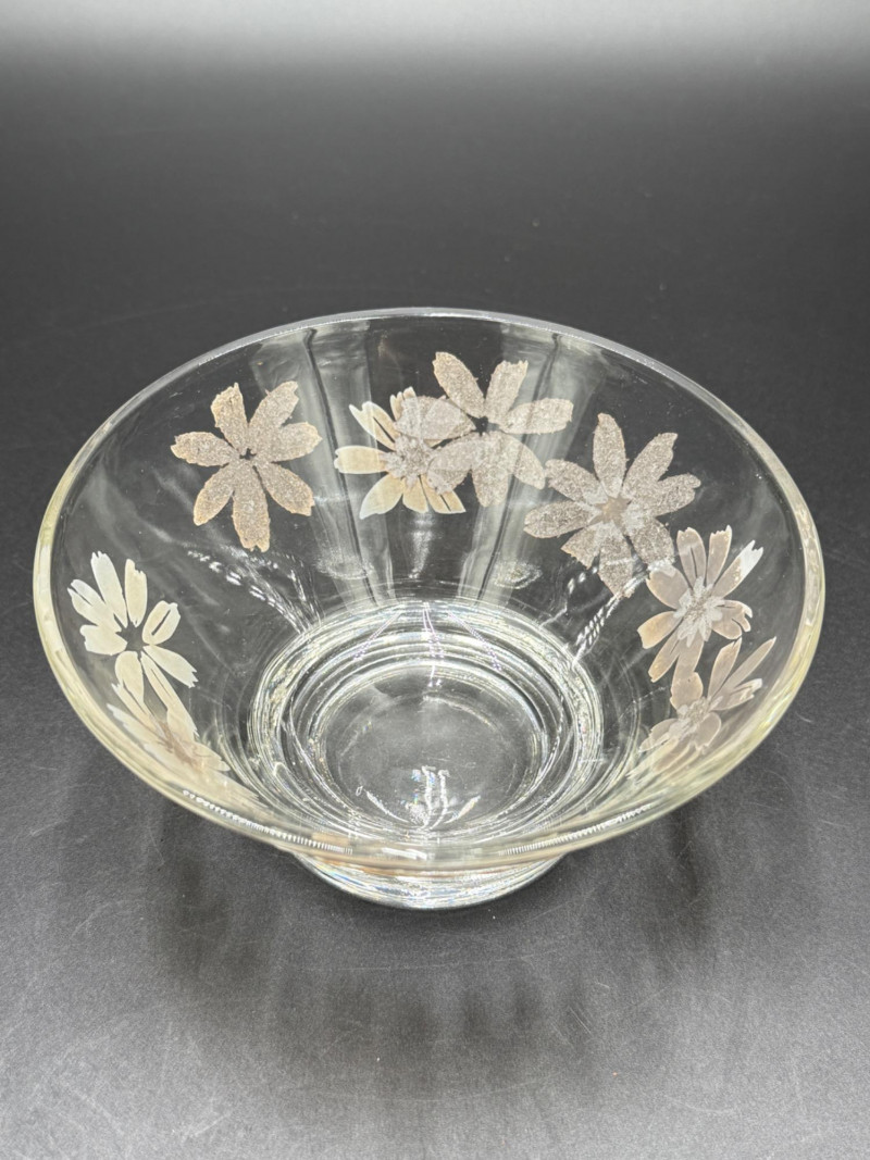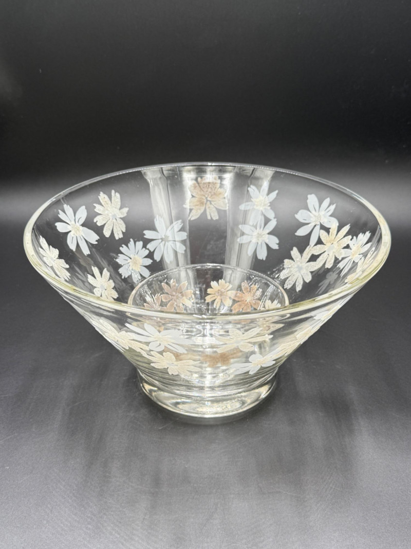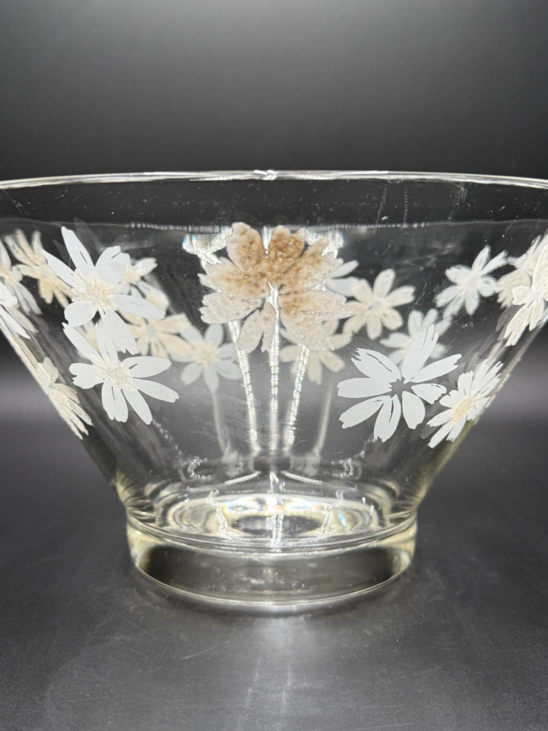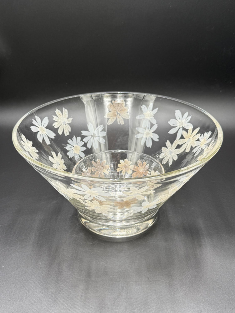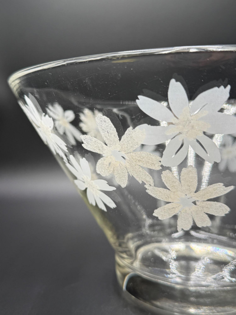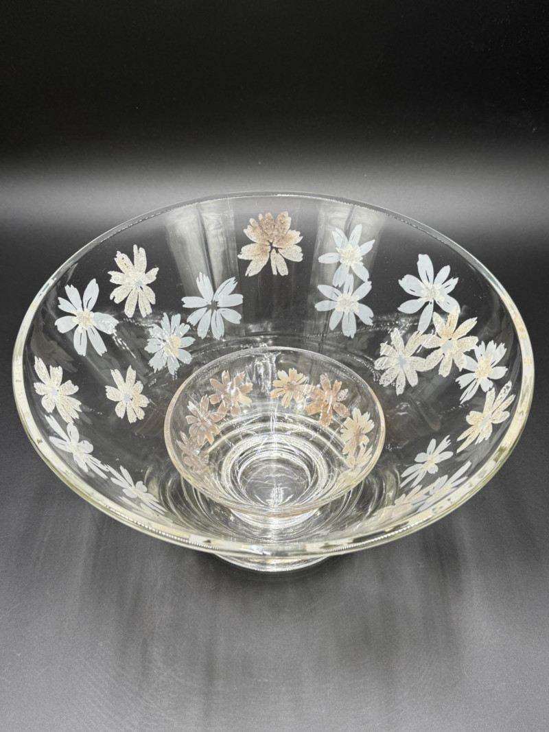Vintage Clear Glass Chip and Dip Set with Etched Daisy Design Vintage two-piece clear glass chip and dip set featuring an etched daisy pattern in white and gold tones. The larger bowl has flared sides with a wide opening, while the smaller bowl fits inside for serving dip. Both pieces share the same floral motif. Measurements: Approximate ranges from 5.5 to 10.5 inches.