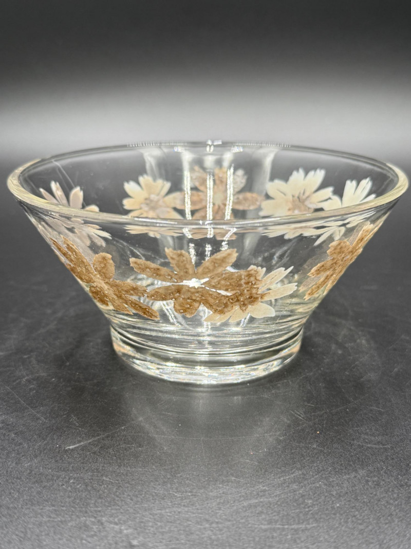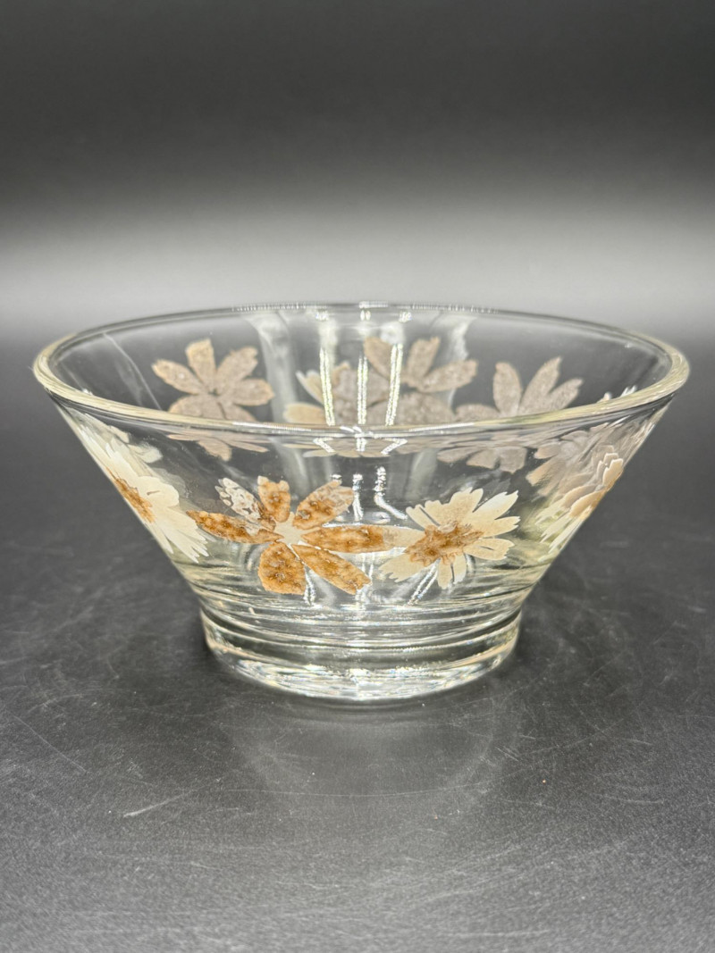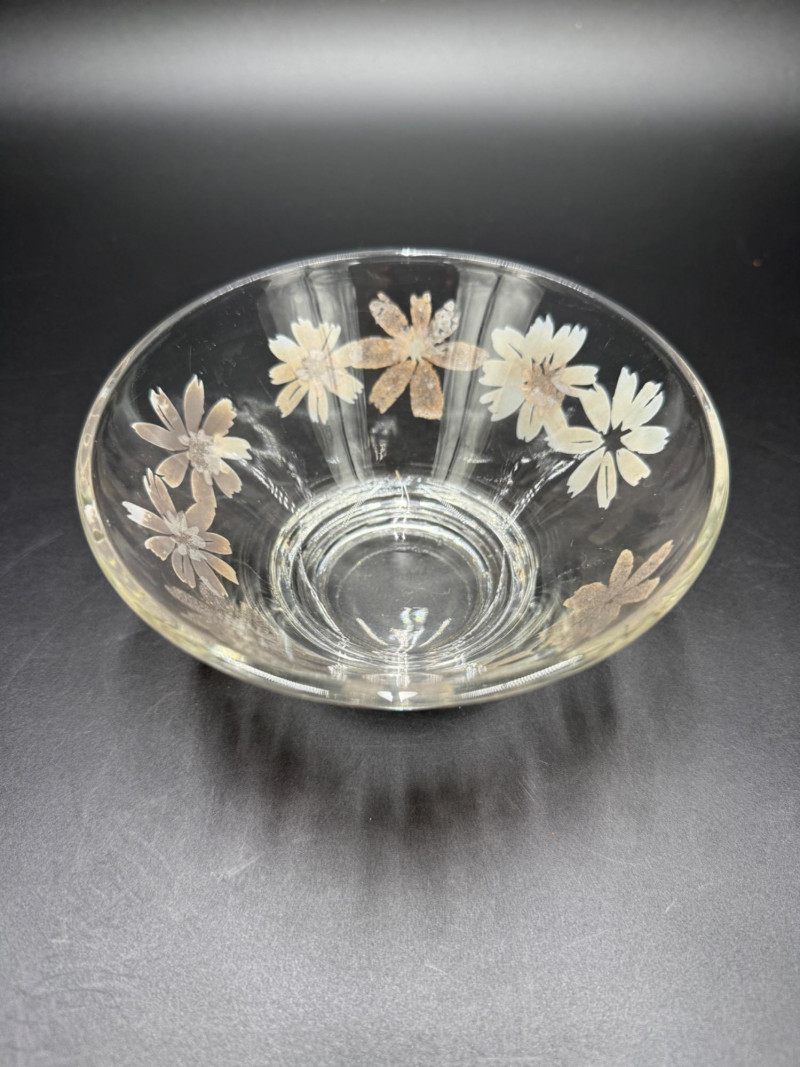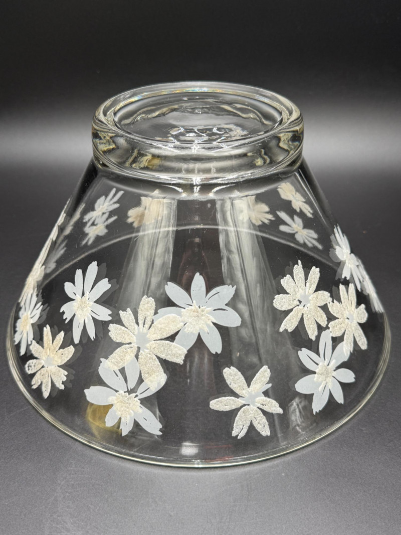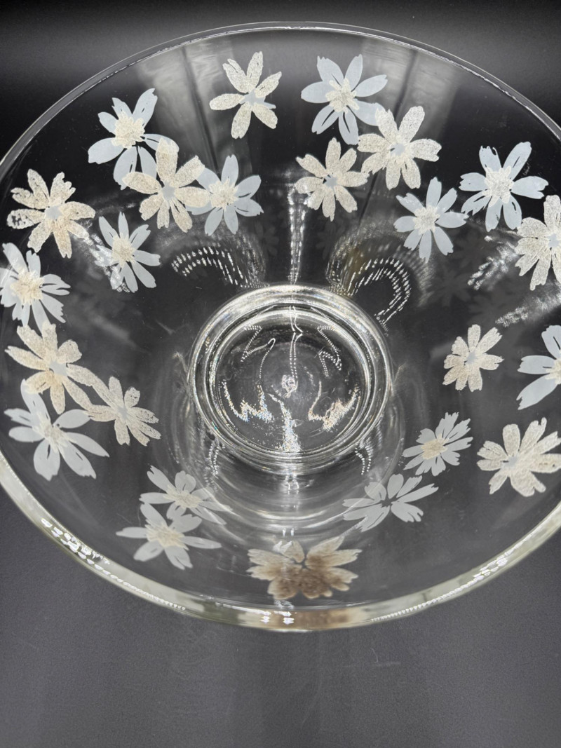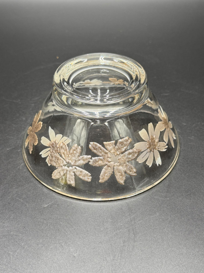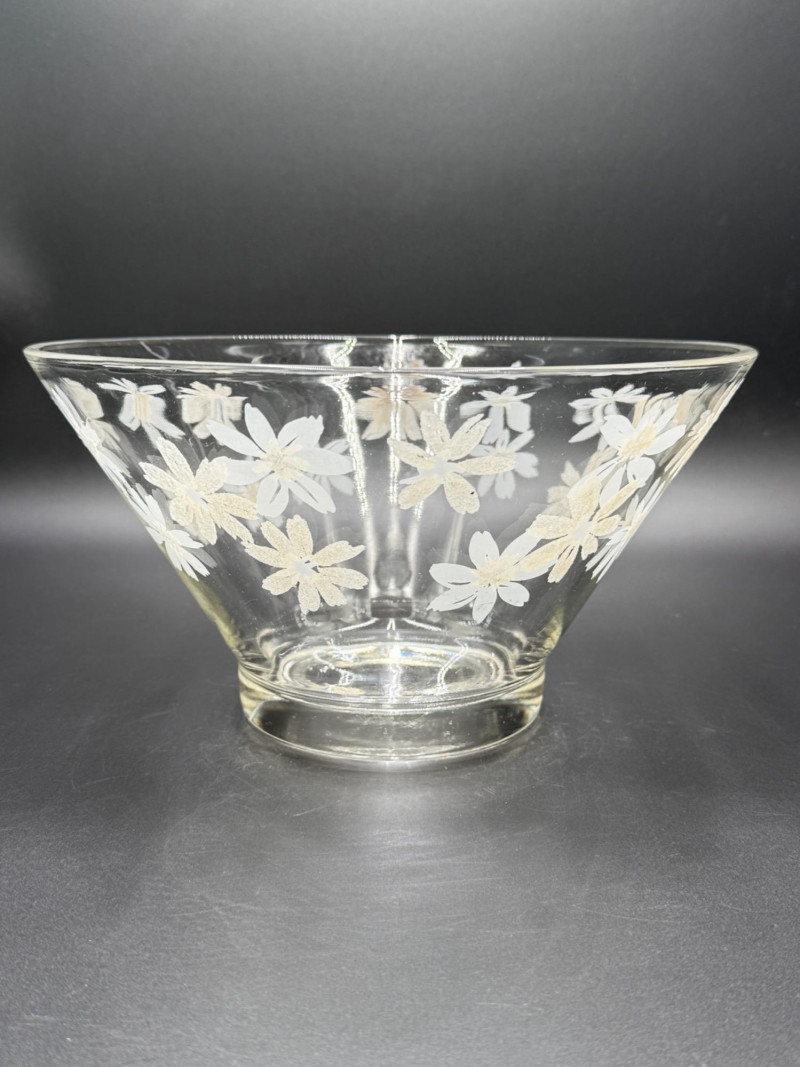 Vintage Clear Glass Chip and Dip Set with Etched Daisy Design Vintage two-piece clear glass chip and dip set featuring an etched daisy pattern in white and gold tones. The larger bowl has flared sides with a wide opening, while the smaller bowl fits inside for serving dip. Both pieces share the same floral motif. Measurements: Approximate ranges from 5.5 to 10.5 inches.