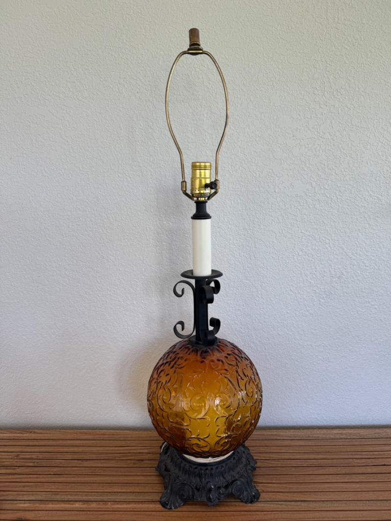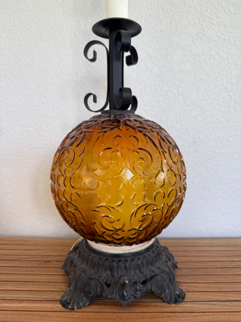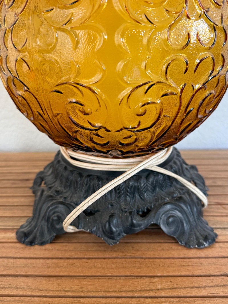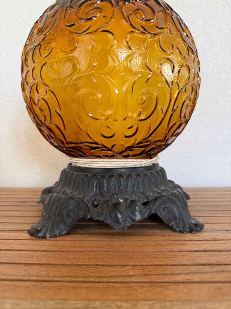 Vintage 1970s Amber Glass Globe Table Lamp Vintage 1970s table lamp featuring a round amber glass globe with a raised scroll pattern. The lamp includes a dark metal base with ornate detailing, a vertical white stem, and black metal scrollwork supports. It has a brass socket, harp, and finial. Fitted with a two-prong plug and a fabric-wrapped cord. Dimensions: 30" tall x 8" wide. Note: Electrical wiring has not been tested on this item. Lamp kits can be found on Amazon for around $15.