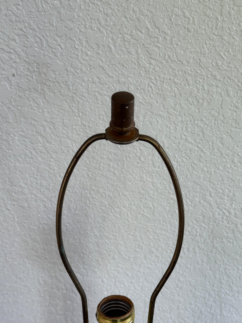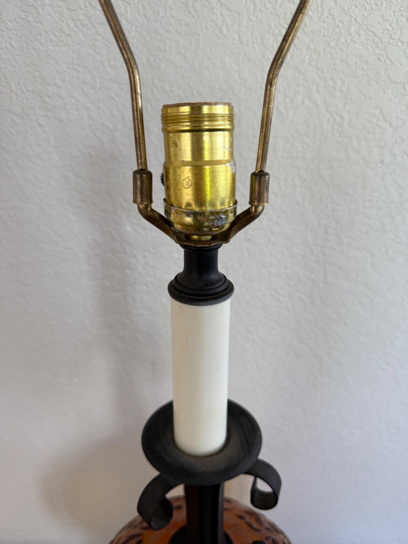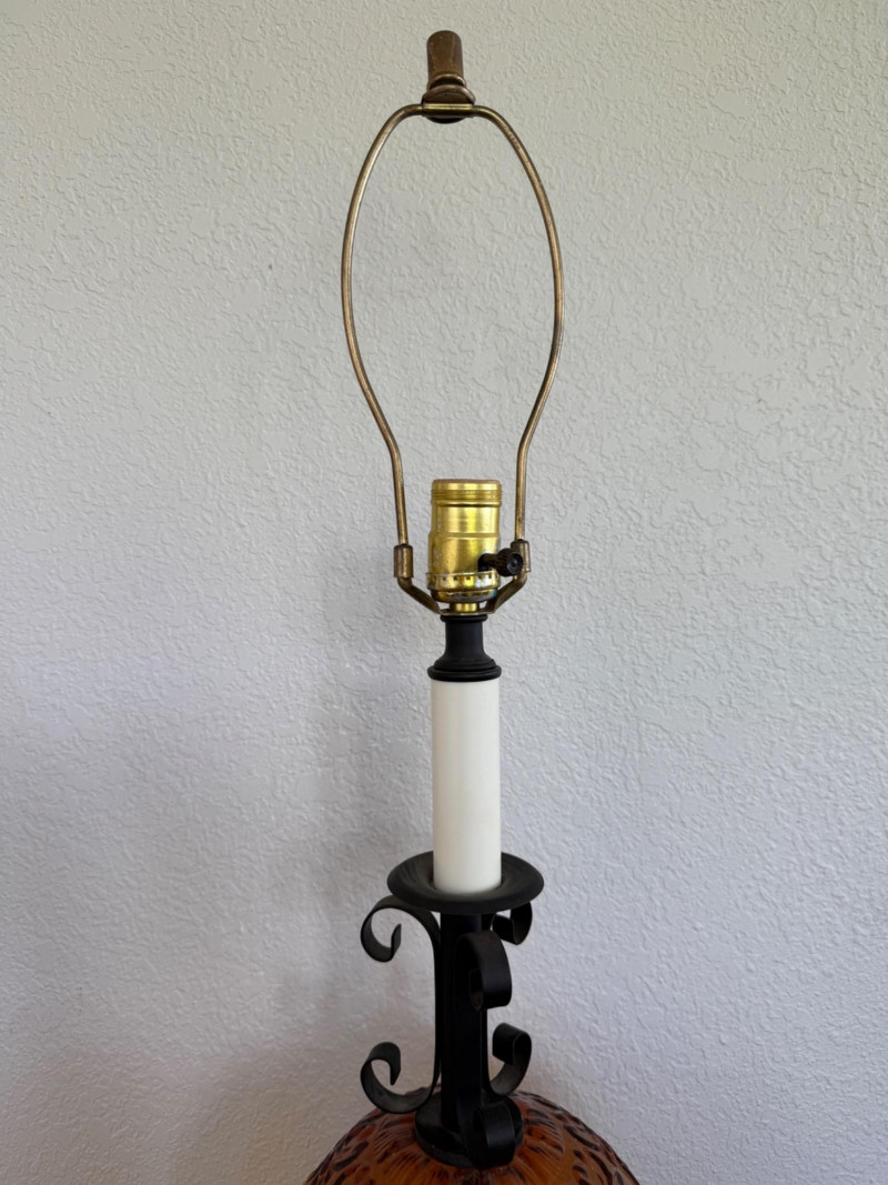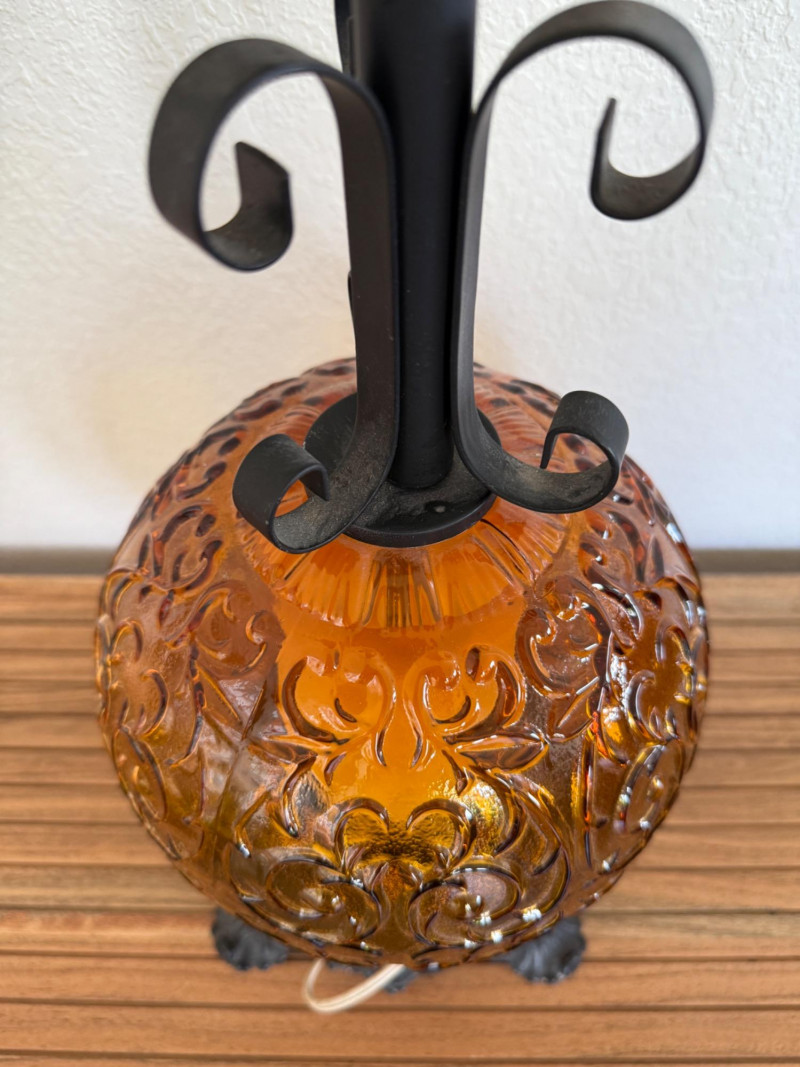Vintage 1970s Amber Glass Globe Table Lamp Vintage 1970s table lamp featuring a round amber glass globe with a raised scroll pattern. The lamp includes a dark metal base with ornate detailing, a vertical white stem, and black metal scrollwork supports. It has a brass socket, harp, and finial. Fitted with a two-prong plug and a fabric-wrapped cord. Dimensions: 30" tall x 8" wide. Note: Electrical wiring has not been tested on this item. Lamp kits can be found on Amazon for around $15.
