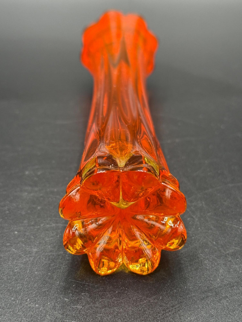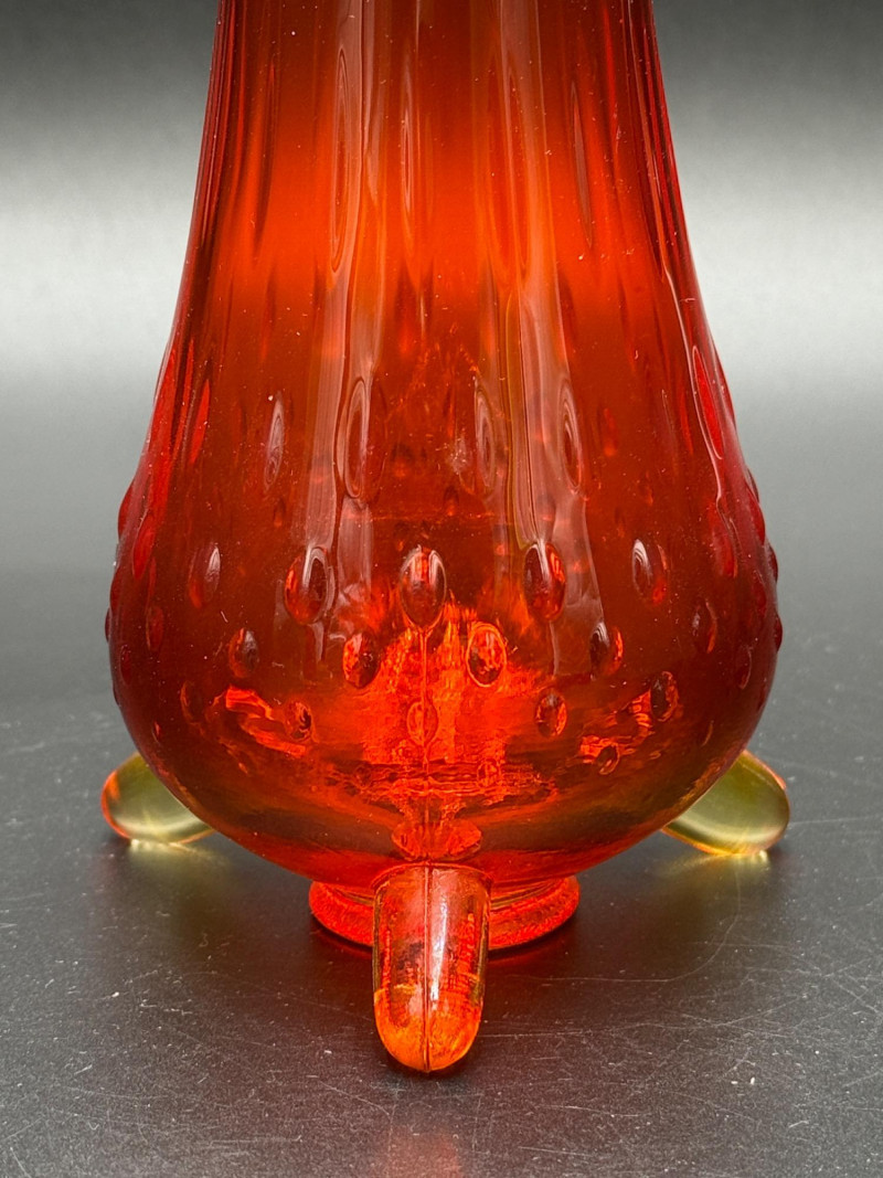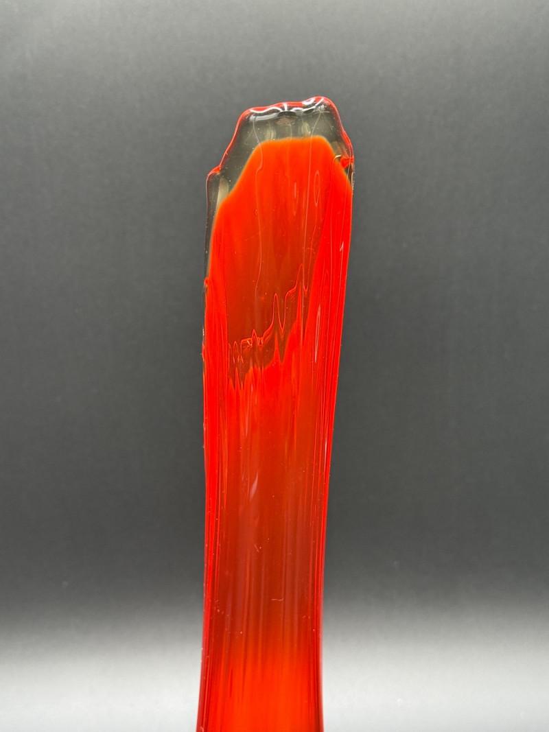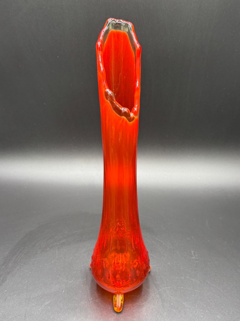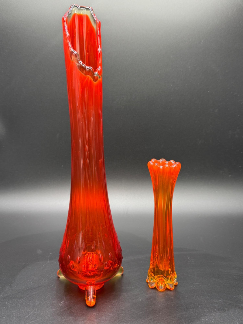 Amberina Swung Vases Pair of amberina swung vases with color transitioning from deep red to yellow-orange. The taller vase has a flared, irregular crimped top and stands on three clear glass feet. The smaller vase has a narrow neck with a uniform crimped rim and a flared base. Measurements: Approximately 6.25 in to 13.5 in tall.