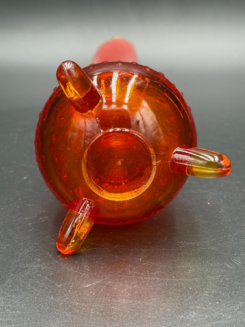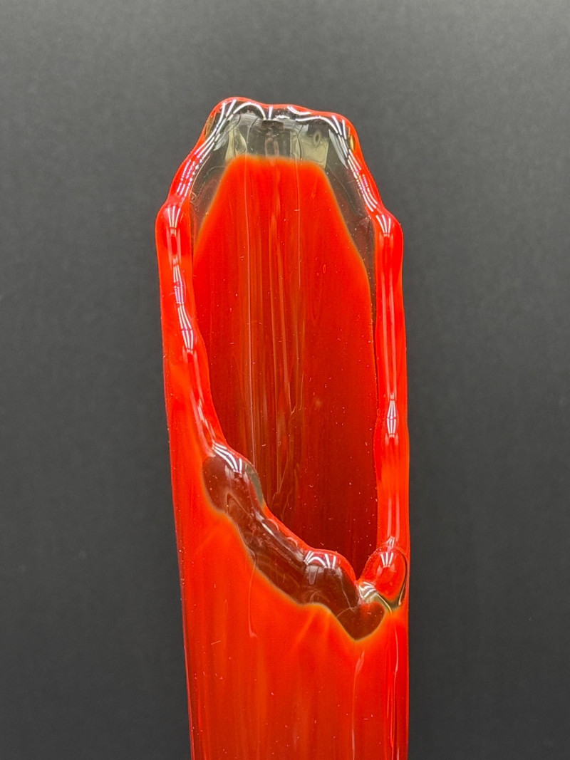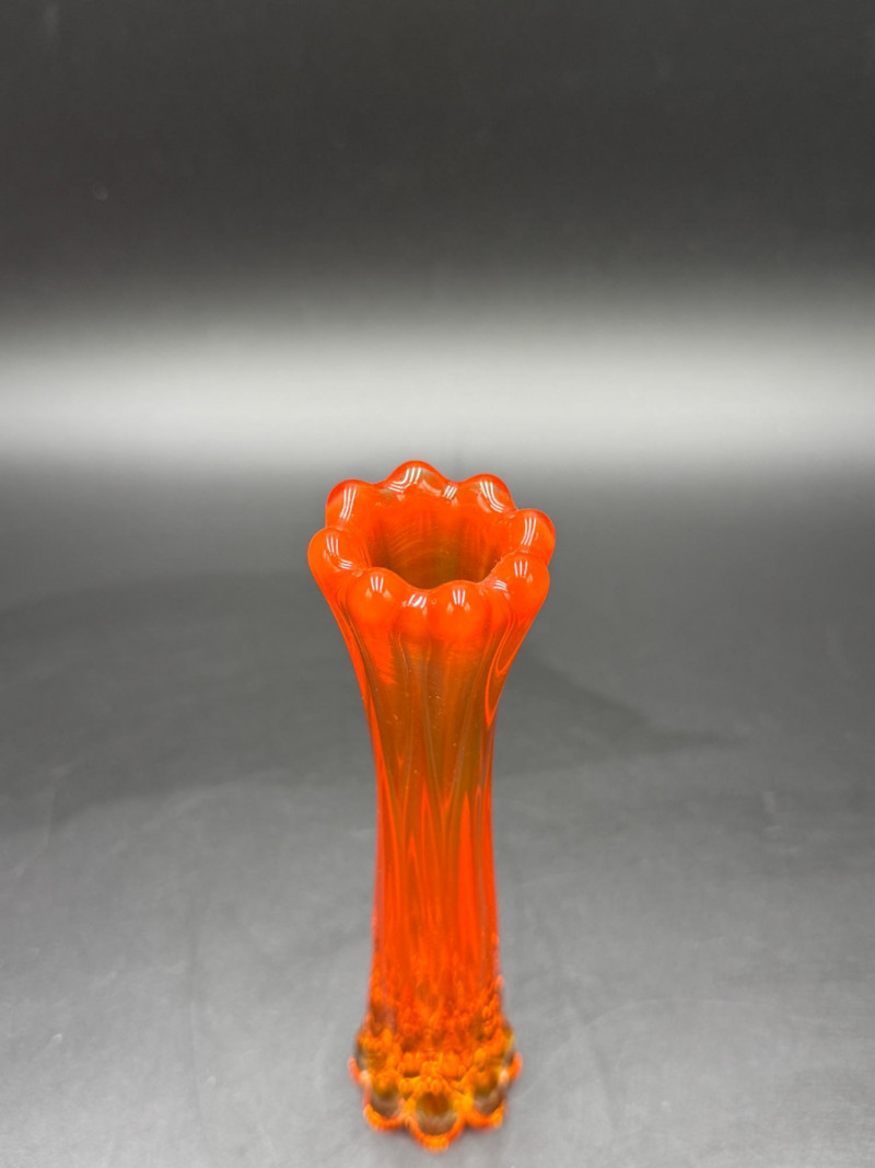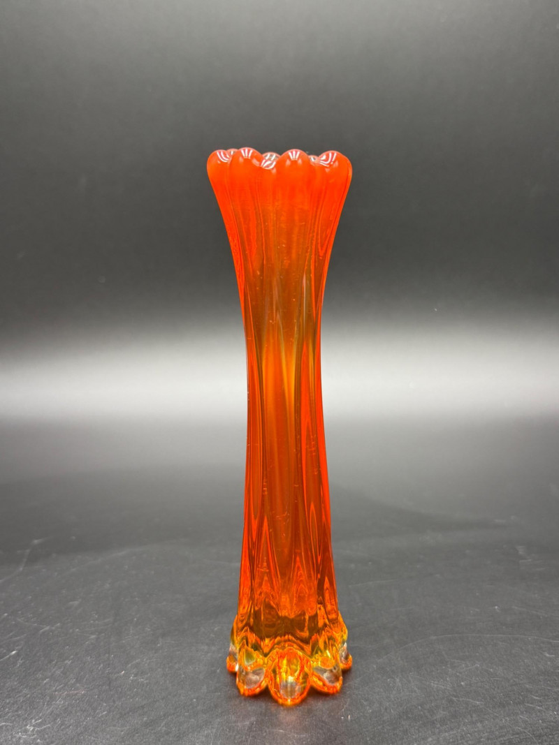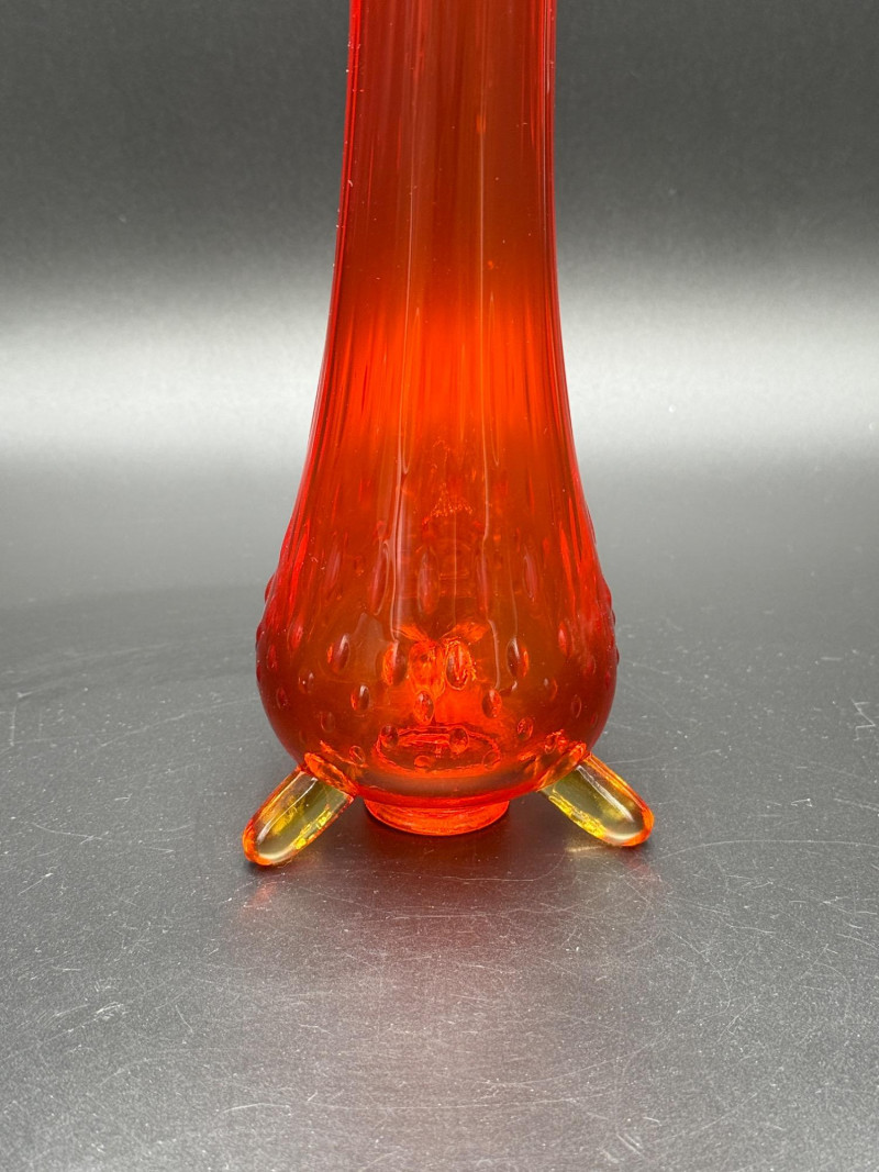 Amberina Swung Vases Pair of amberina swung vases with color transitioning from deep red to yellow-orange. The taller vase has a flared, irregular crimped top and stands on three clear glass feet. The smaller vase has a narrow neck with a uniform crimped rim and a flared base. Measurements: Approximately 6.25 in to 13.5 in tall.