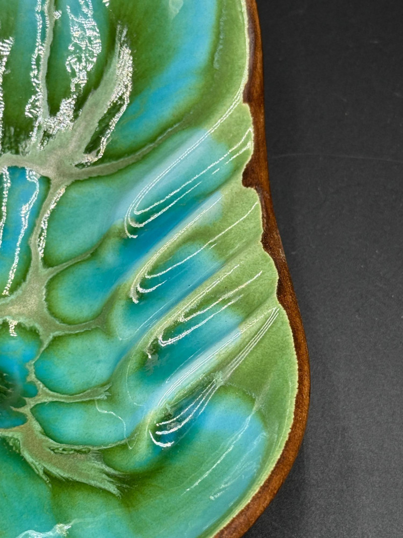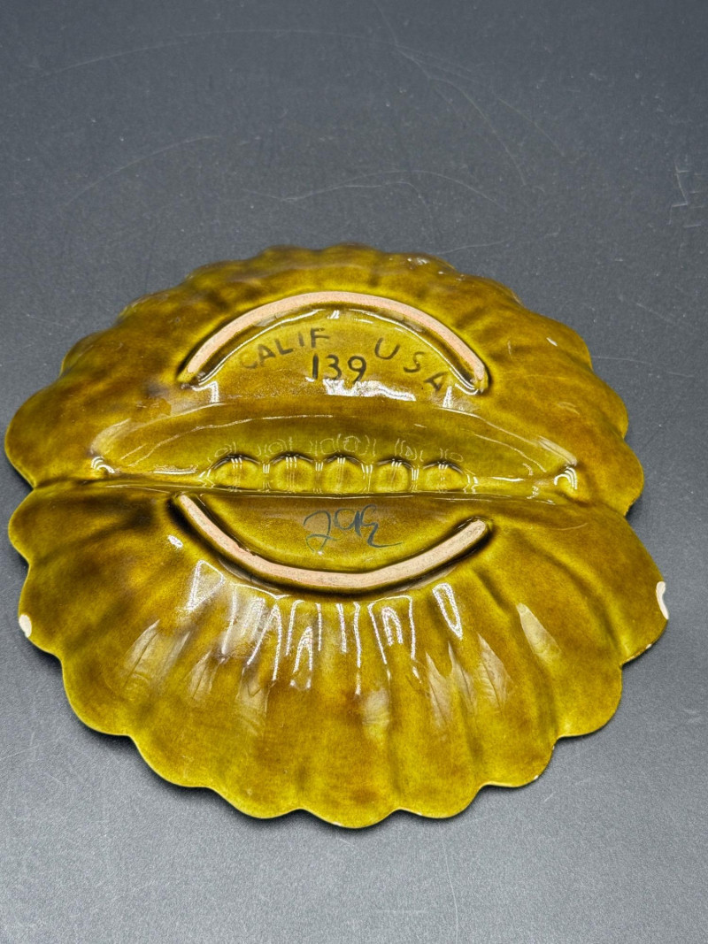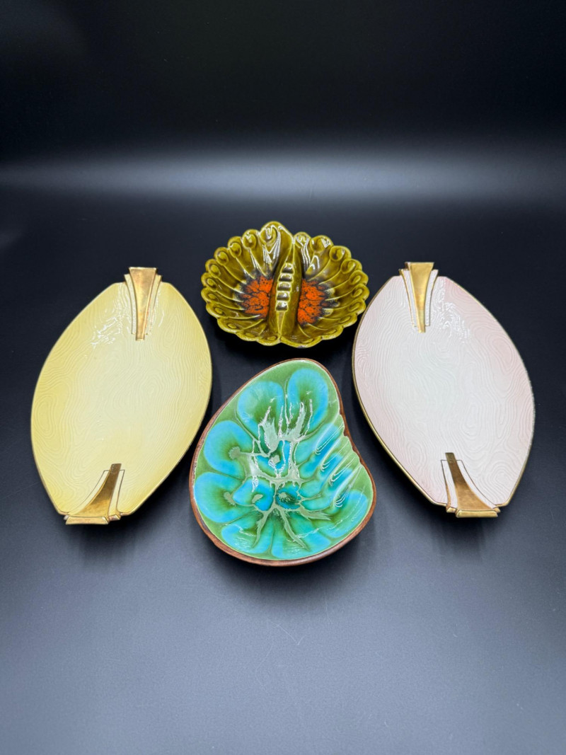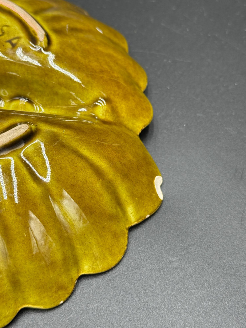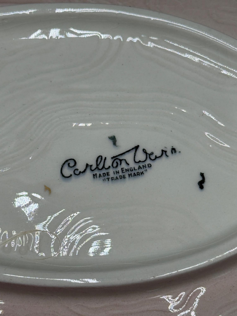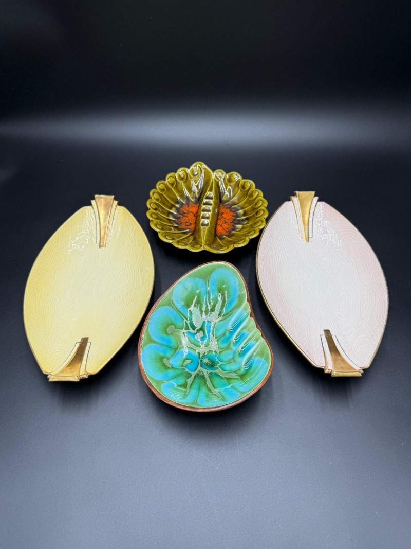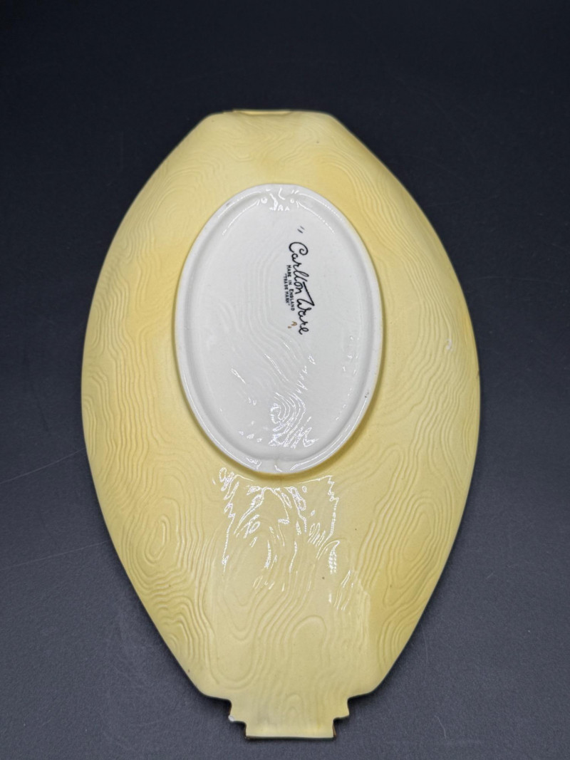 Carlton Ware and Treasure Craft Ceramic Plate Set A ceramic plate set consisting of five pieces. Two elongated plates marked "Carlton Ware, Made in England," feature woodgrain-textured surfaces and attached metal holders; one is yellow and the other is pink. One green plate has a lobed leaf form with an orange butterfly at the center. One shallow round plate has an abstract green glaze pattern with a brown underside. The fifth piece, a brown textured plate with raised feet, is marked “Treasure Craft 1963, Made in U.S.A.” on the bottom. Measurements: Yellow and Pink Plates: 6 x 10.5 in Green Leaf Plate: 7 x 5.5 x 2 in Orange/Brown Plate: 7 x 1.5 in