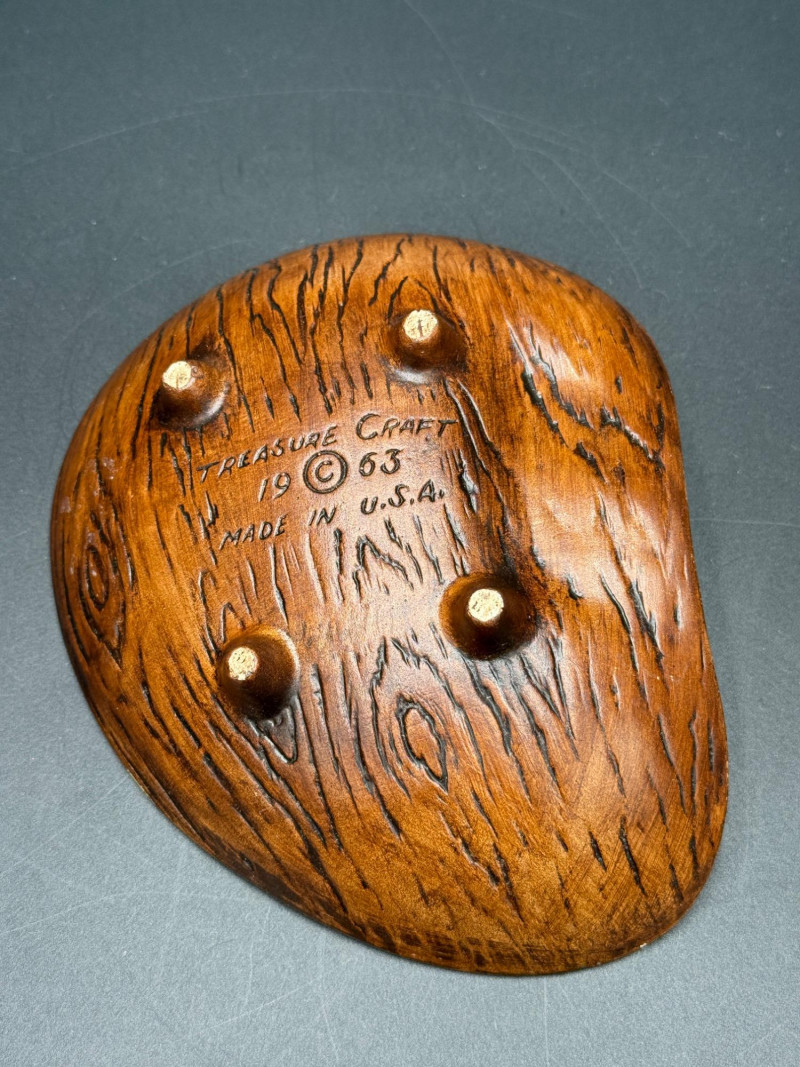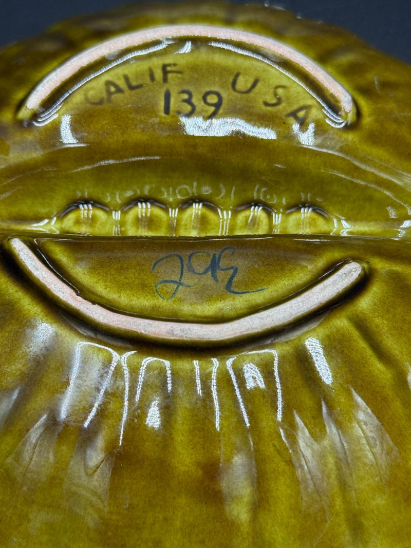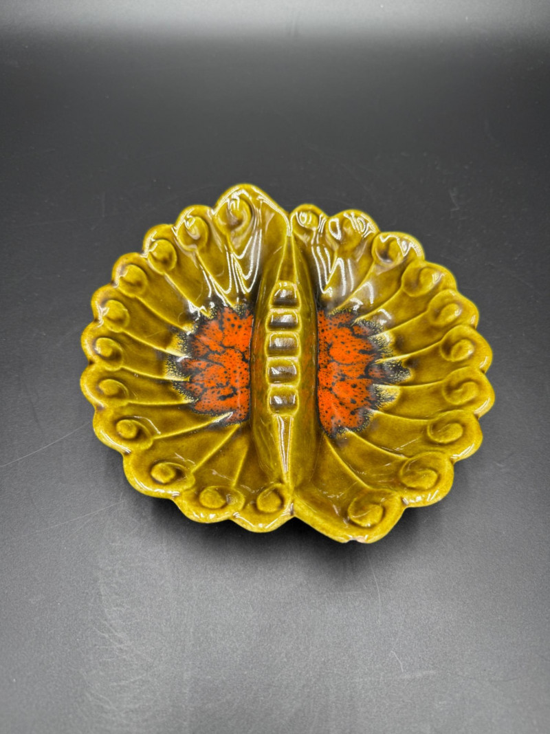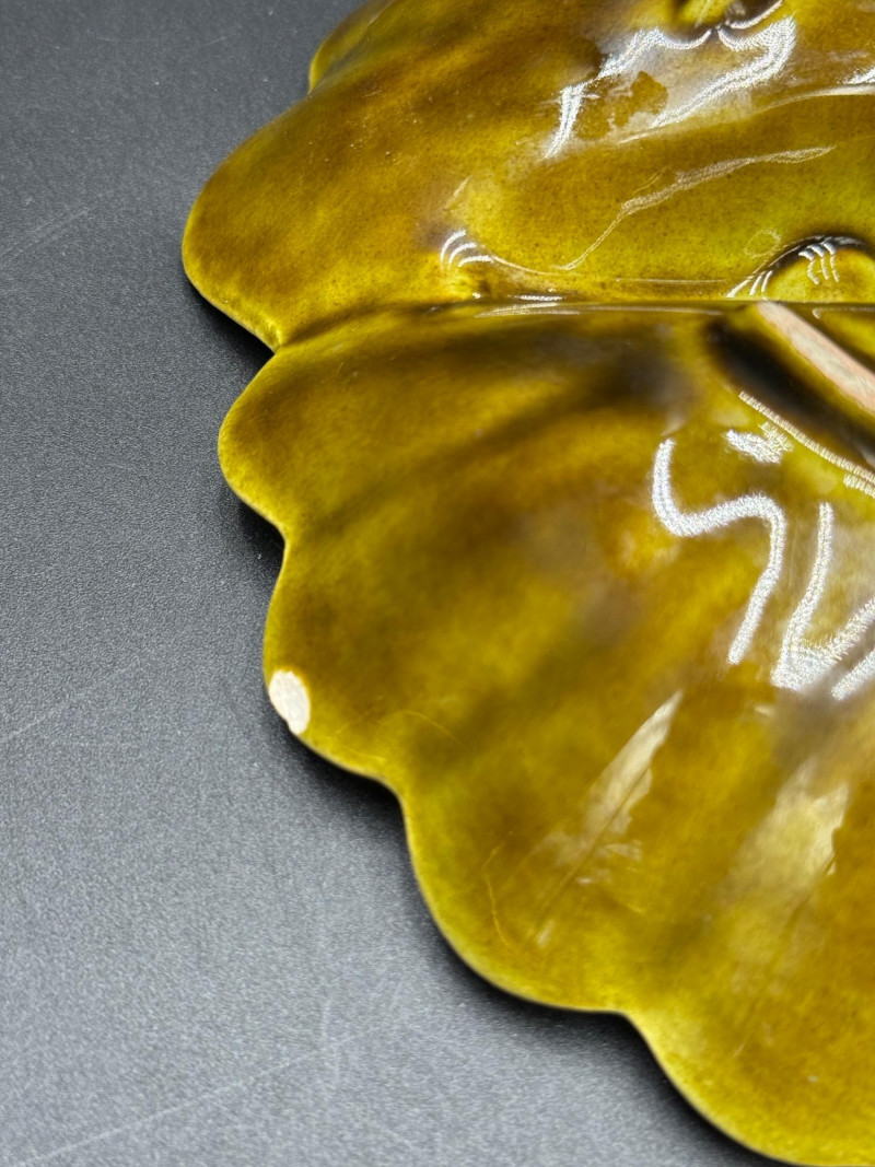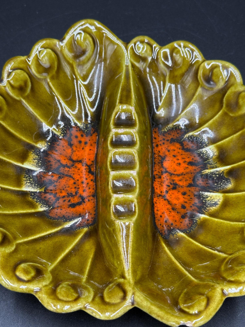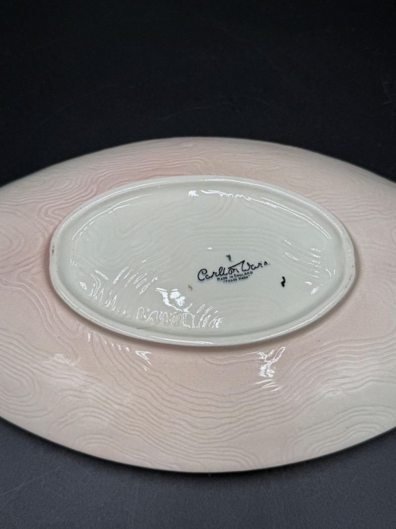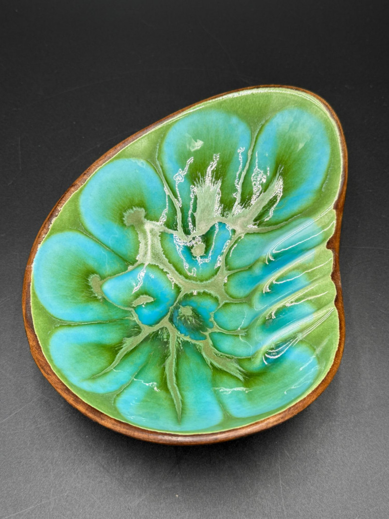 Carlton Ware and Treasure Craft Ceramic Plate Set A ceramic plate set consisting of five pieces. Two elongated plates marked "Carlton Ware, Made in England," feature woodgrain-textured surfaces and attached metal holders; one is yellow and the other is pink. One green plate has a lobed leaf form with an orange butterfly at the center. One shallow round plate has an abstract green glaze pattern with a brown underside. The fifth piece, a brown textured plate with raised feet, is marked “Treasure Craft 1963, Made in U.S.A.” on the bottom. Measurements: Yellow and Pink Plates: 6 x 10.5 in Green Leaf Plate: 7 x 5.5 x 2 in Orange/Brown Plate: 7 x 1.5 in