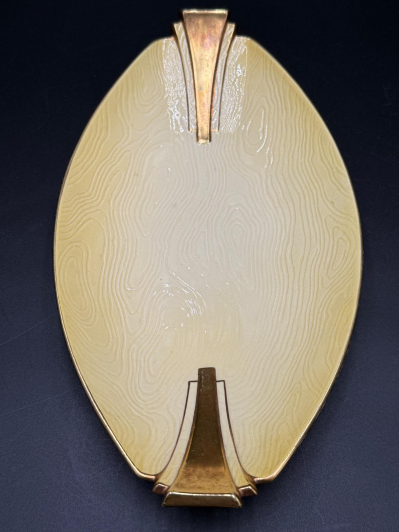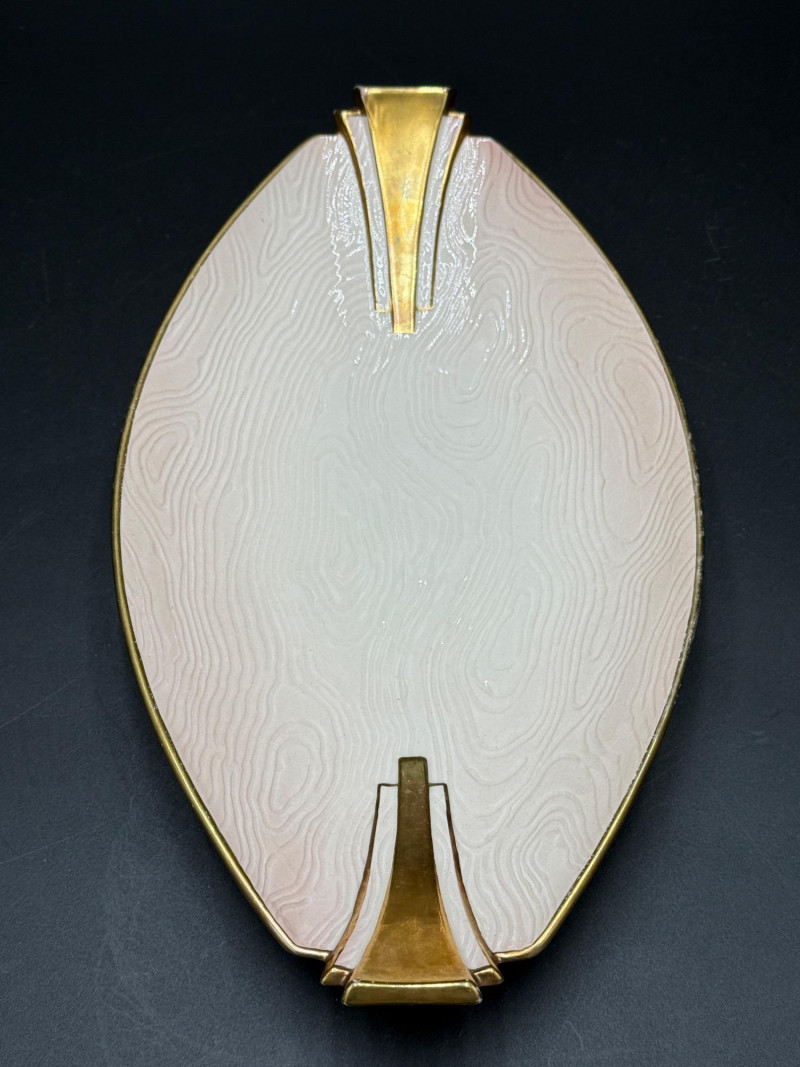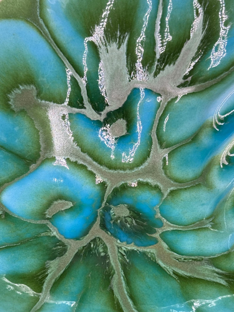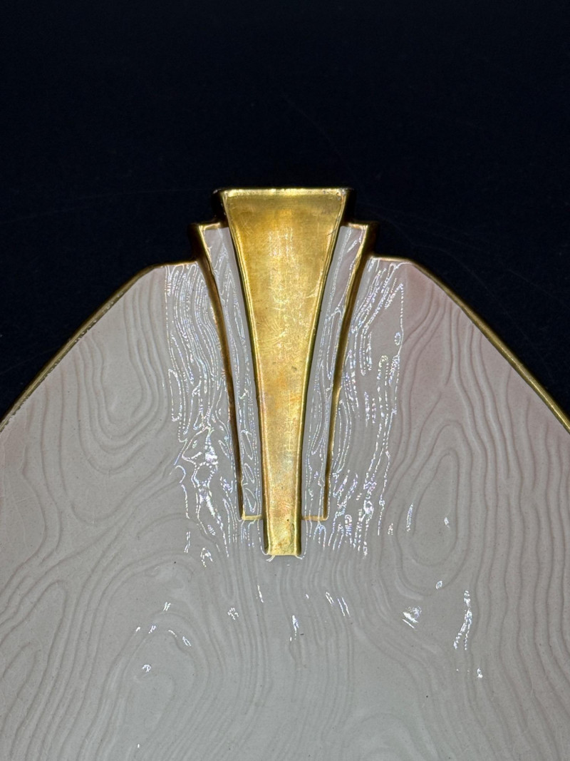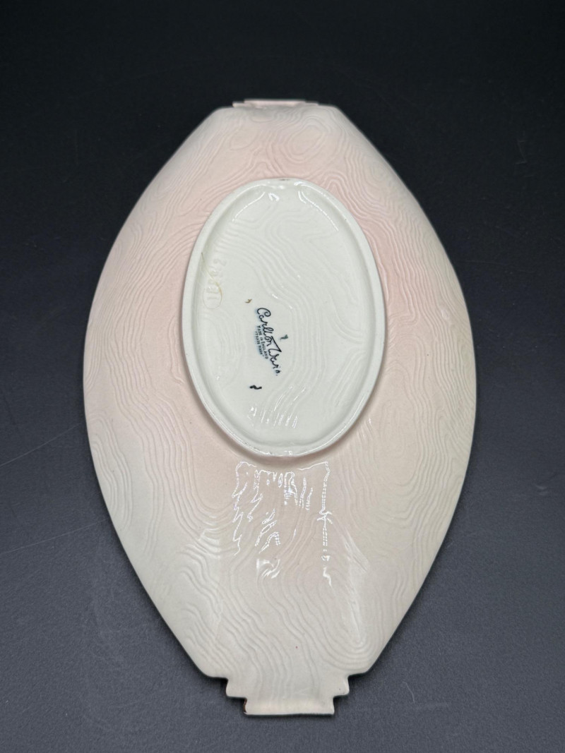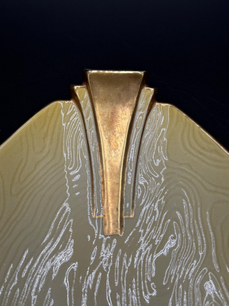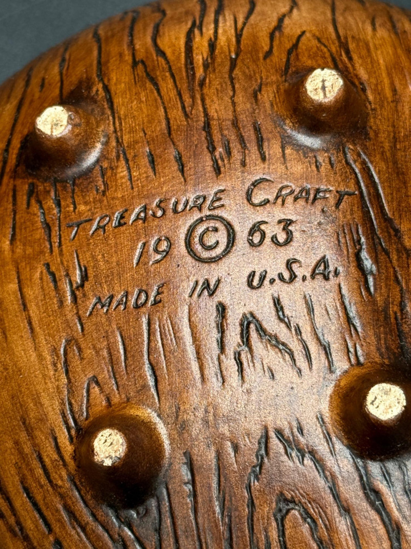 Carlton Ware and Treasure Craft Ceramic Plate Set A ceramic plate set consisting of five pieces. Two elongated plates marked "Carlton Ware, Made in England," feature woodgrain-textured surfaces and attached metal holders; one is yellow and the other is pink. One green plate has a lobed leaf form with an orange butterfly at the center. One shallow round plate has an abstract green glaze pattern with a brown underside. The fifth piece, a brown textured plate with raised feet, is marked “Treasure Craft 1963, Made in U.S.A.” on the bottom. Measurements: Yellow and Pink Plates: 6 x 10.5 in Green Leaf Plate: 7 x 5.5 x 2 in Orange/Brown Plate: 7 x 1.5 in