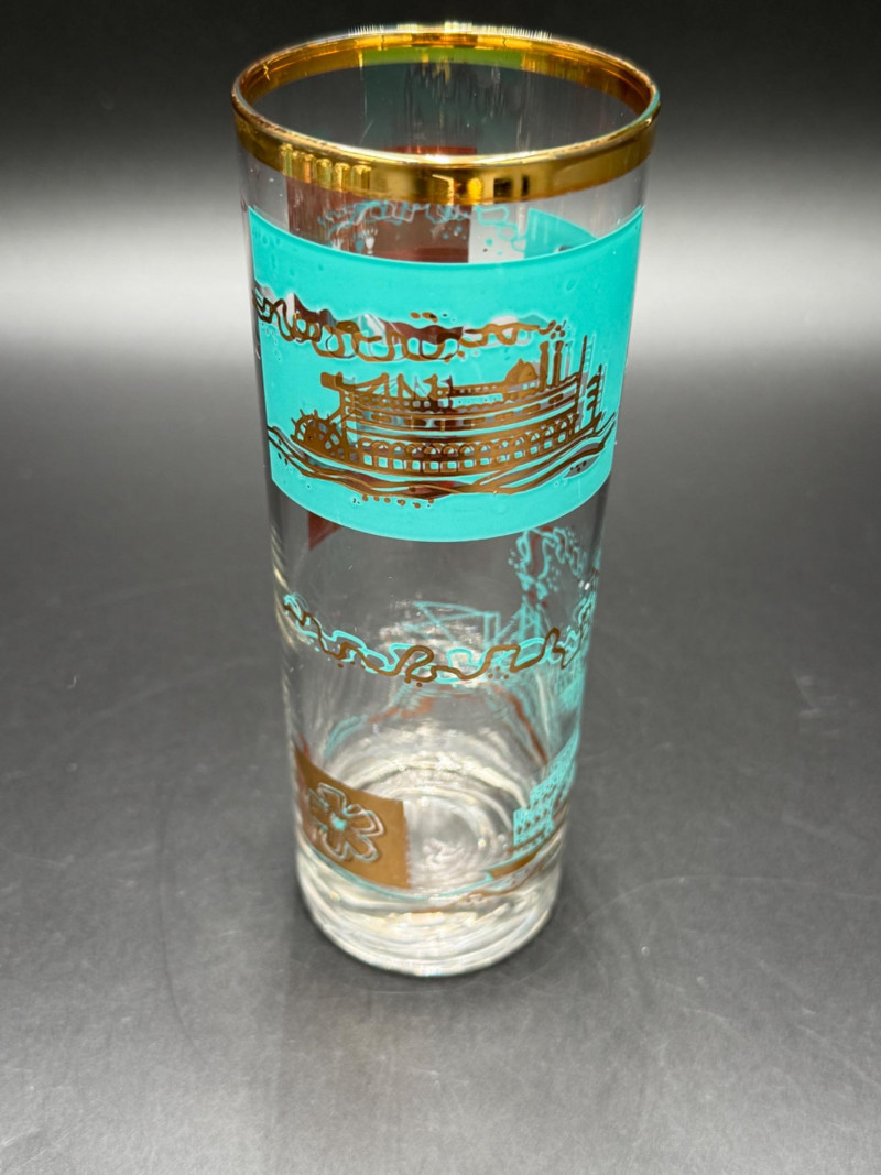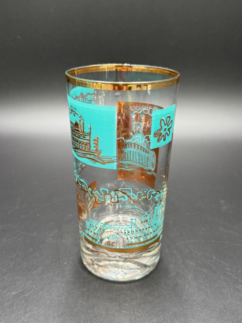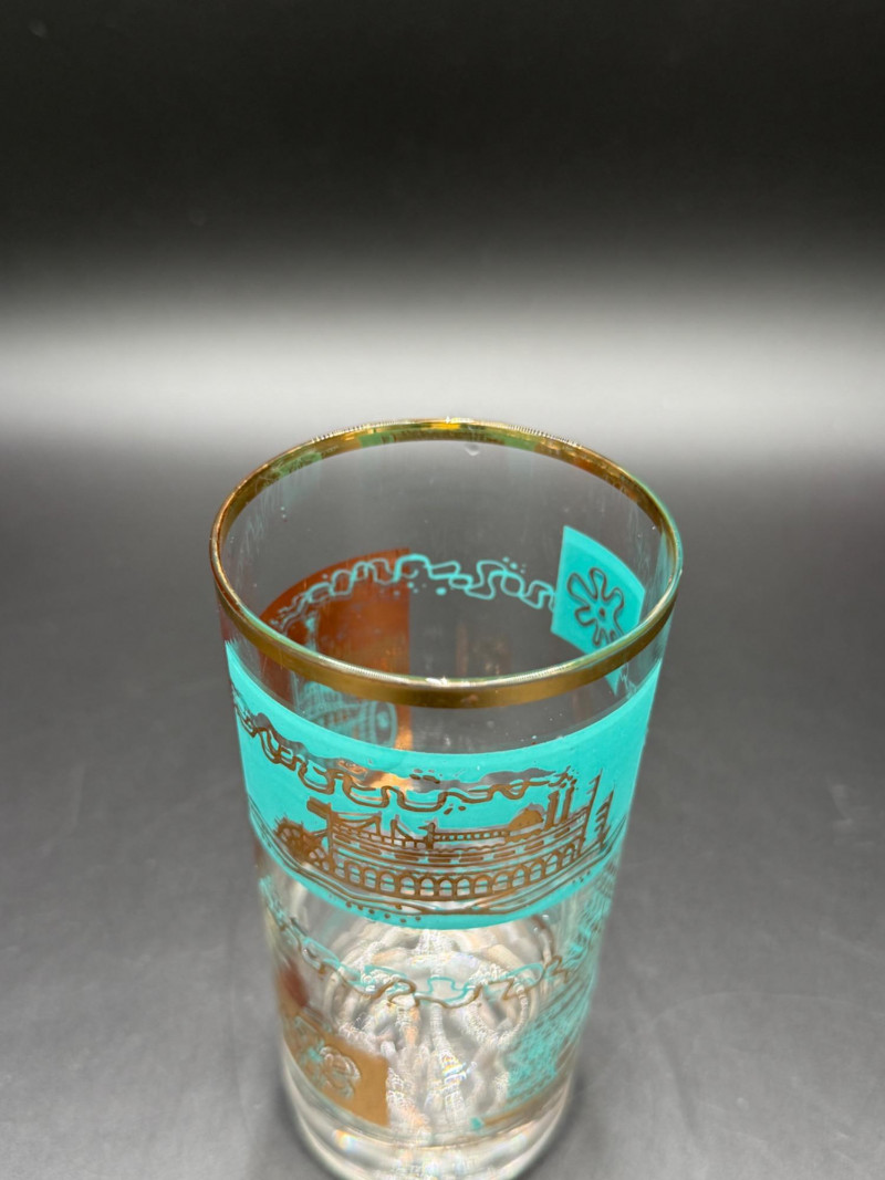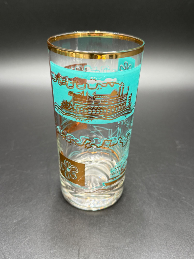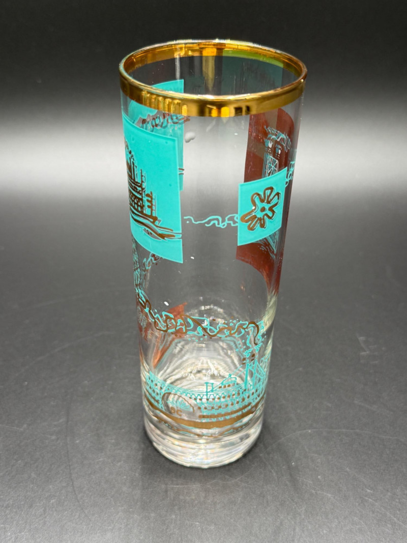 Libbey Riverboat Glass Set of 12 Set of twelve vintage Libbey drinking glasses with printed riverboat and architectural landmark scenes in turquoise and gold. The design wraps around each glass and includes stylized buildings, bridges, and steamboats, along with decorative scrollwork and floral elements. Each glass is trimmed with a gold band around the rim. Measurements: 8 tall glasses, each approximately 2.5 x 6.75 inches 4 small glasses, each approximately 3 x 5.5 inches