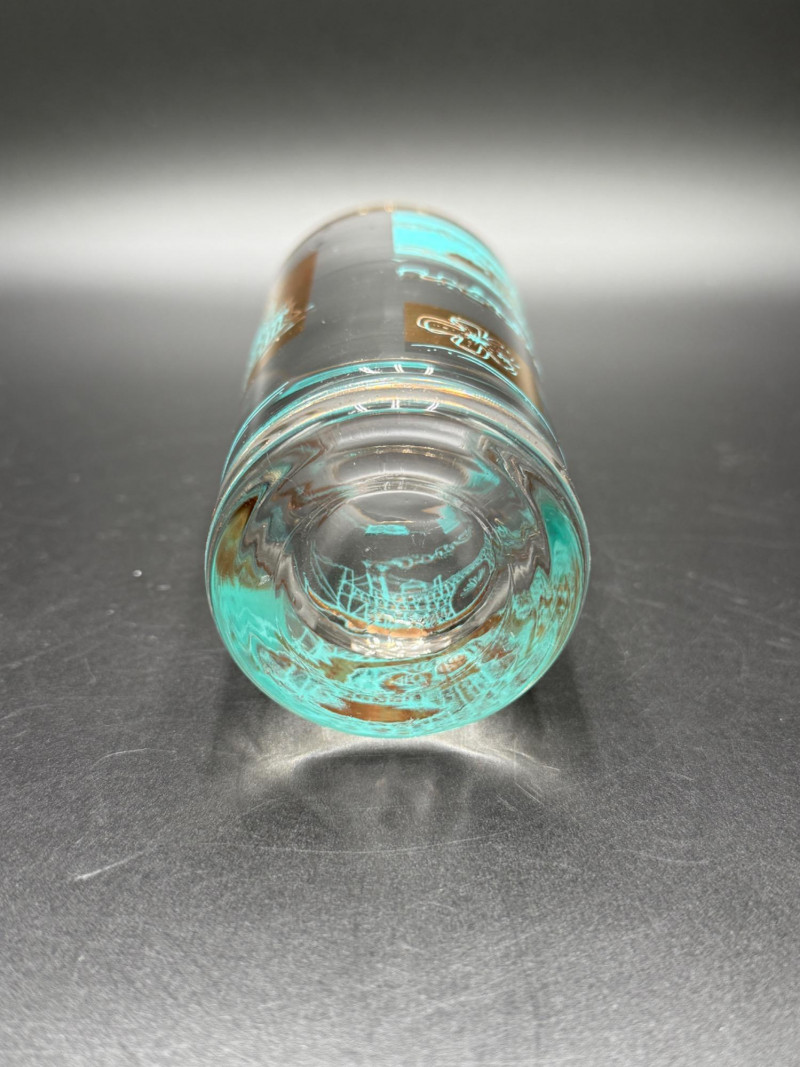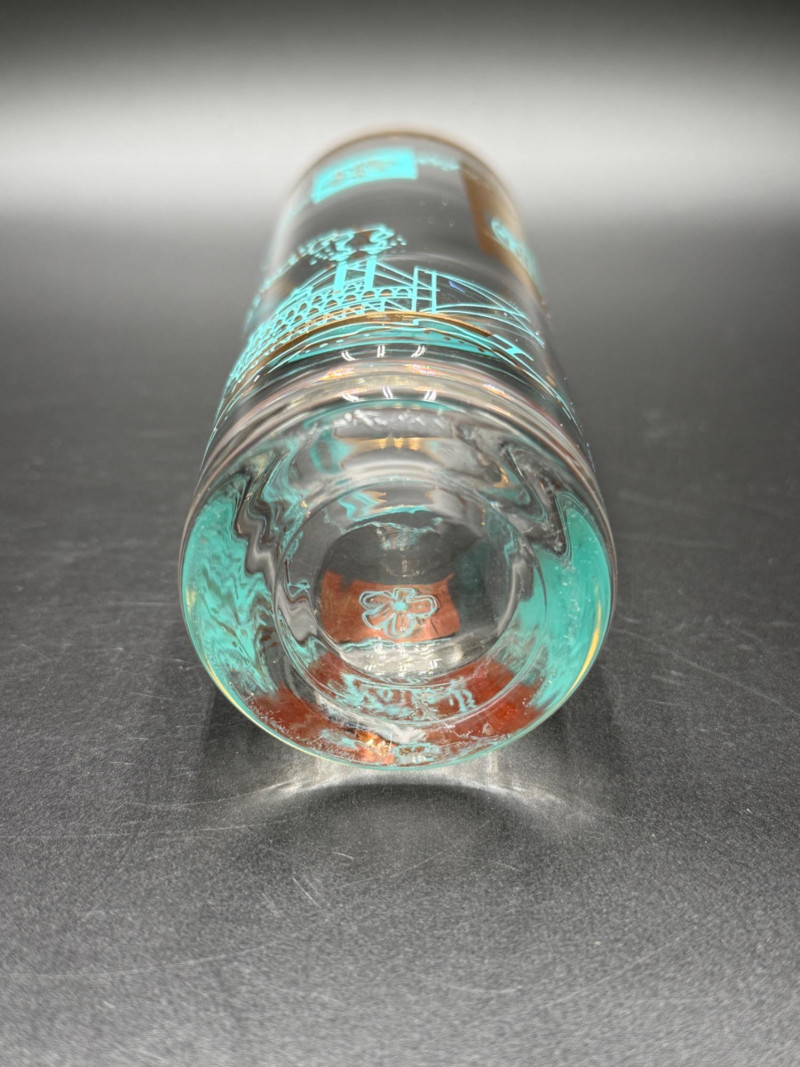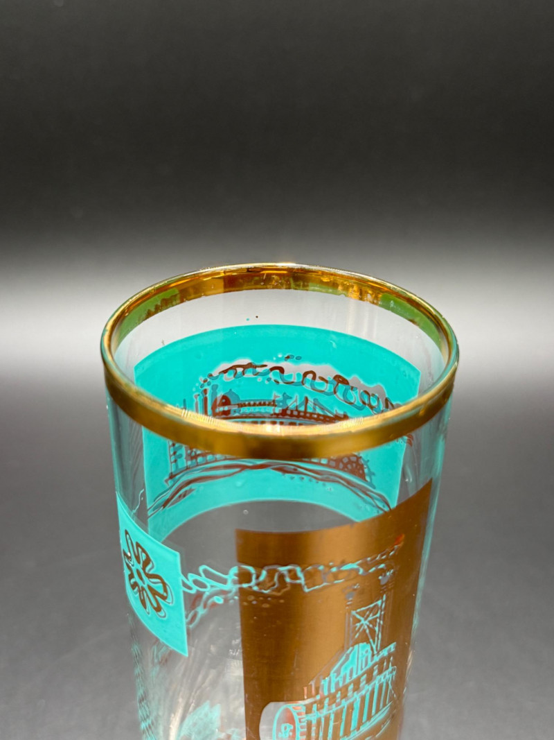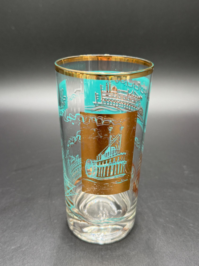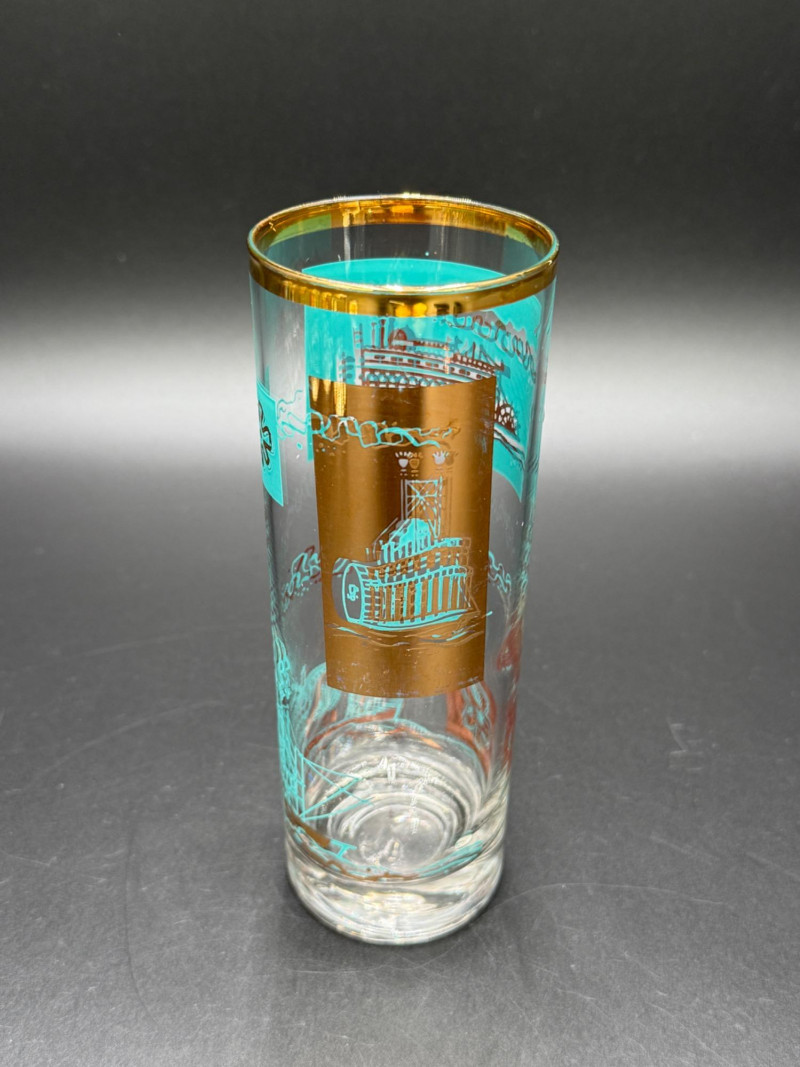 Libbey Riverboat Glass Set of 12 Set of twelve vintage Libbey drinking glasses with printed riverboat and architectural landmark scenes in turquoise and gold. The design wraps around each glass and includes stylized buildings, bridges, and steamboats, along with decorative scrollwork and floral elements. Each glass is trimmed with a gold band around the rim. Measurements: 8 tall glasses, each approximately 2.5 x 6.75 inches 4 small glasses, each approximately 3 x 5.5 inches