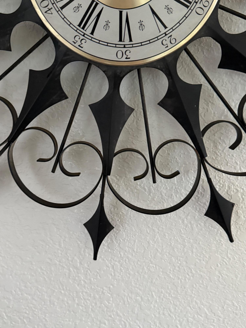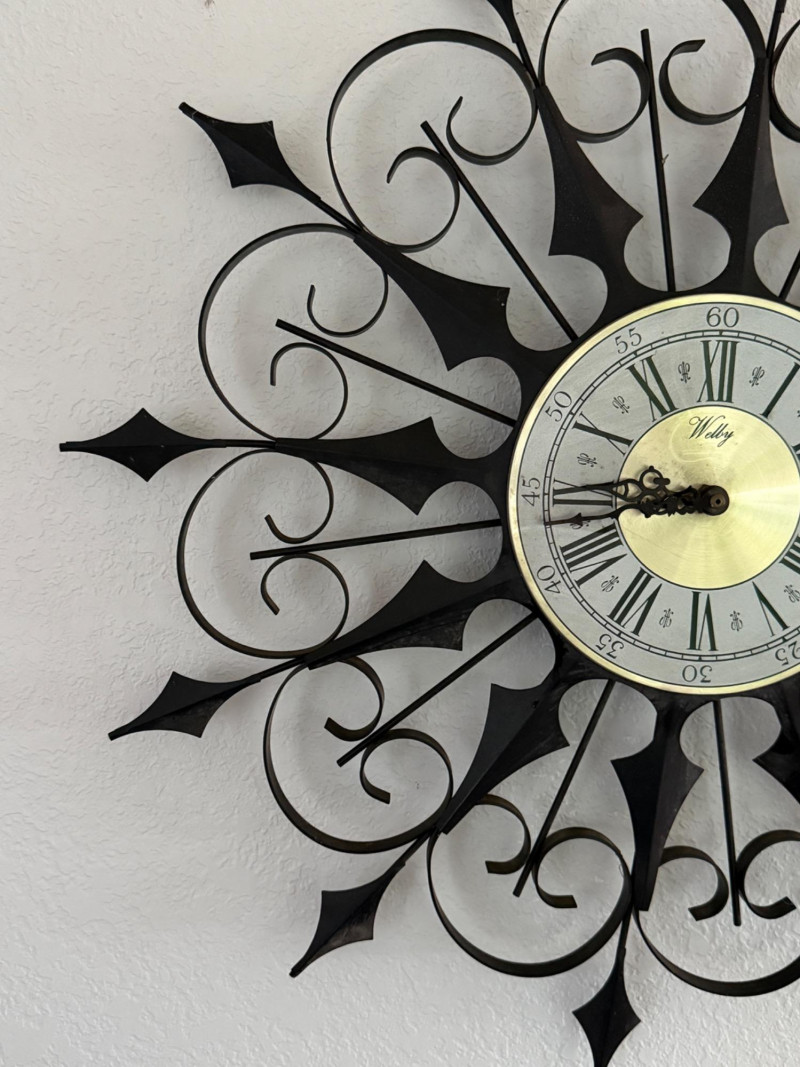 Metal wall clock with radial scrollwork frame in a symmetrical sunburst pattern. The face features Roman numerals on an outer white ring with black markings and an inner brass-toned center marked "Welby." The hands are black with decorative shapes. Battery compartment is located at the back, showing a single AA slot. Mounting hardware is integrated into the back. The frame is constructed from black metal with pointed and curled elements.