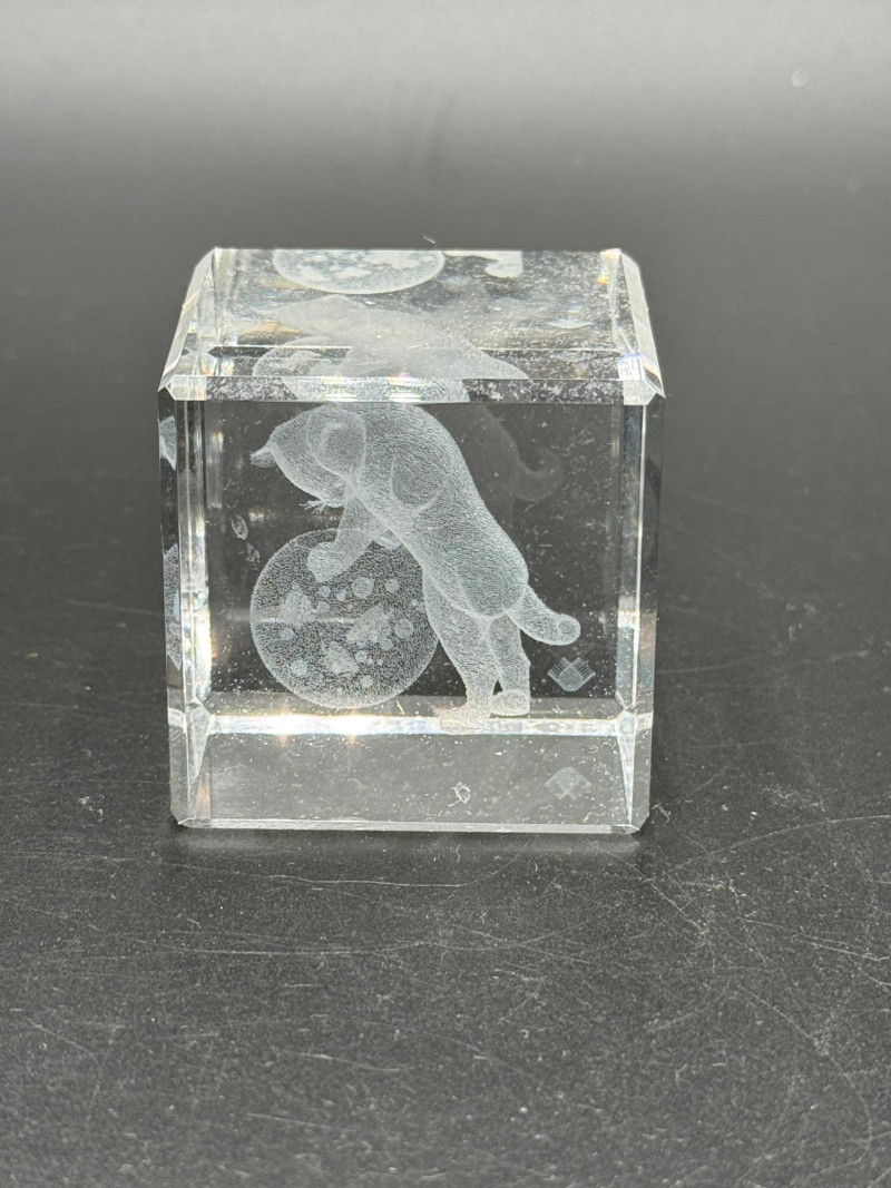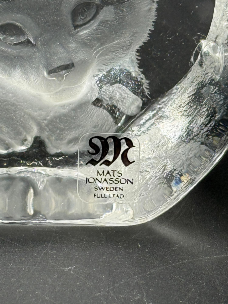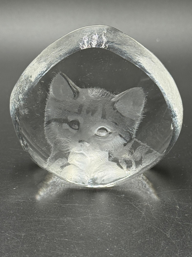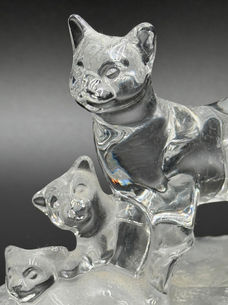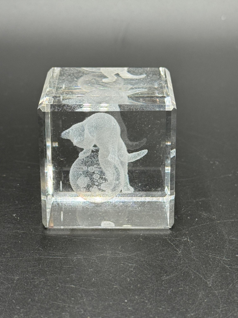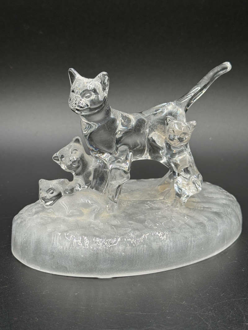 Crystal Glass Cat Figurines– 4 Pieces Seated Cat Figurine: Solid clear glass with defined facial features and upright pose. Mounted on a geometric base. Likely Cristal Durand, France. Cat and Kittens Group: A mother cat walking with three kittens on a frosted oval base. Molded in one piece with smooth surface detailing. Etched Cat Face Paperweight: Flat-bottomed with a rounded triangular front. Deeply etched cat face on the back surface. Marked "Mats Jonasson Sweden Full Lead Crystal." 3D Glass Cube with Cat: Rectangular glass block with a 3D laser-etched cat playing with a ball inside. Smooth beveled edges. Measurements: Approximately 2 to 4 inches