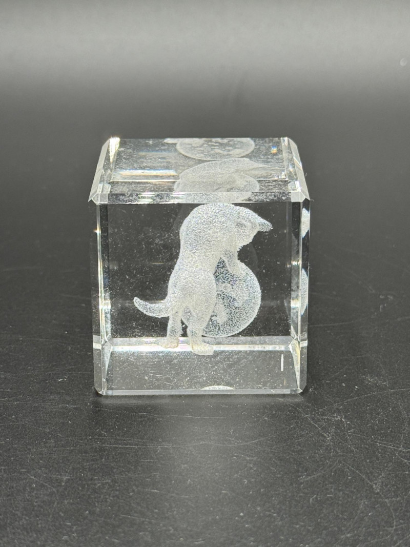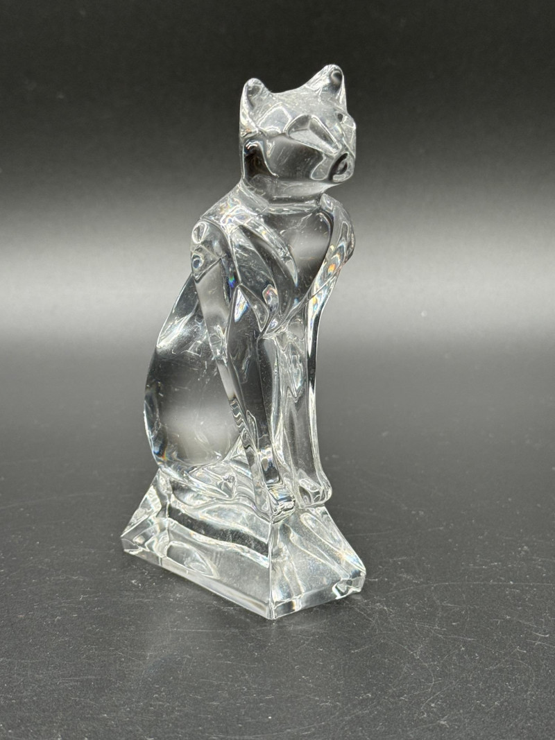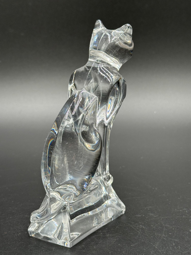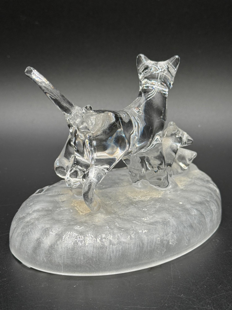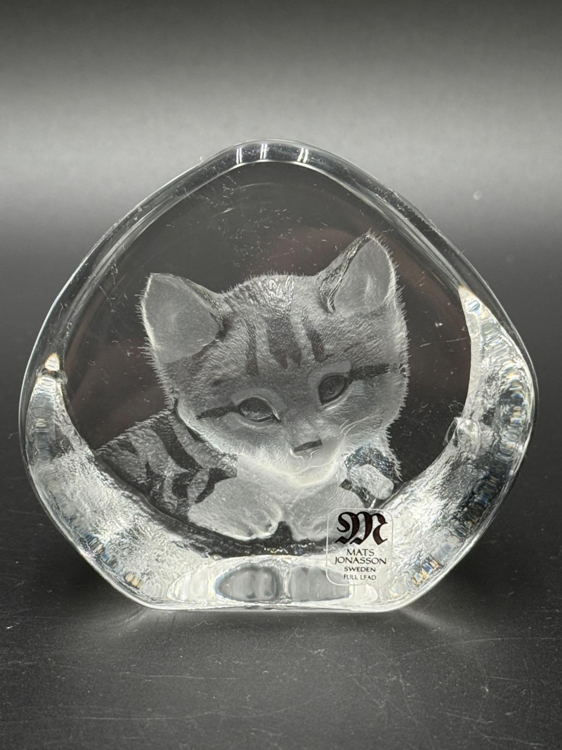 Crystal Glass Cat Figurines– 4 Pieces Seated Cat Figurine: Solid clear glass with defined facial features and upright pose. Mounted on a geometric base. Likely Cristal Durand, France. Cat and Kittens Group: A mother cat walking with three kittens on a frosted oval base. Molded in one piece with smooth surface detailing. Etched Cat Face Paperweight: Flat-bottomed with a rounded triangular front. Deeply etched cat face on the back surface. Marked "Mats Jonasson Sweden Full Lead Crystal." 3D Glass Cube with Cat: Rectangular glass block with a 3D laser-etched cat playing with a ball inside. Smooth beveled edges. Measurements: Approximately 2 to 4 inches