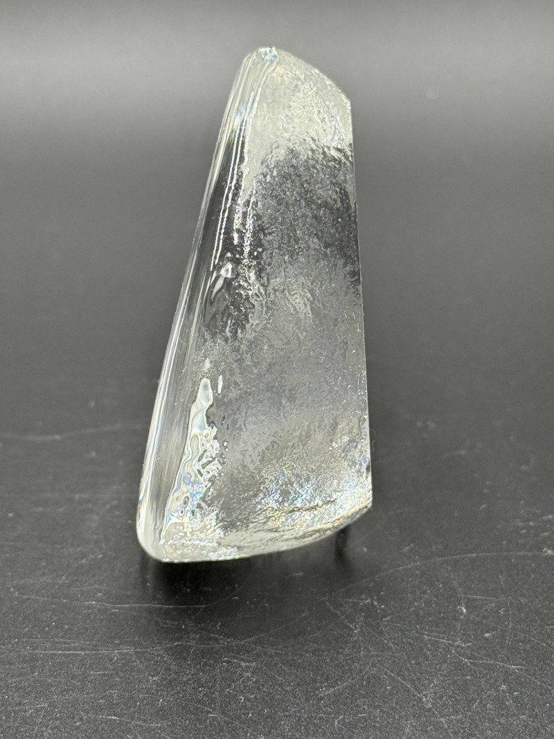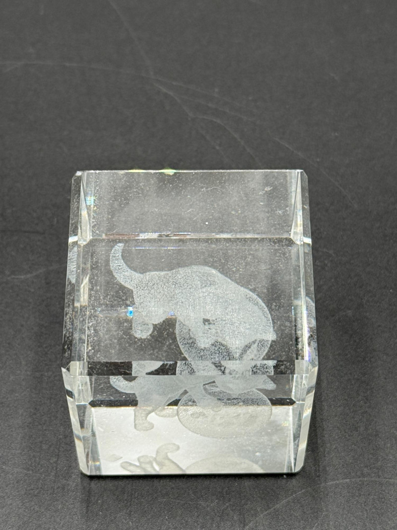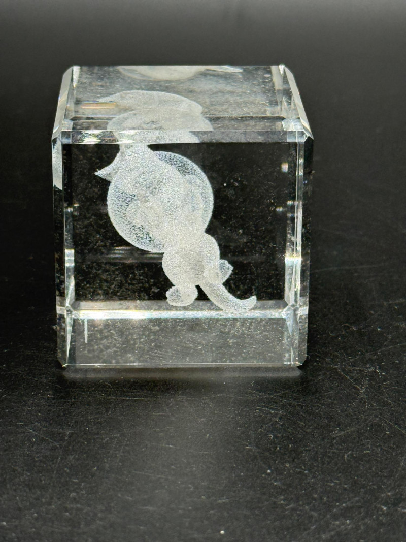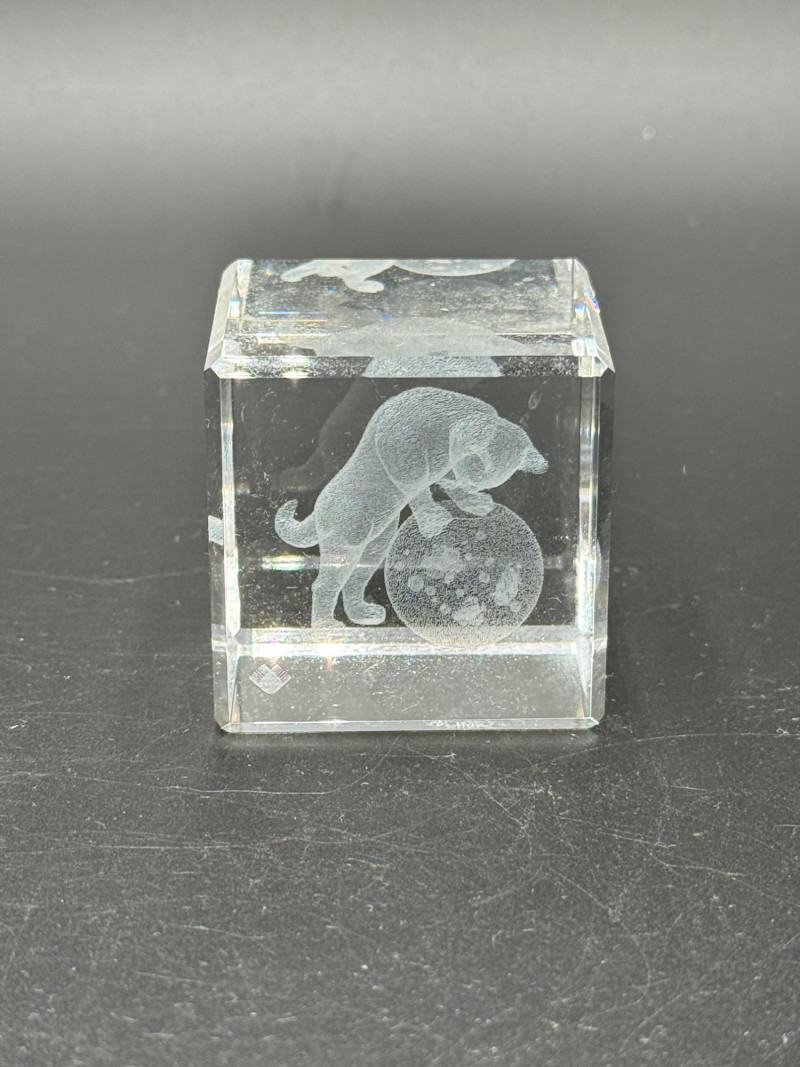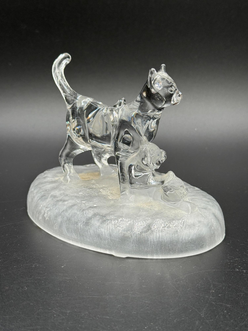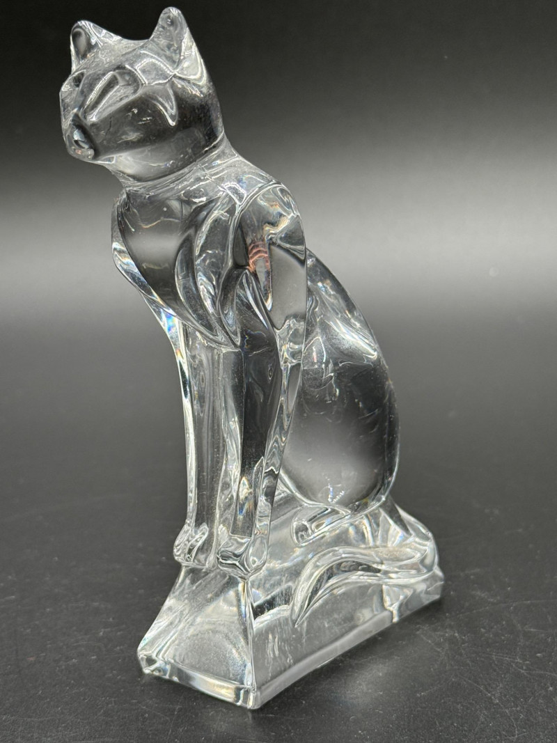 Crystal Glass Cat Figurines– 4 Pieces Seated Cat Figurine: Solid clear glass with defined facial features and upright pose. Mounted on a geometric base. Likely Cristal Durand, France. Cat and Kittens Group: A mother cat walking with three kittens on a frosted oval base. Molded in one piece with smooth surface detailing. Etched Cat Face Paperweight: Flat-bottomed with a rounded triangular front. Deeply etched cat face on the back surface. Marked "Mats Jonasson Sweden Full Lead Crystal." 3D Glass Cube with Cat: Rectangular glass block with a 3D laser-etched cat playing with a ball inside. Smooth beveled edges. Measurements: Approximately 2 to 4 inches
