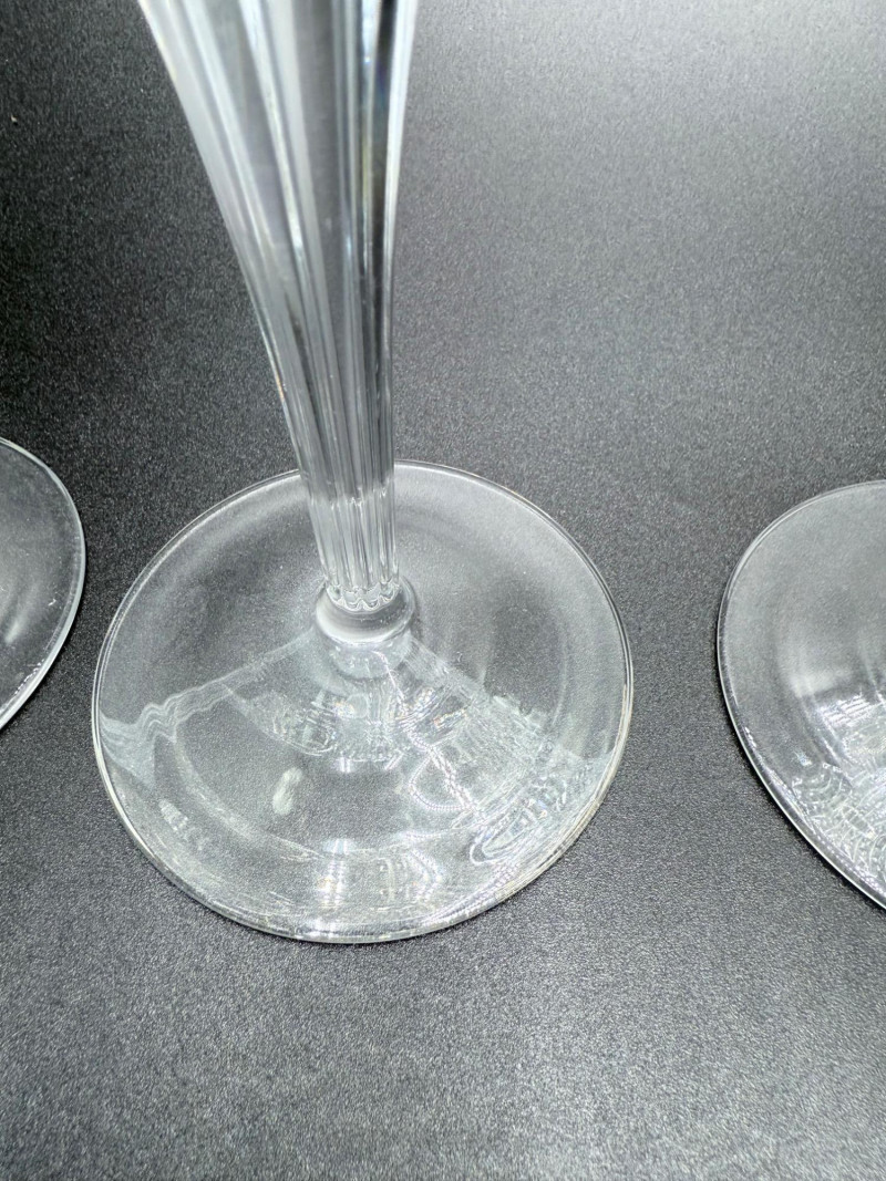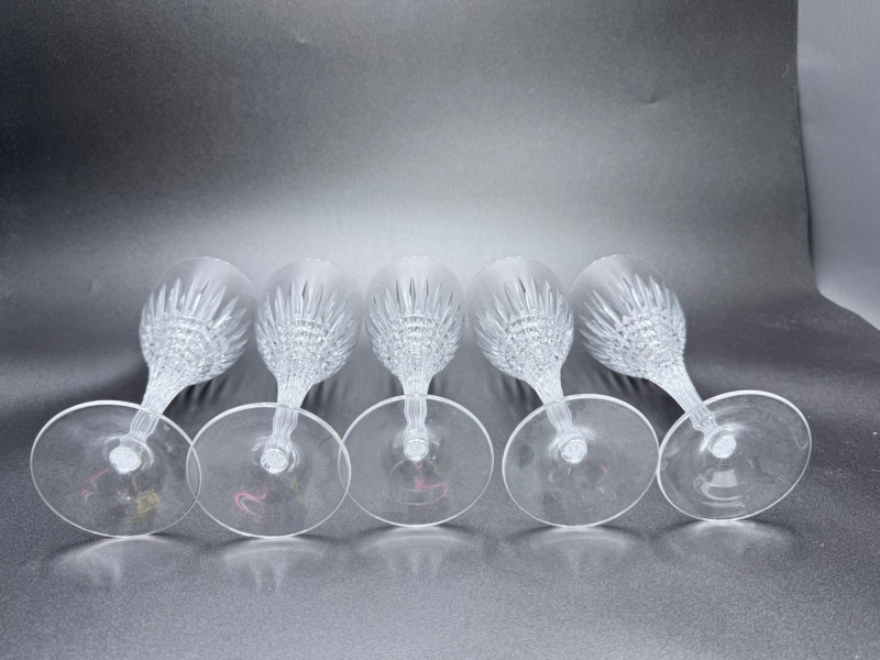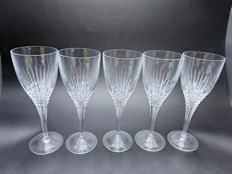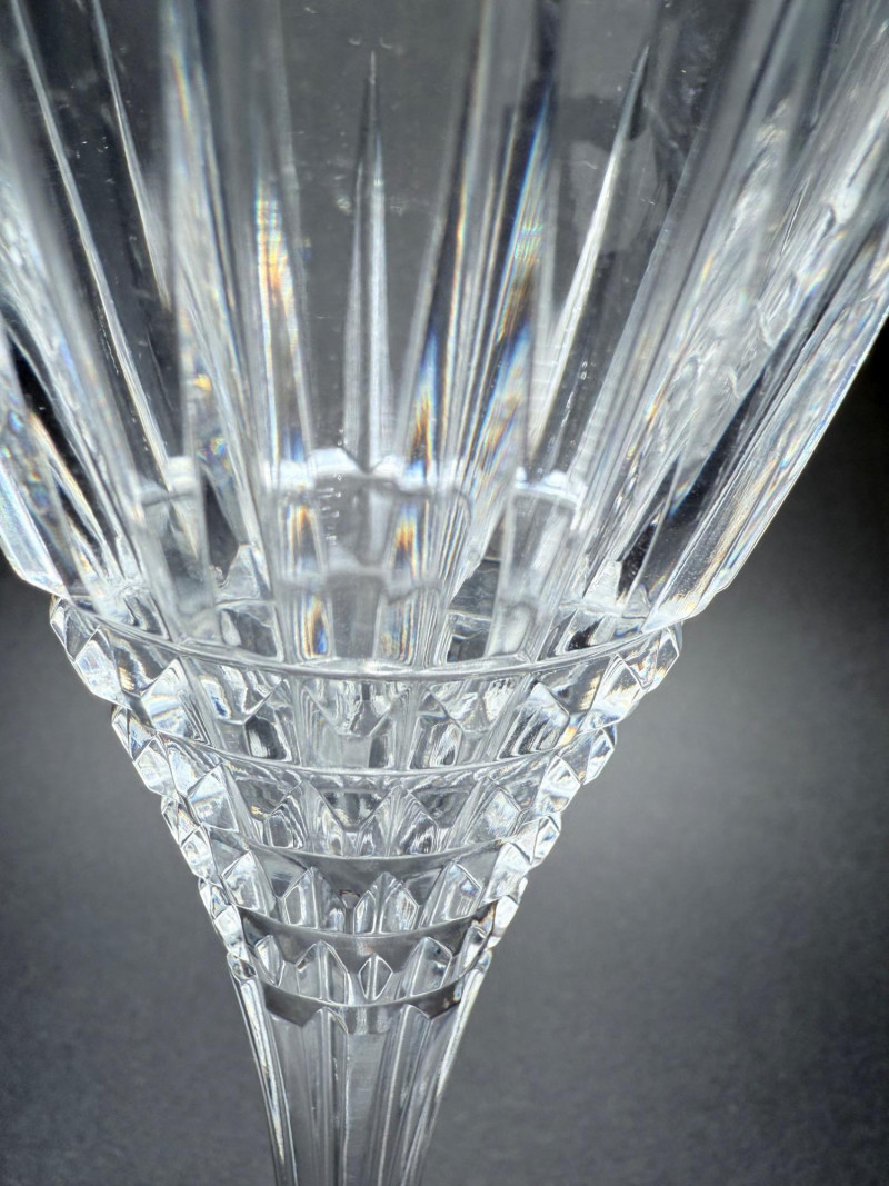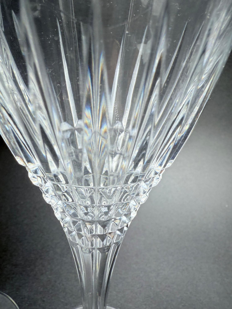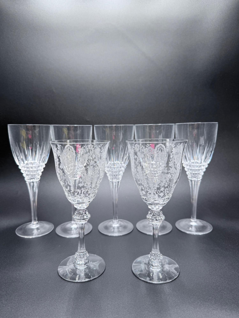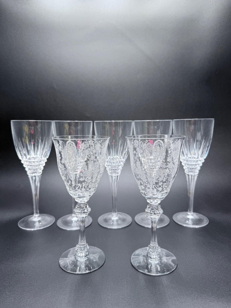 Set includes two crystal goblets with etched floral and scroll motifs on the bowl, featuring faceted stems with rounded detail near the base, likely Tiffin Franciscan "June Night." The other five goblets feature a vertical panel cut design with flared rims and multi-faceted stems, likely Cristal D'Arques-Durand Diamant. All pieces are made of clear crystal and exhibit fine detailing.