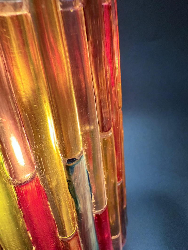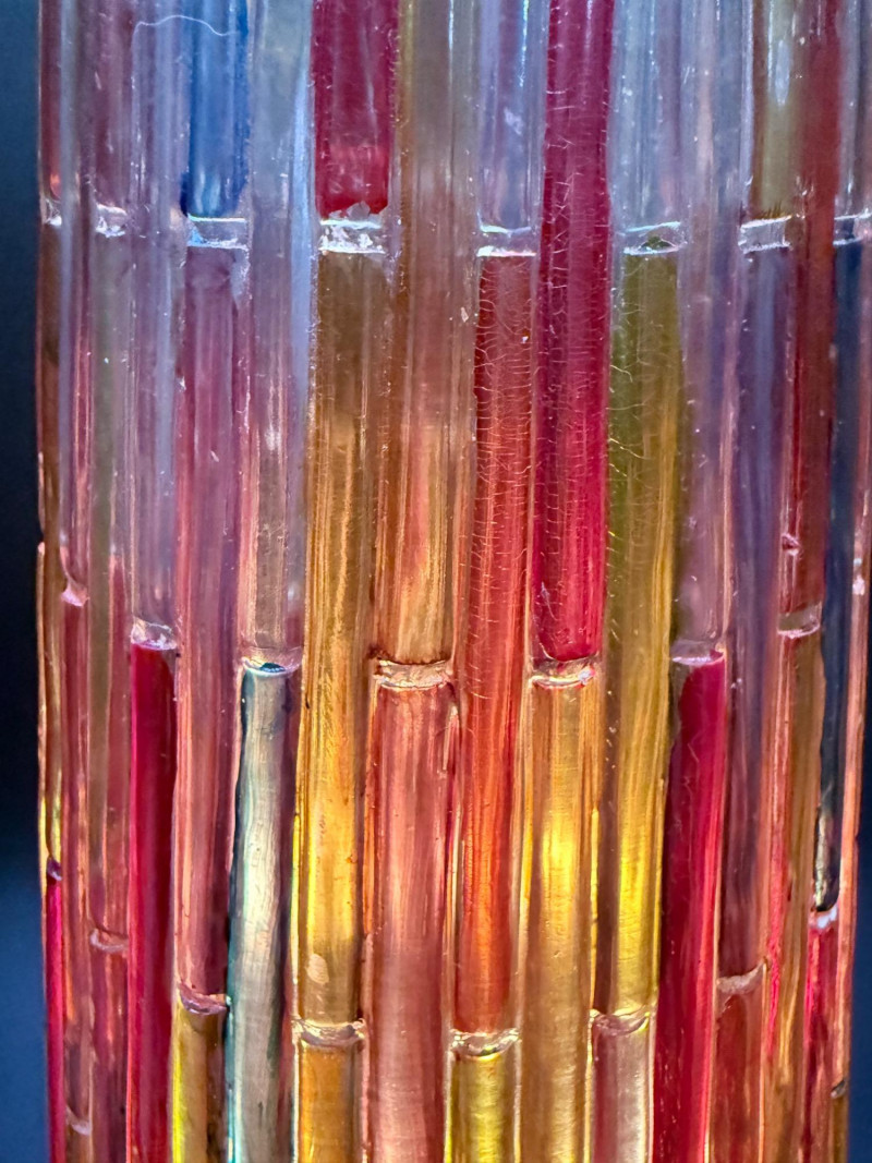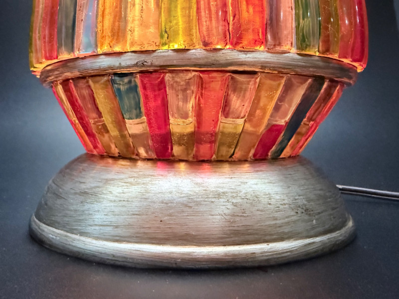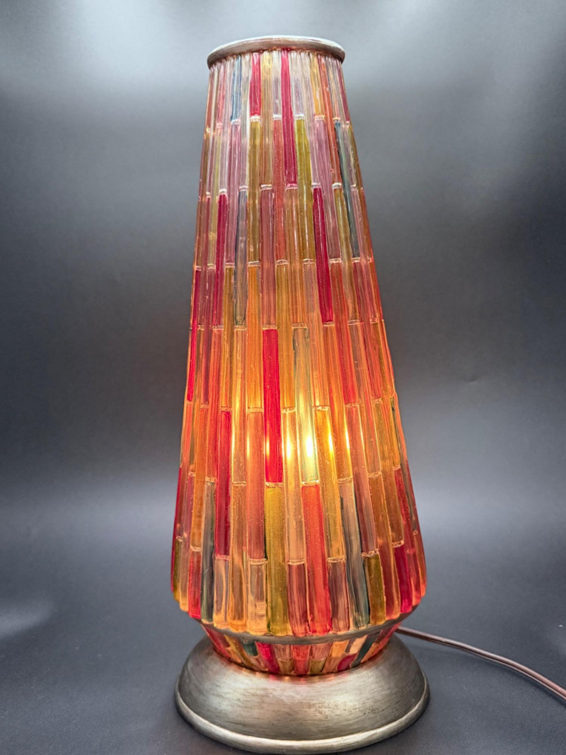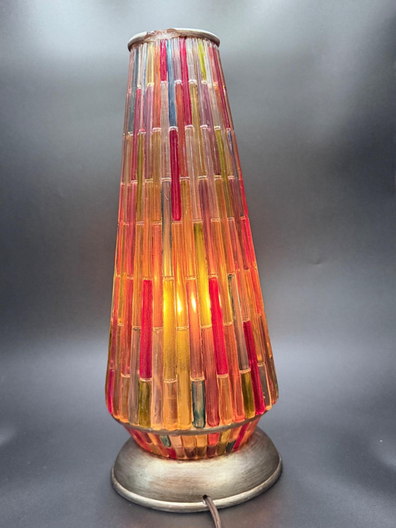 Vintage Multi-Color Rod Glass Table Lamp Electric table lamp featuring vertical glass rods in red, amber, green, pink, and clear tones mounted in a flared cylindrical form. The rods are arranged in parallel rows and set into a metallic-toned frame at the top and base. The interior houses a single bulb socket with a brown inline switch on the cord. Measurements: Approximately 19 inches tall and 8 inches in diameter. Noted: Crack on rim (see photos for details).