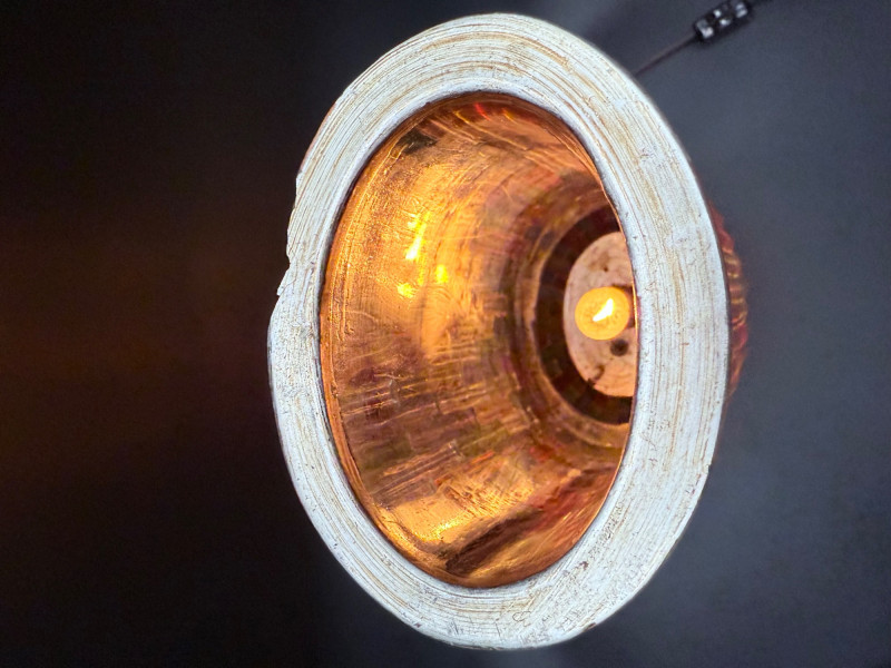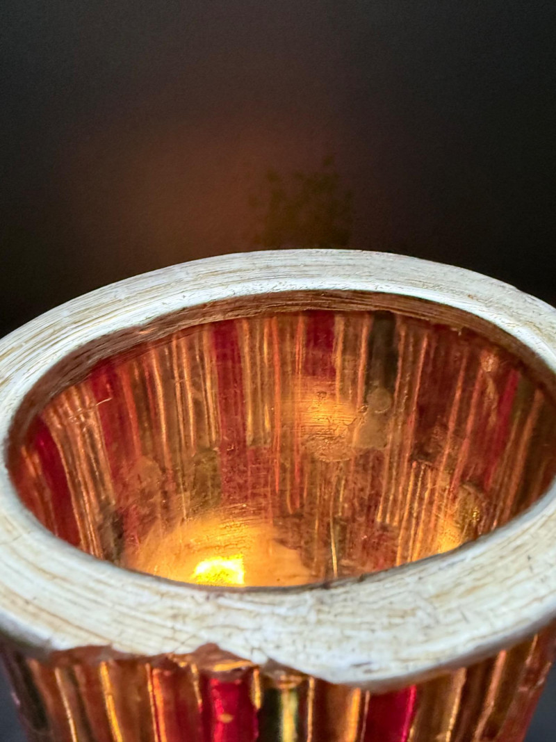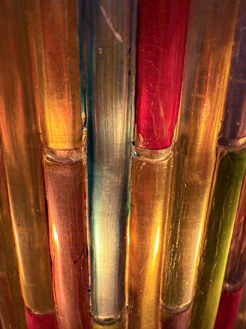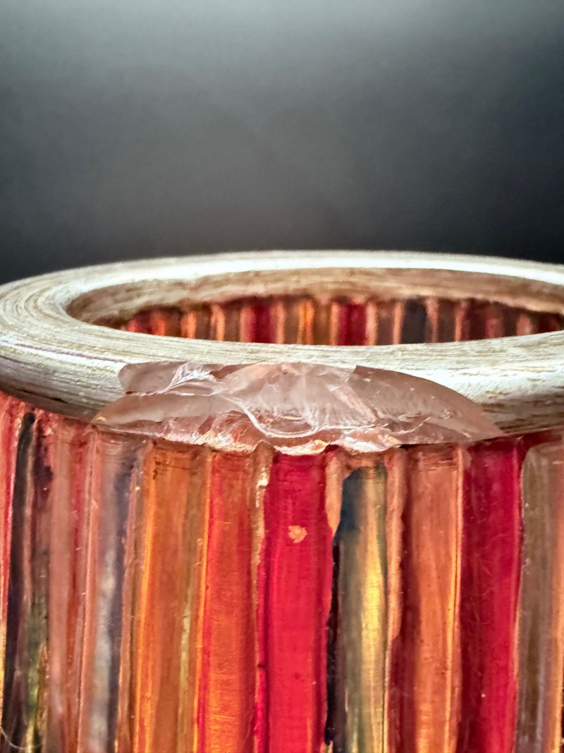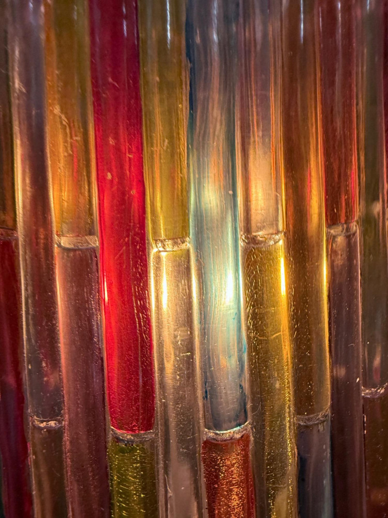 Vintage Multi-Color Rod Glass Table Lamp Electric table lamp featuring vertical glass rods in red, amber, green, pink, and clear tones mounted in a flared cylindrical form. The rods are arranged in parallel rows and set into a metallic-toned frame at the top and base. The interior houses a single bulb socket with a brown inline switch on the cord. Measurements: Approximately 19 inches tall and 8 inches in diameter. Noted: Crack on rim (see photos for details).