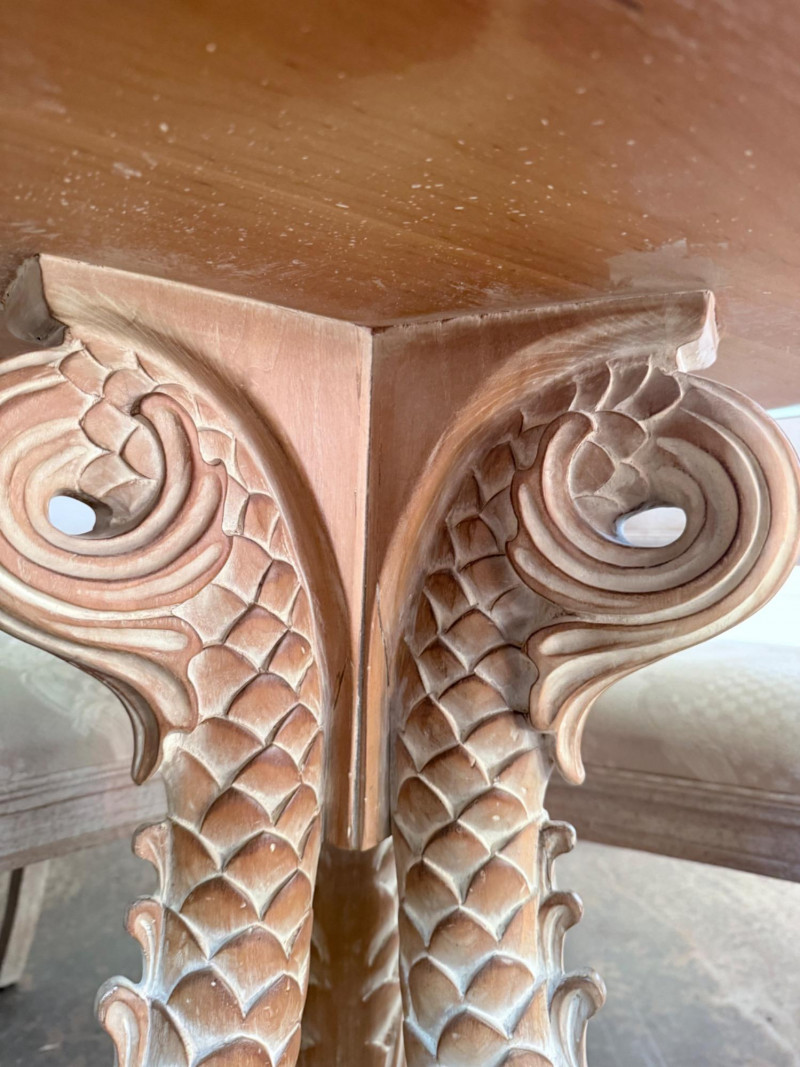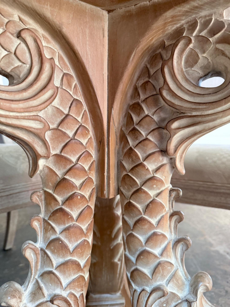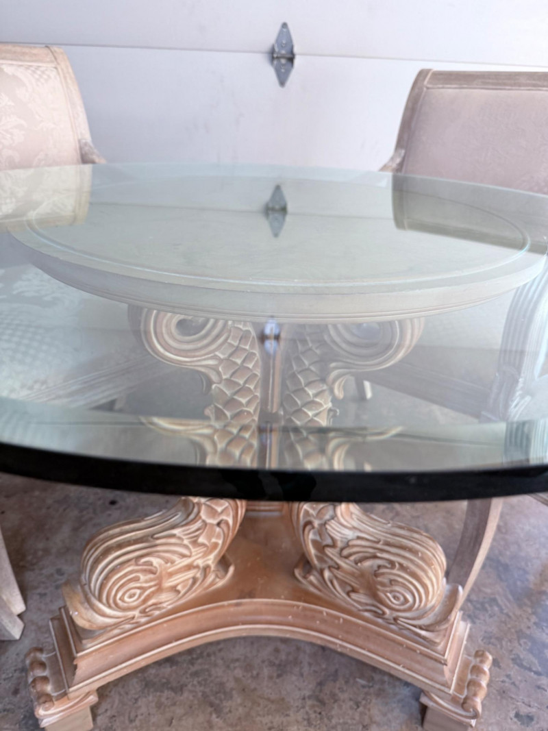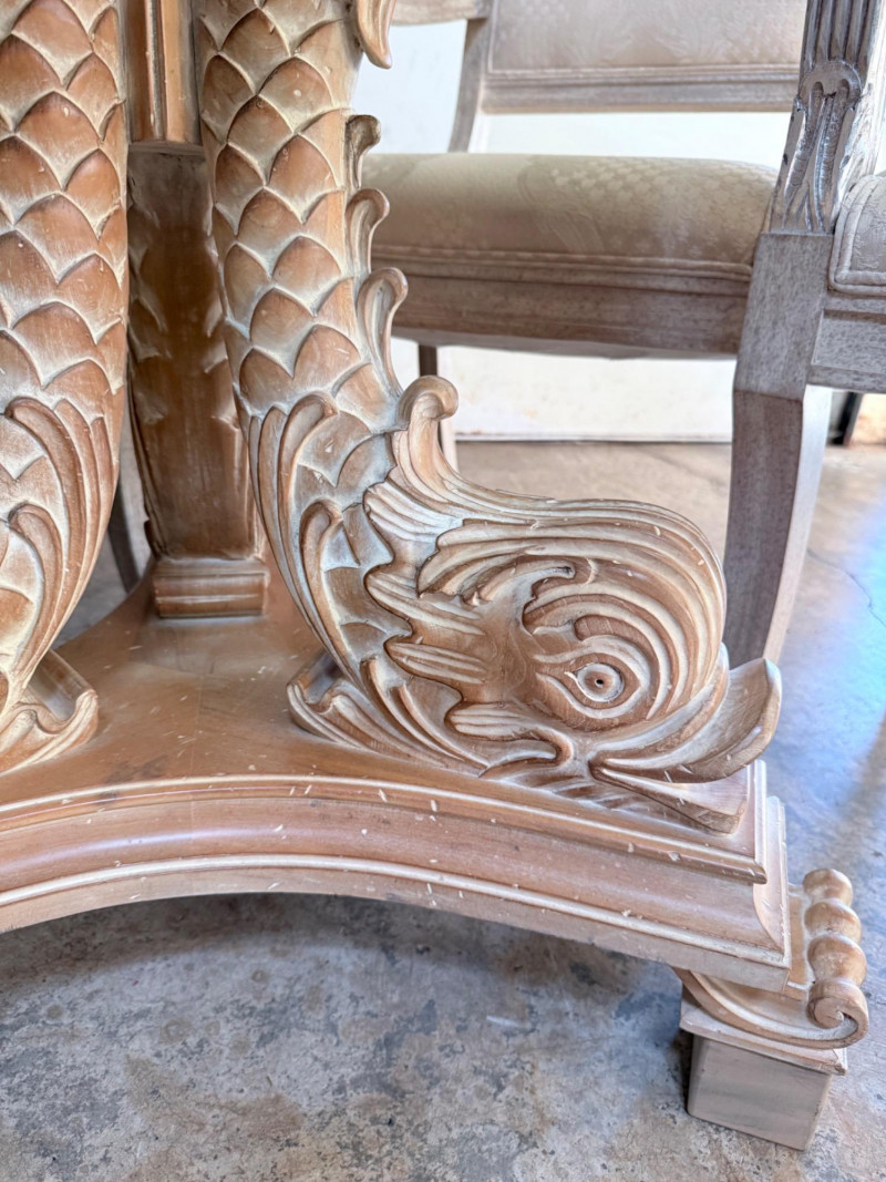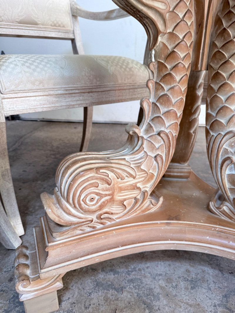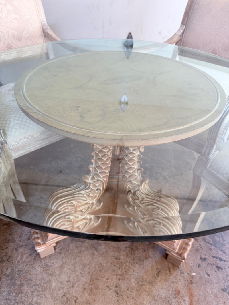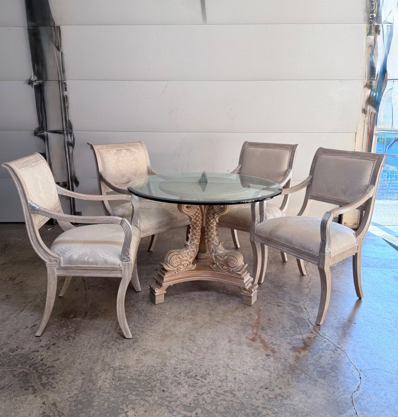 Vintage Glass Dining Set with Carved Base and Armchairs Round glass-top table with carved wooden base featuring three fish-form supports with scale and swirl detailing. The base is triangular with curved feet. The glass top has a beveled edge and is secured with a central finial. Set includes four armchairs with carved wood frames, fluted arms, and tapered legs. Upholstery is a light-colored damask with a floral and scroll motif. Wood frames show areas of wear and patina.