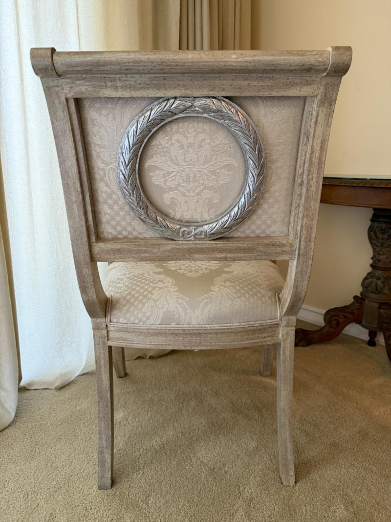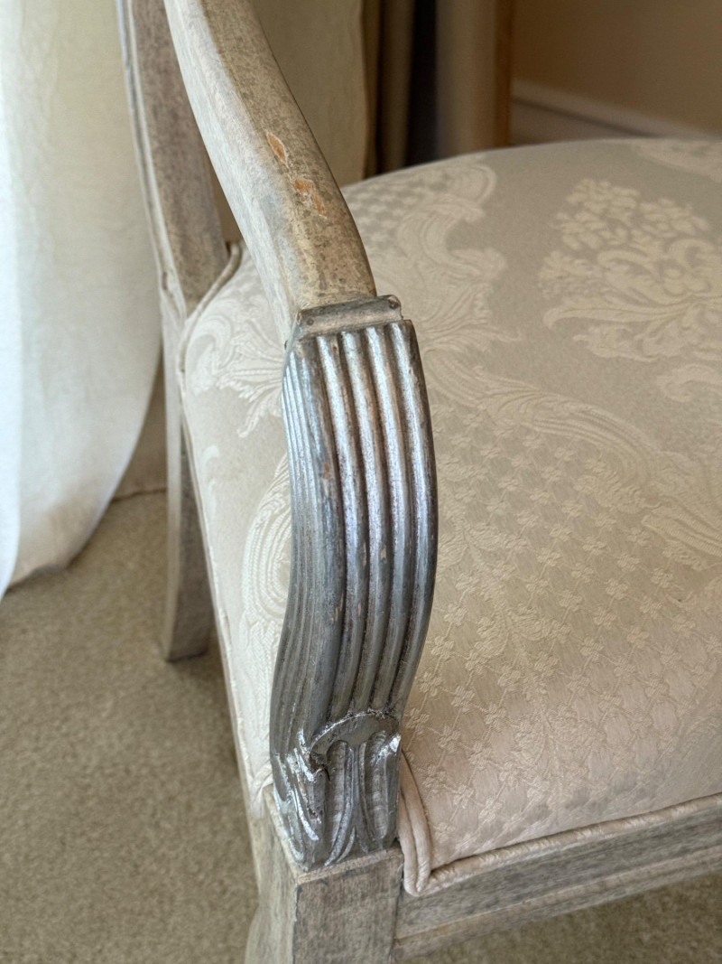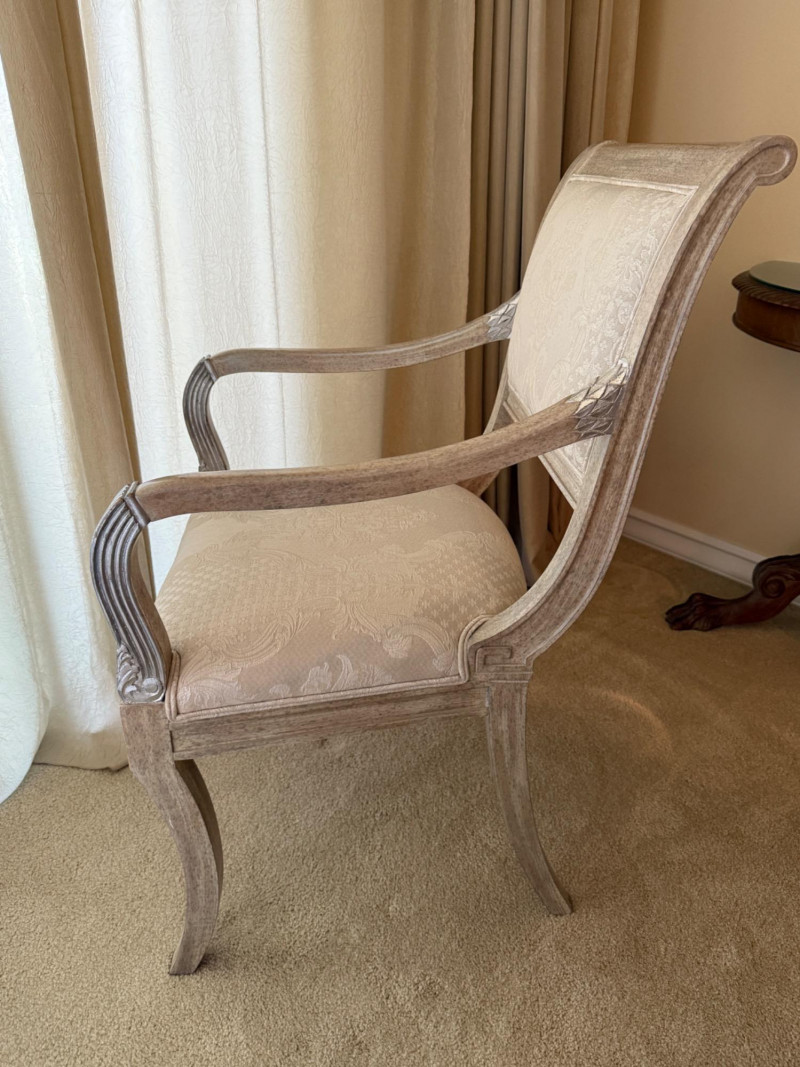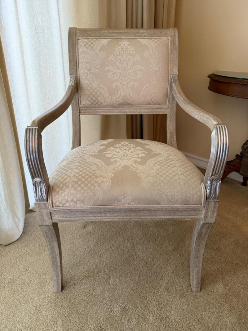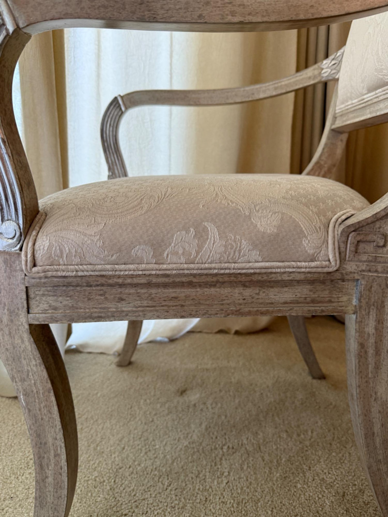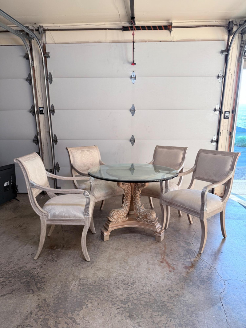 Vintage Glass Dining Set with Carved Base and Armchairs Round glass-top table with carved wooden base featuring three fish-form supports with scale and swirl detailing. The base is triangular with curved feet. The glass top has a beveled edge and is secured with a central finial. Set includes four armchairs with carved wood frames, fluted arms, and tapered legs. Upholstery is a light-colored damask with a floral and scroll motif. Wood frames show areas of wear and patina.