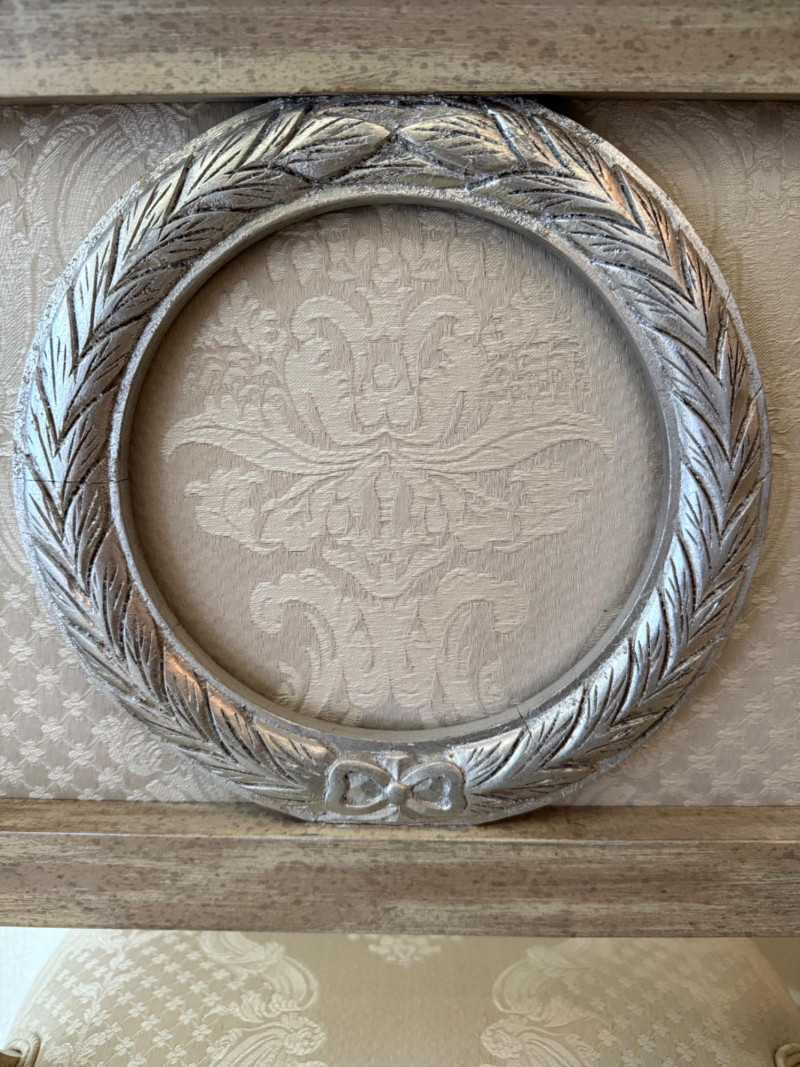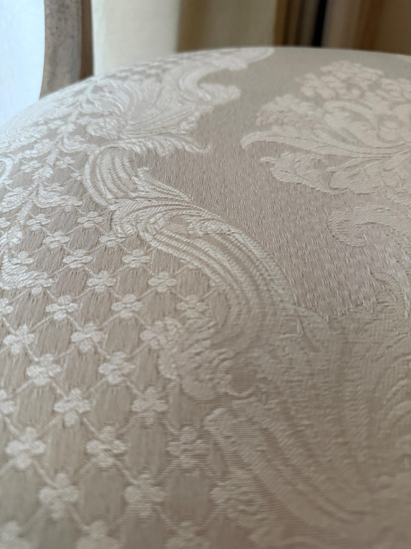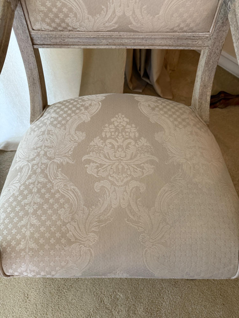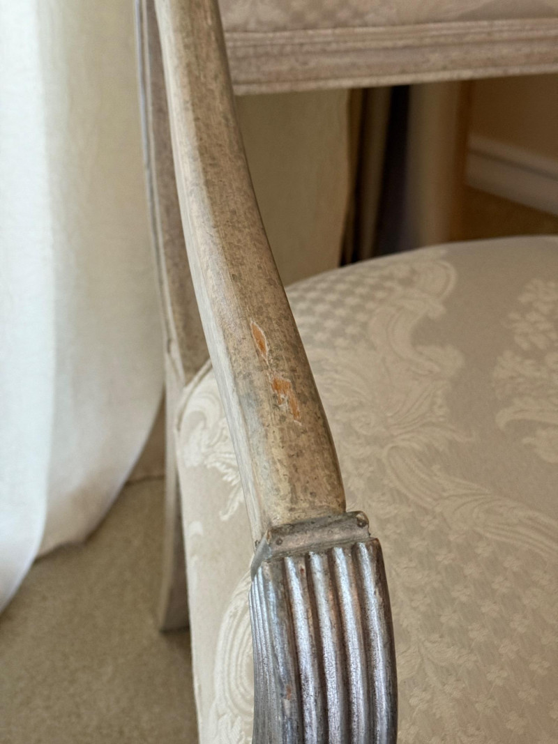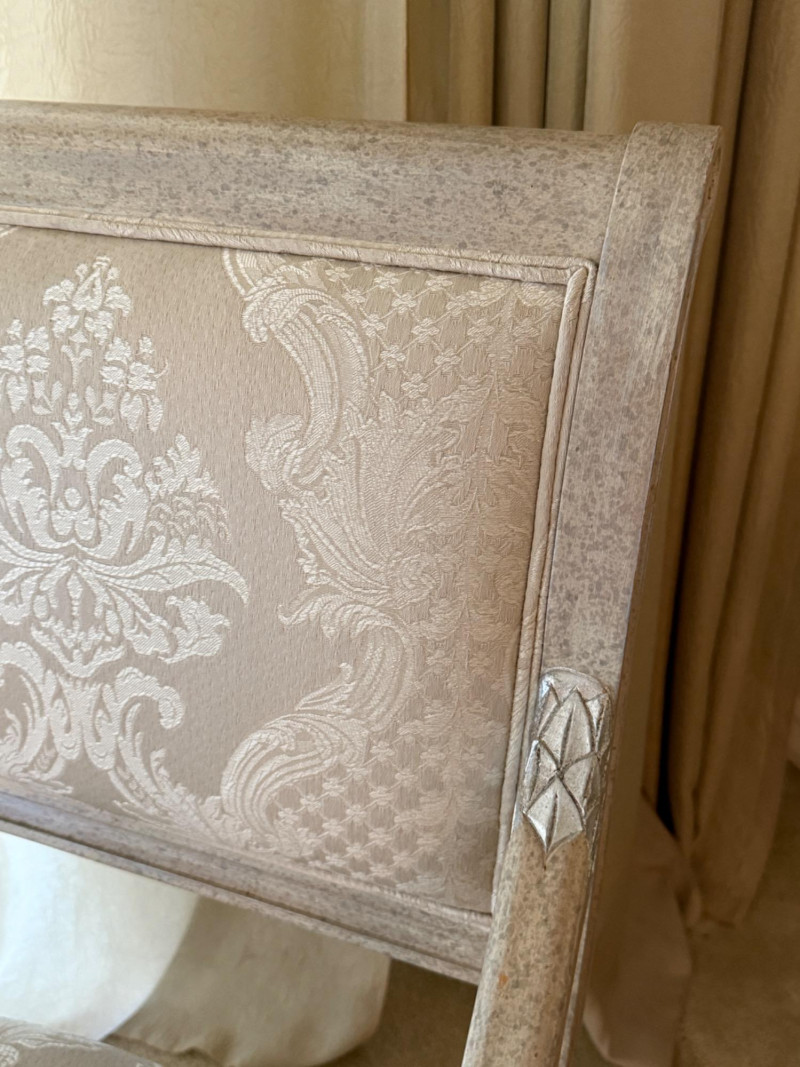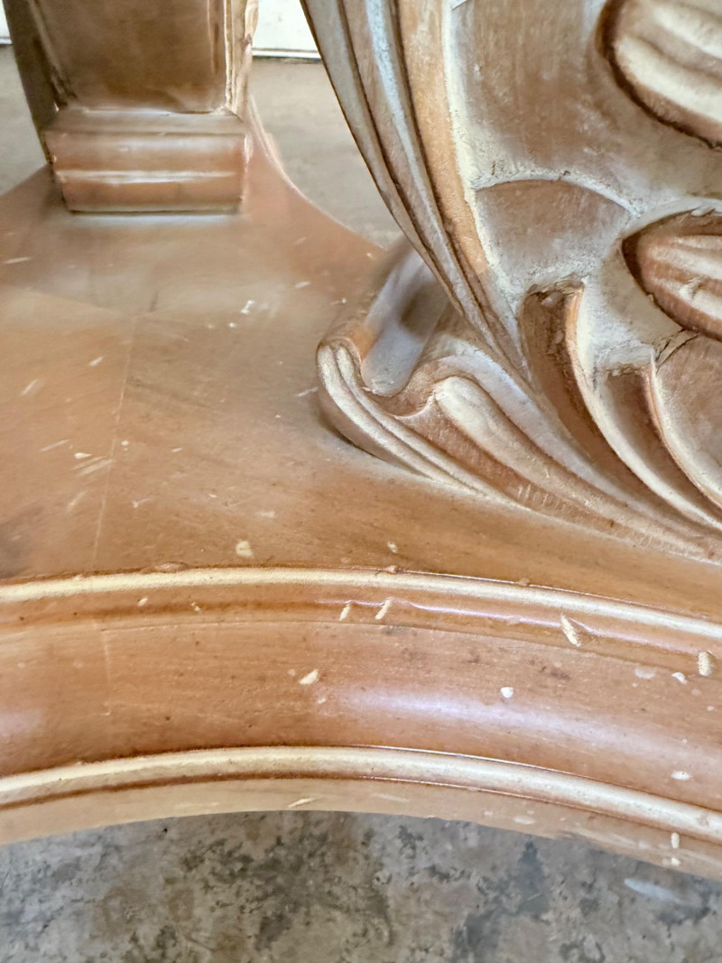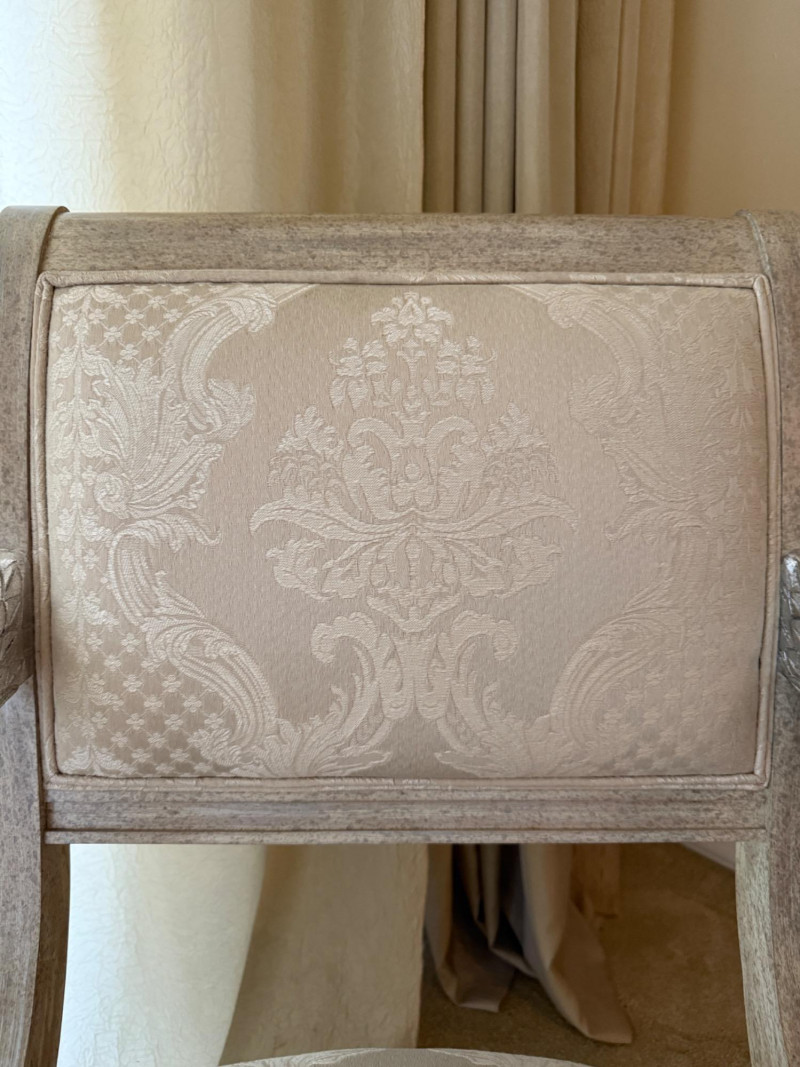 Vintage Glass Dining Set with Carved Base and Armchairs Round glass-top table with carved wooden base featuring three fish-form supports with scale and swirl detailing. The base is triangular with curved feet. The glass top has a beveled edge and is secured with a central finial. Set includes four armchairs with carved wood frames, fluted arms, and tapered legs. Upholstery is a light-colored damask with a floral and scroll motif. Wood frames show areas of wear and patina.
