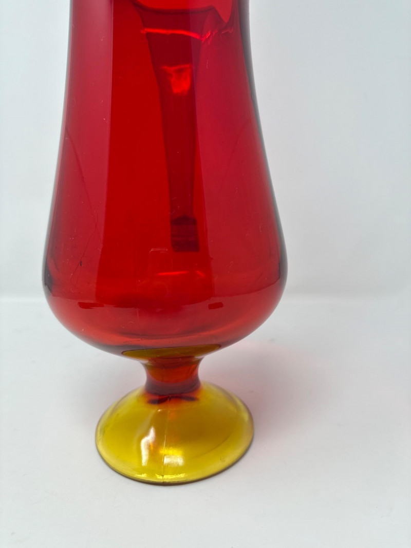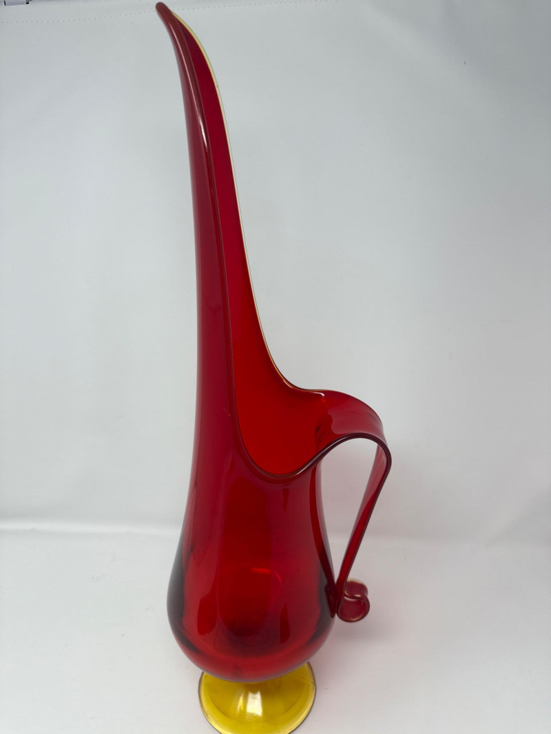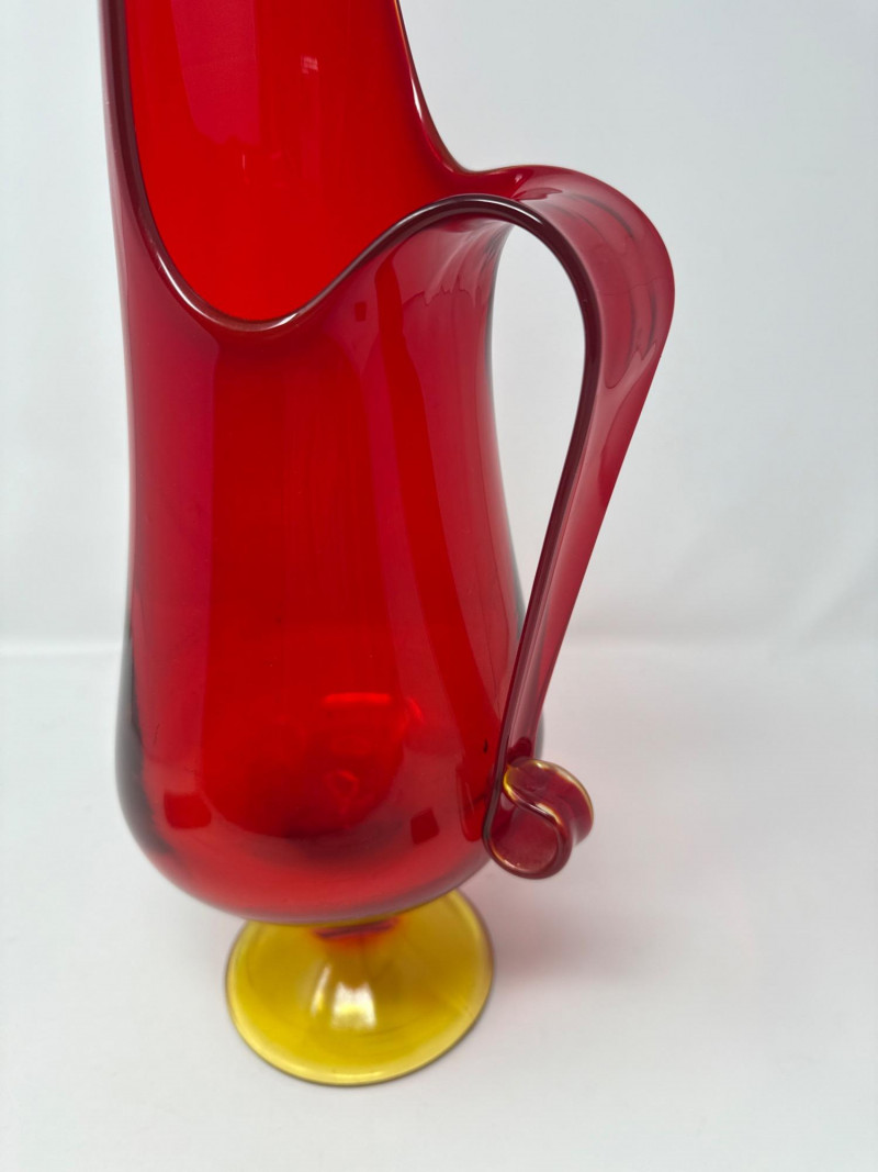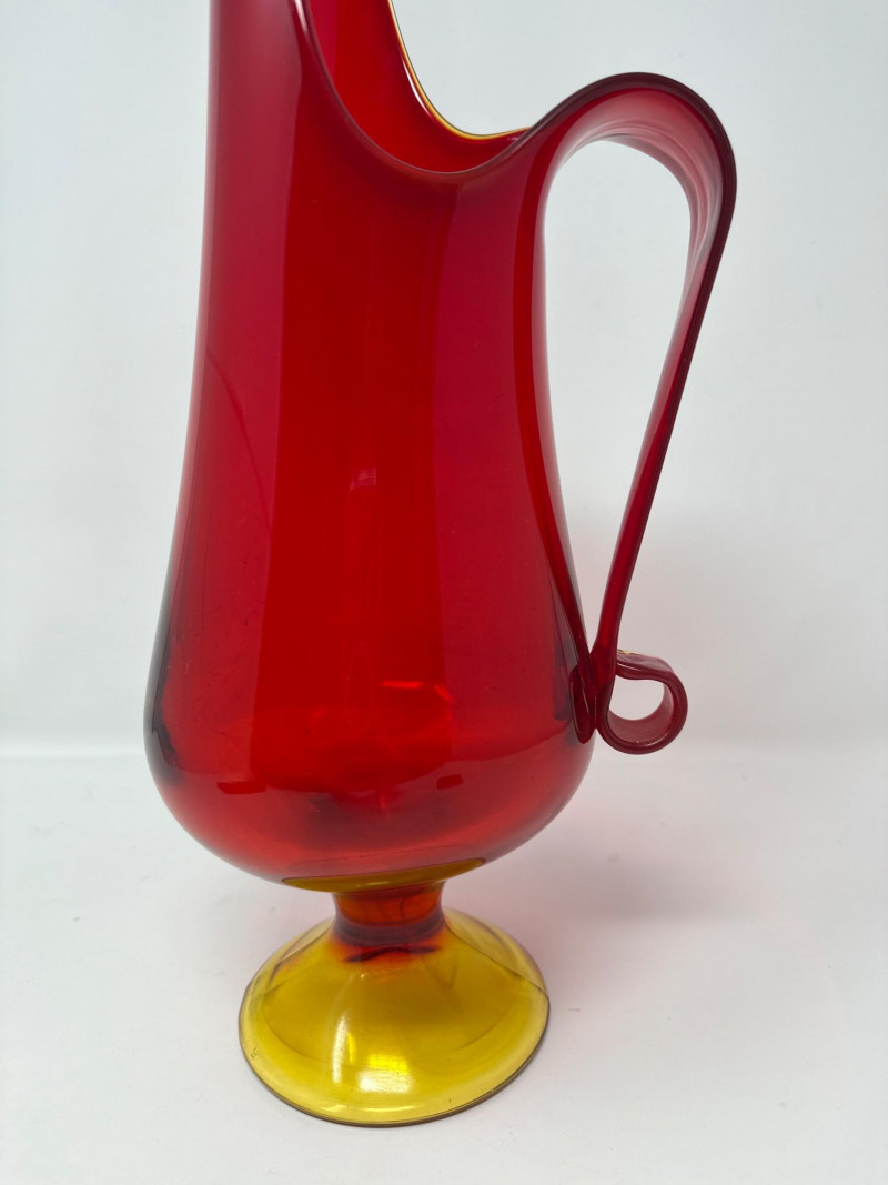 Vintage Red/Yellow Amberina Swung Glass Pitcher, L.E. Smith–Style This vintage 1960s Amberina swung glass pitcher features a vibrant red body that gracefully fades into a bright yellow foot. Hand-blown in the classic ewer shape, the elongated neck and curved handle showcase the skilled craftsmanship of its era, likely inspired by L.E. Smith’s designs. Standing 20.25″ tall with a 6″ diameter base, it makes an impressive display piece or functional vase. The glass is in excellent vintage condition with no chips, cracks, or repairs, preserving its deep color and smooth finish throughout.