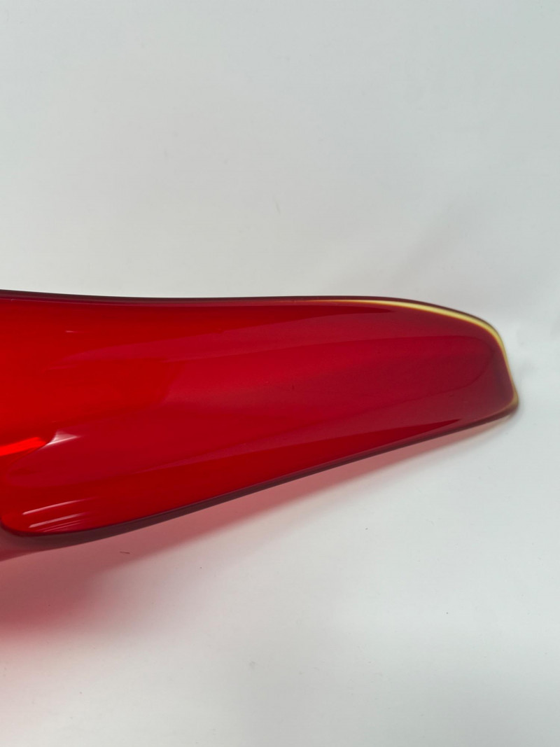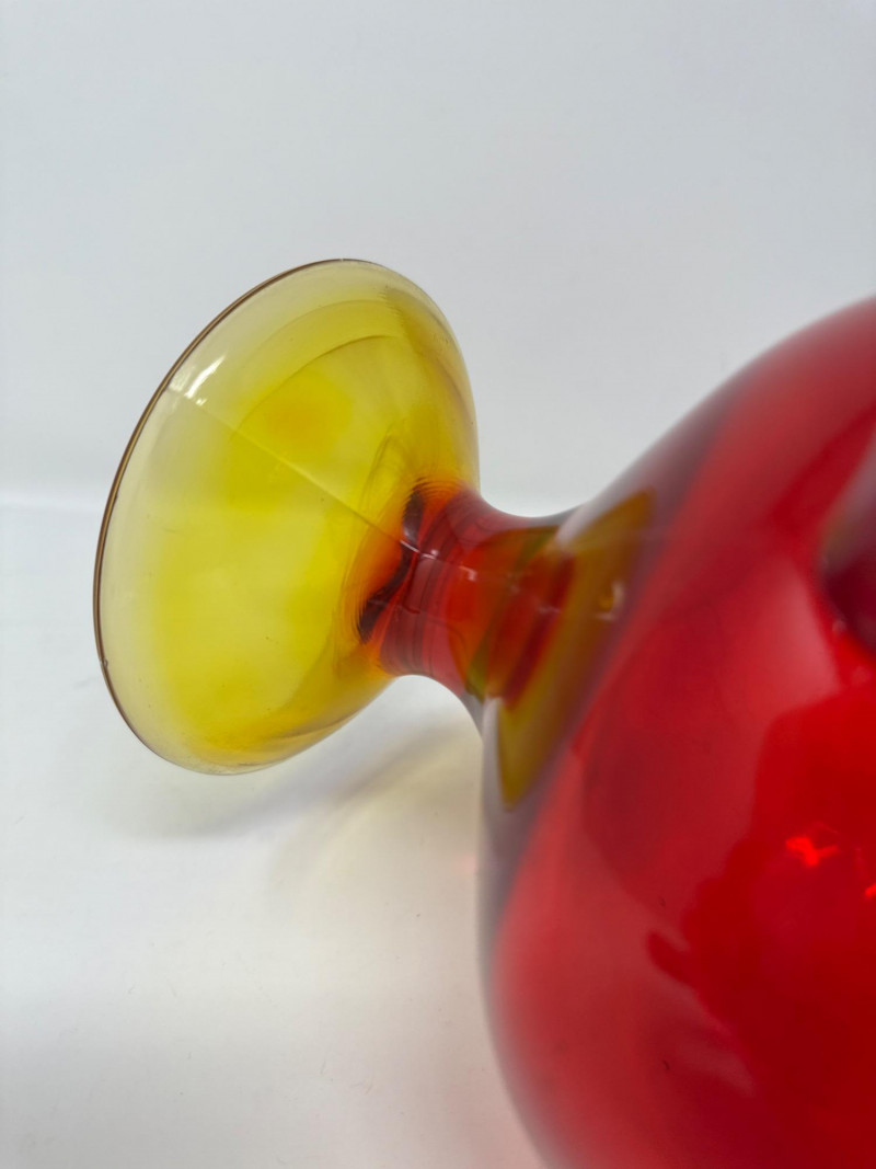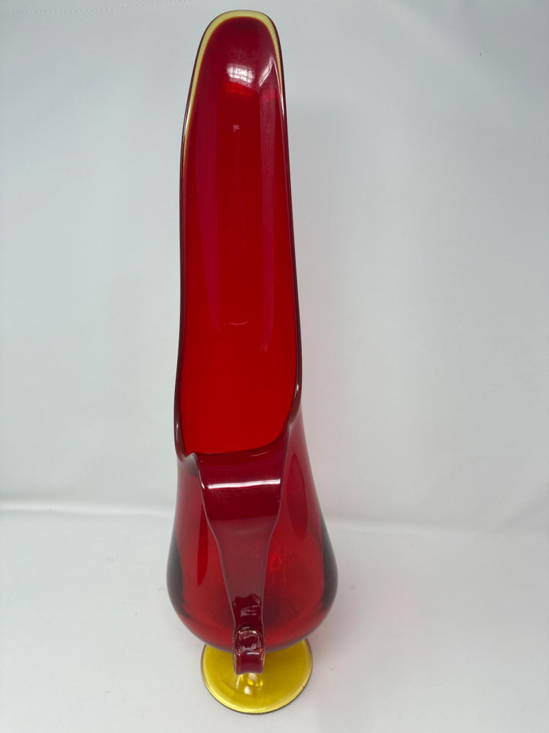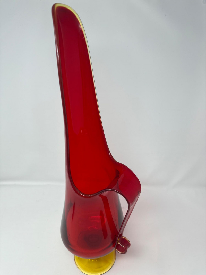 Vintage Red/Yellow Amberina Swung Glass Pitcher, L.E. Smith–Style This vintage 1960s Amberina swung glass pitcher features a vibrant red body that gracefully fades into a bright yellow foot. Hand-blown in the classic ewer shape, the elongated neck and curved handle showcase the skilled craftsmanship of its era, likely inspired by L.E. Smith’s designs. Standing 20.25″ tall with a 6″ diameter base, it makes an impressive display piece or functional vase. The glass is in excellent vintage condition with no chips, cracks, or repairs, preserving its deep color and smooth finish throughout.