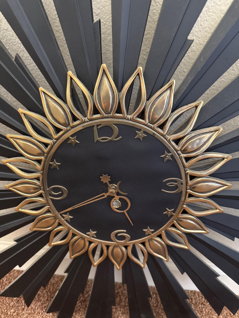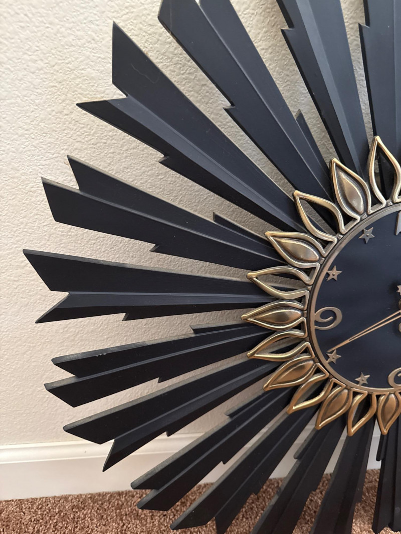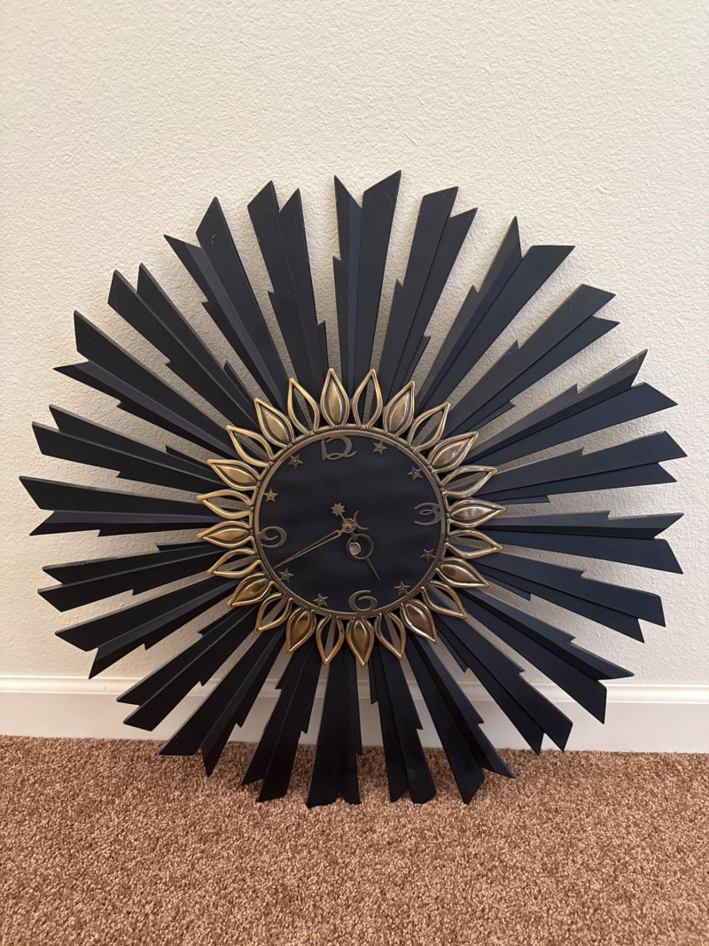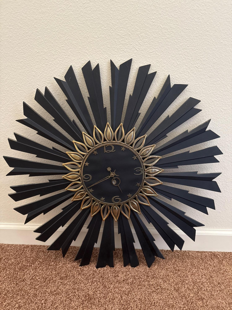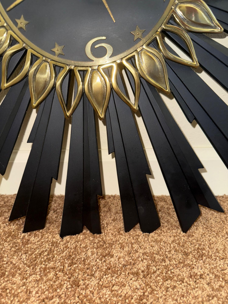 Mid-Century Sunburst Wall Clock, 25" Black & Gold Starburst Design This mid-century wall clock features a 25″ diameter sunburst design with alternating black metal spokes and gold-tone petal accents. The round face is black with raised gold-tone numerals and star-shaped markers. The hour and minute hands are also in gold tone, and the clock requires one AA battery (not included). This clock has no dents, cracks, or missing parts. Ready to hang and keep time in any room.