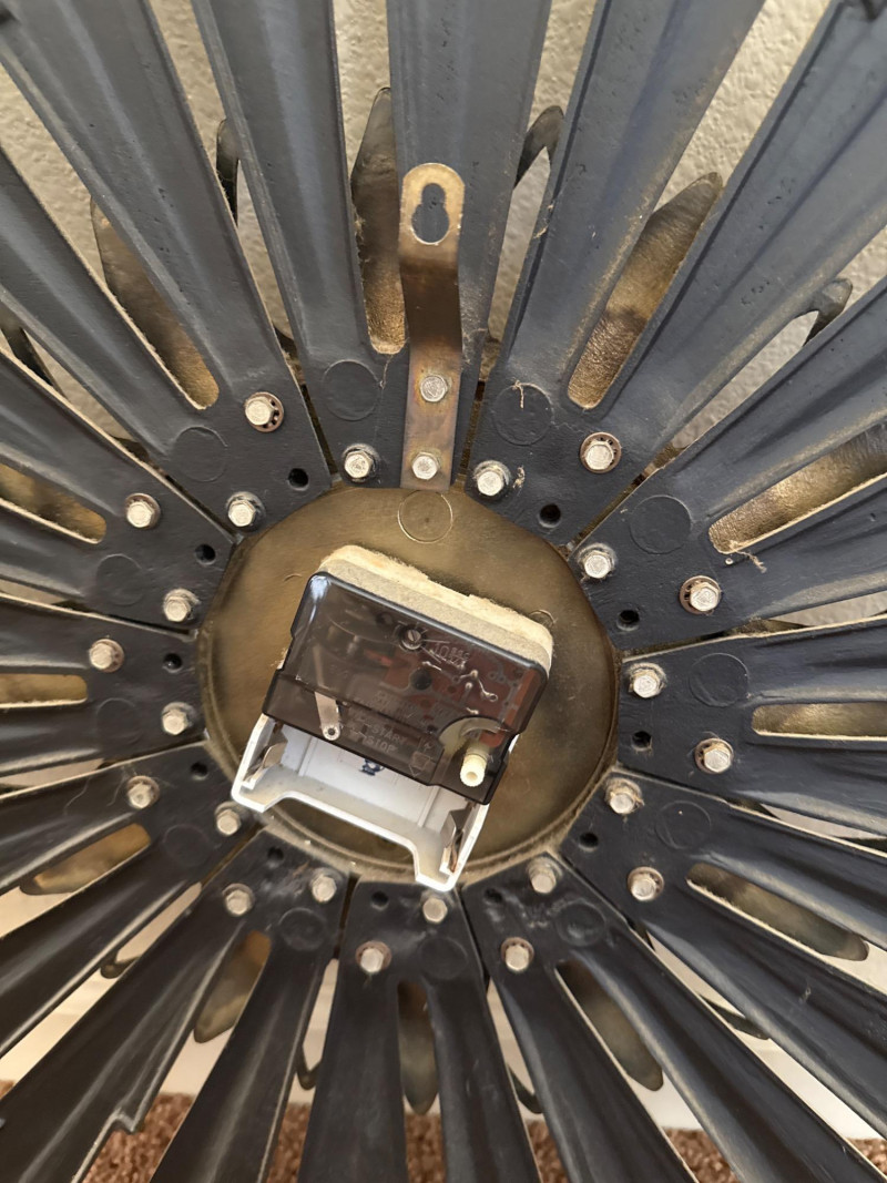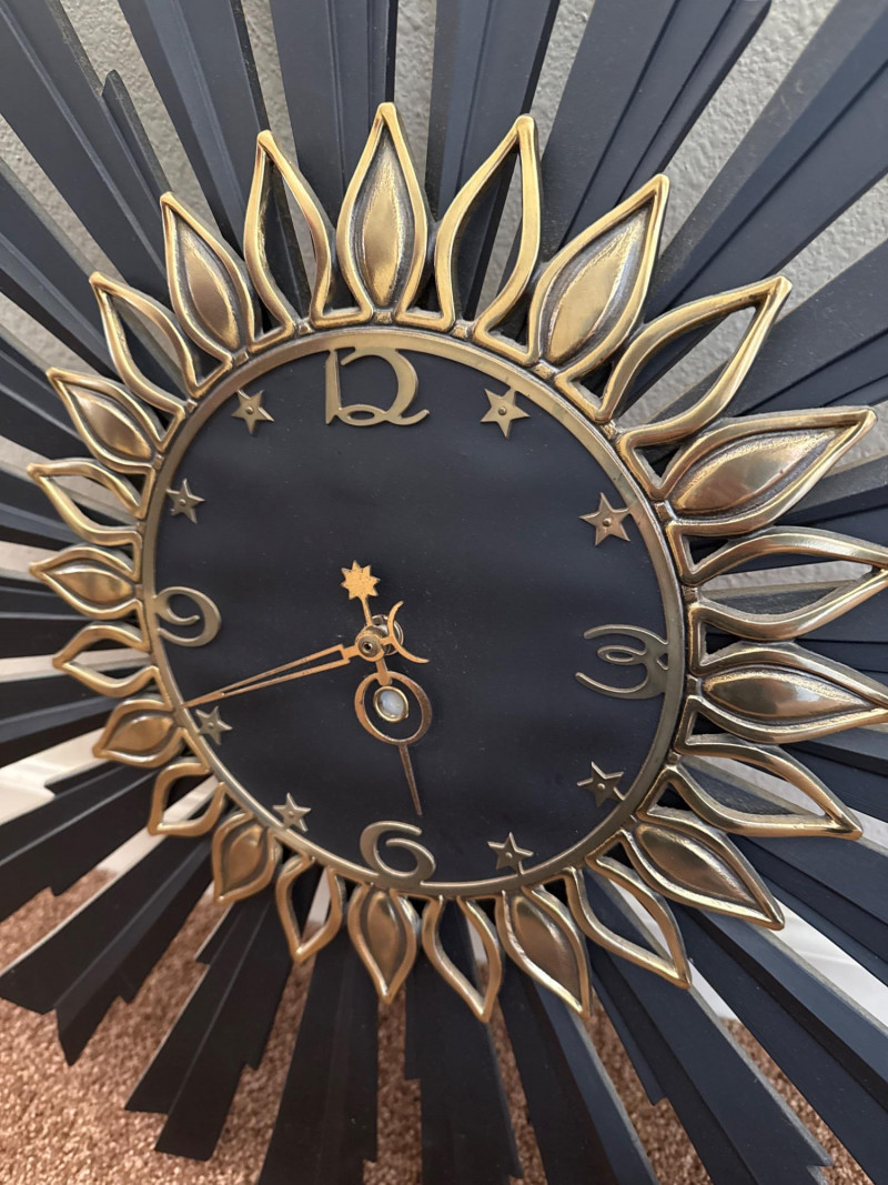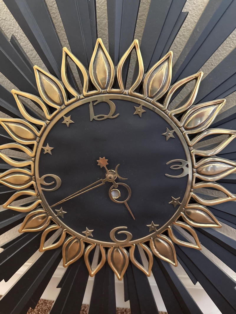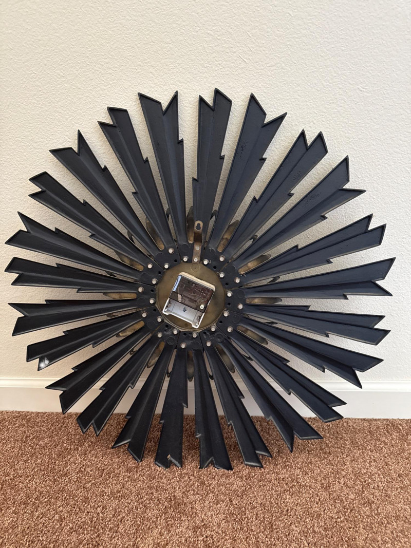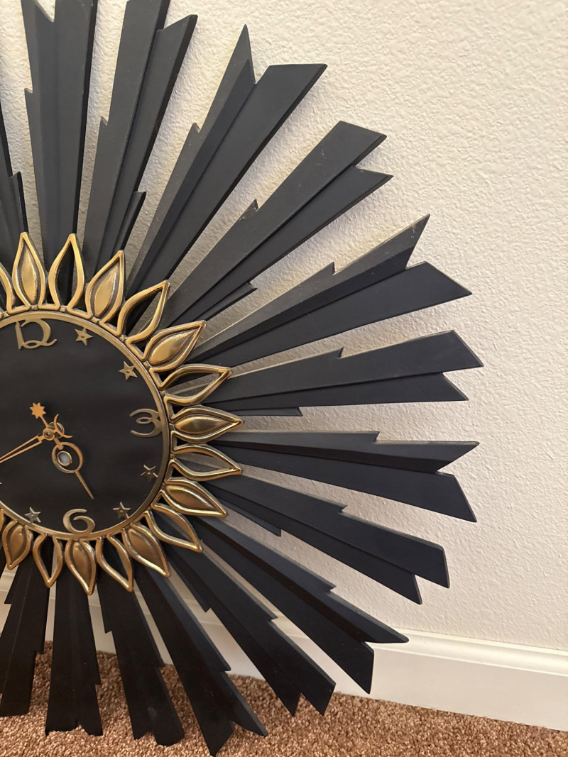 Mid-Century Sunburst Wall Clock, 25" Black & Gold Starburst Design This mid-century wall clock features a 25″ diameter sunburst design with alternating black metal spokes and gold-tone petal accents. The round face is black with raised gold-tone numerals and star-shaped markers. The hour and minute hands are also in gold tone, and the clock requires one AA battery (not included). This clock has no dents, cracks, or missing parts. Ready to hang and keep time in any room.