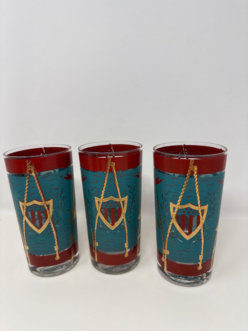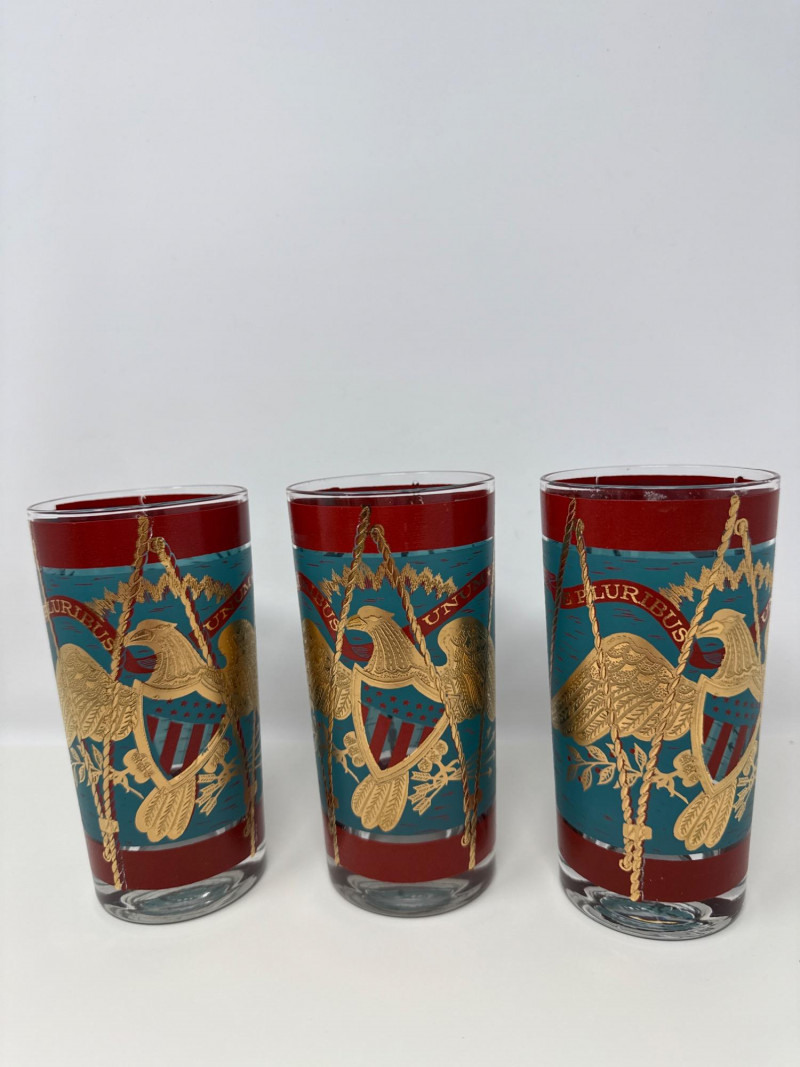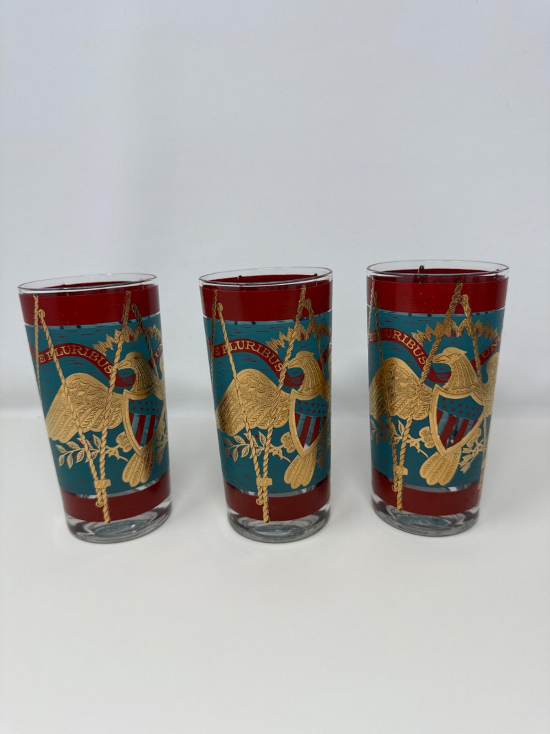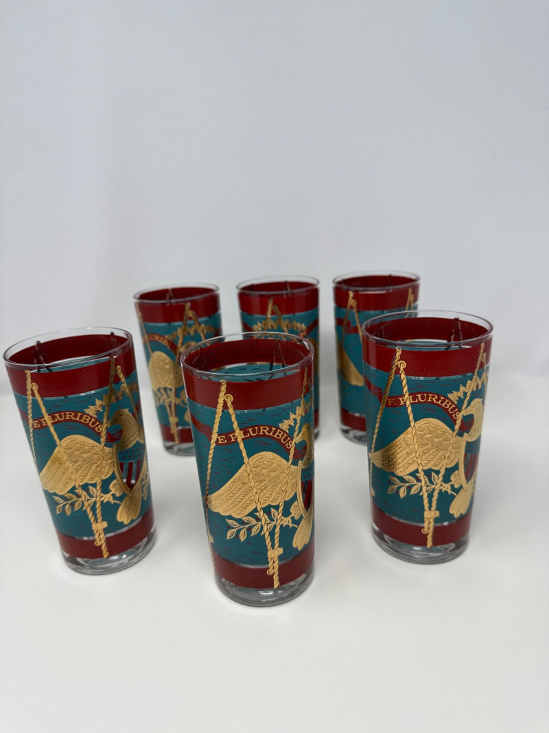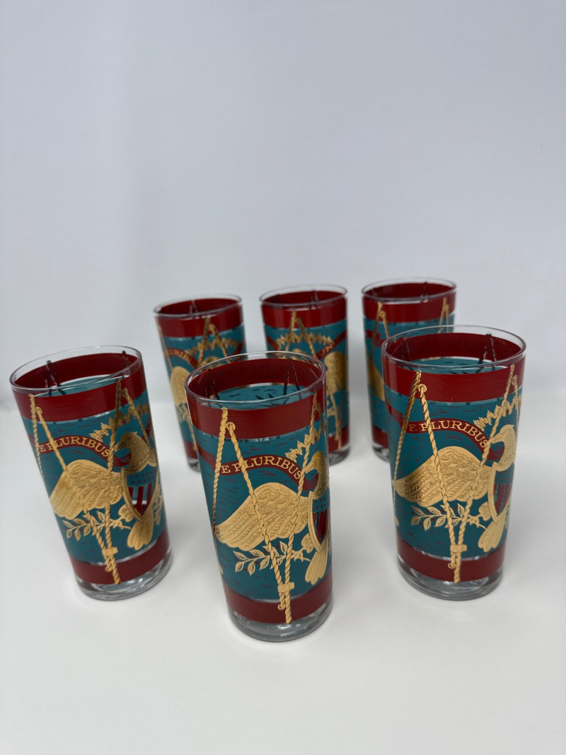 Vintage E Pluribus Highball Glasses w/ Eagle Shield Motif - Set of 6 These mid-century highball glasses each stand 5.5″ tall and feature bold red and turquoise bands with a raised gold-tone eagle and shield emblem suspended from a rope design. Each glass is made of clear glass with painted accents. The paint shows light surface wear consistent with age, but there are no chips, cracks, or repairs. Ready for display or use.
