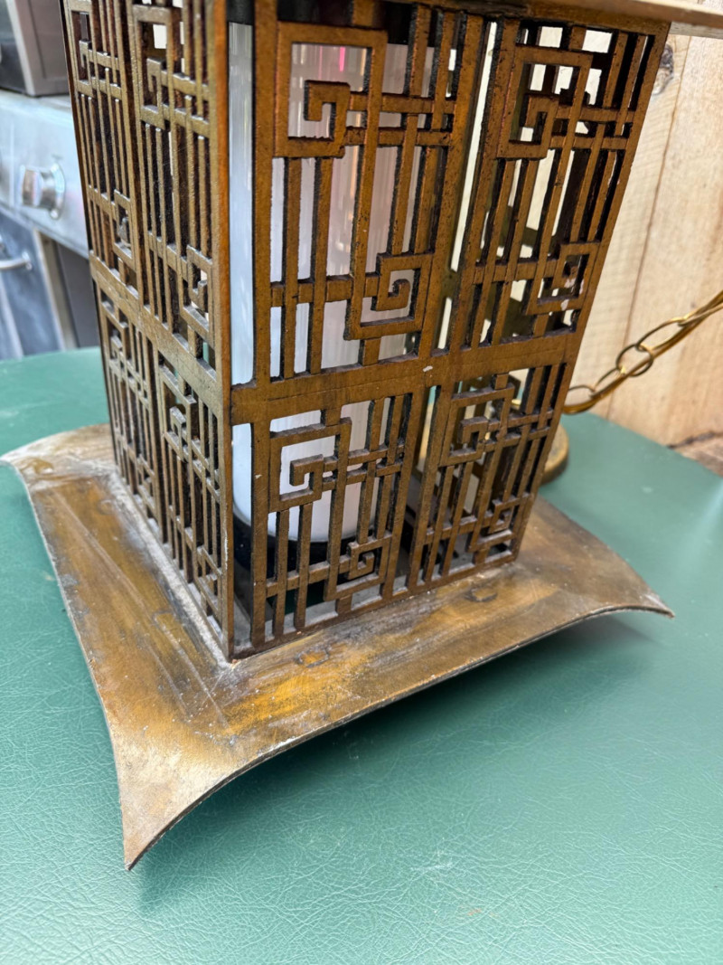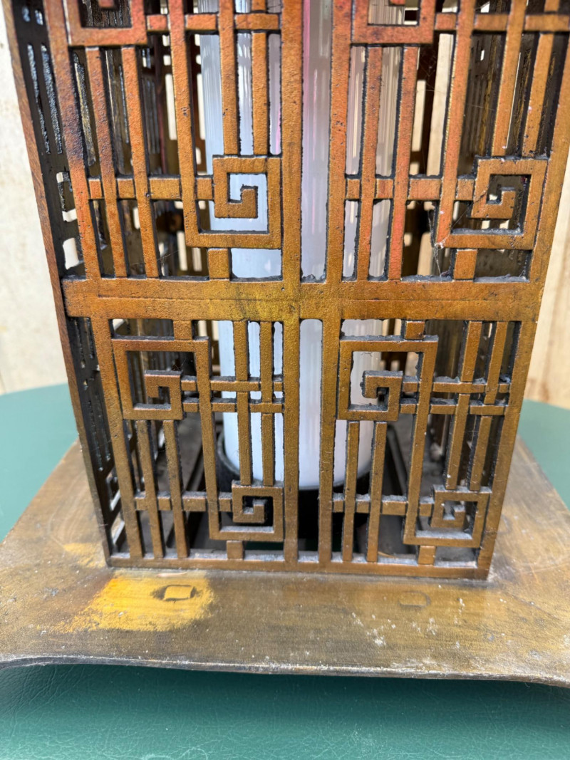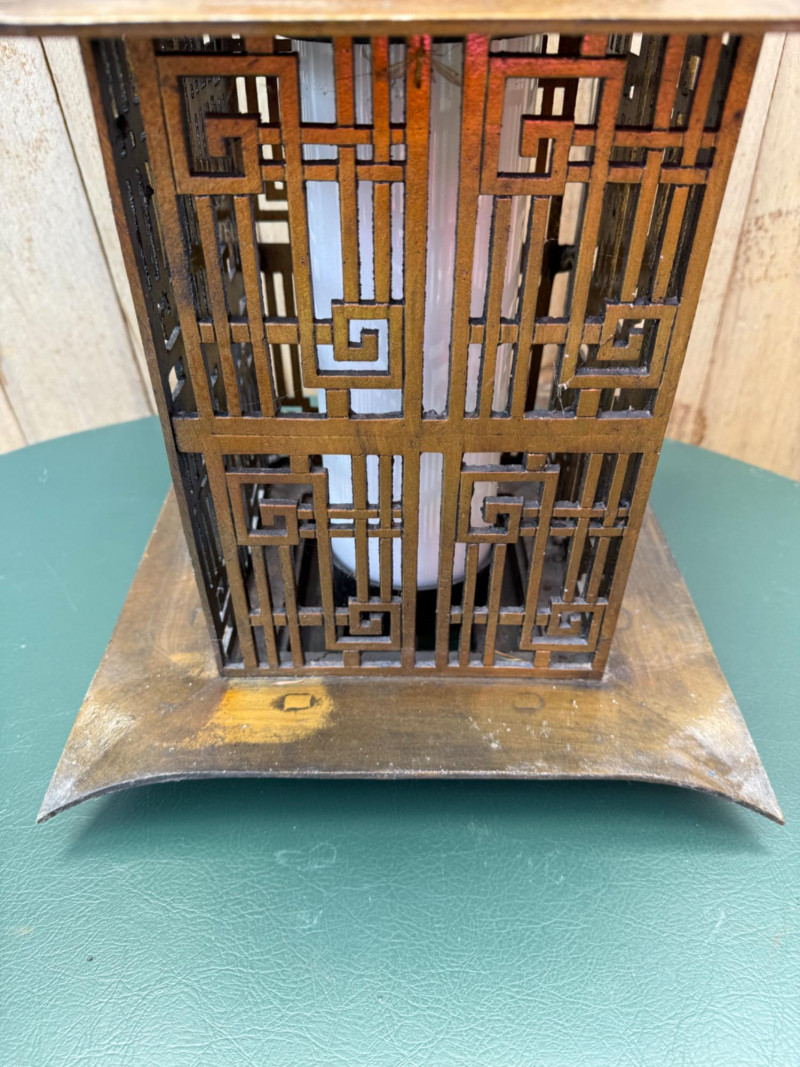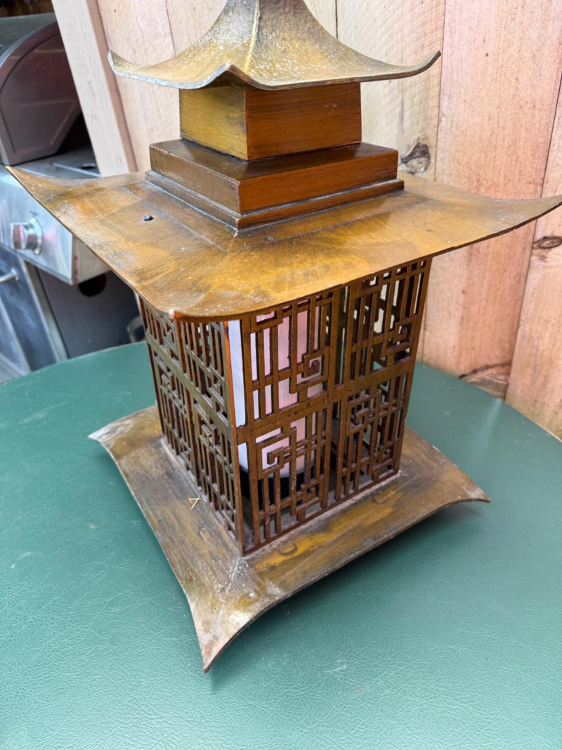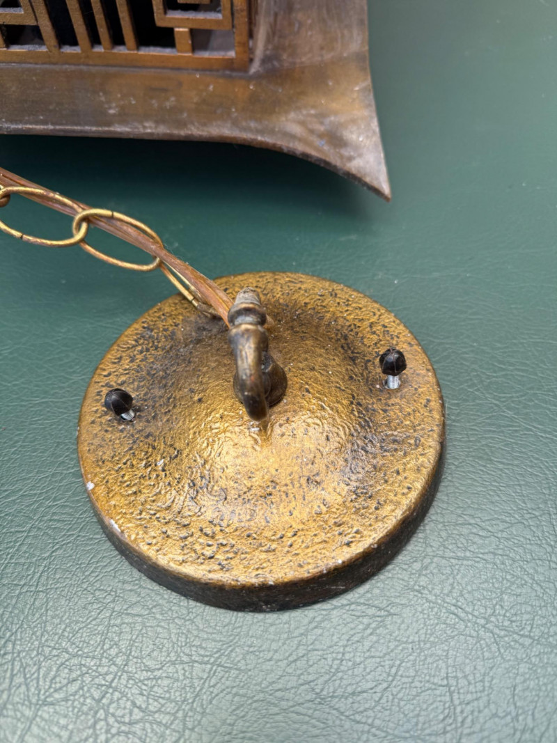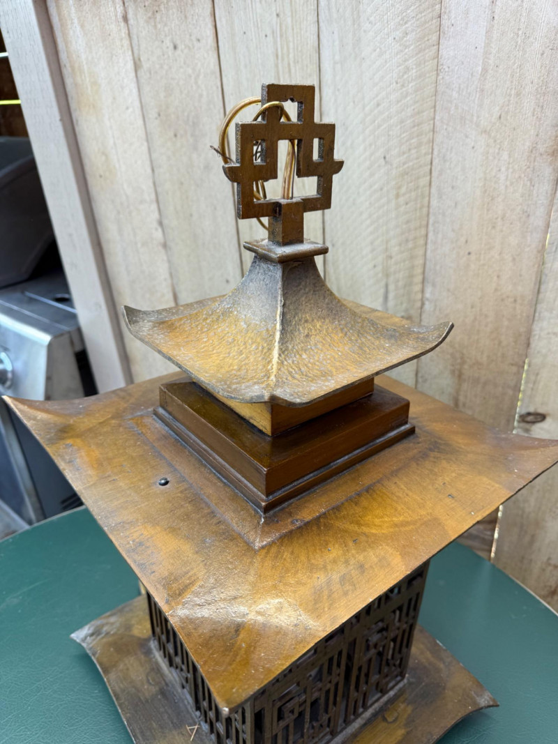 Vintage Chinoiserie Pagoda Pendant Light, Patina, Est. Value $1,300+ This heavy metal pendant light features a mid-20th-century Chinoiserie pagoda design with layered, flared roofs and decorative fretwork on all sides. The exterior finish has a warm, aged patina. It measures 24″ tall and 14″ wide and includes the original chain and ceiling canopy for hanging. Inside is a single bulb socket (bulb not included). Surface oxidation and patina are evident throughout, consistent with age. The metalwork is solid with no breaks or missing panels. The hanging chain and canopy show matching oxidation but remain sturdy. The same style is listed online for $1,395. Source.