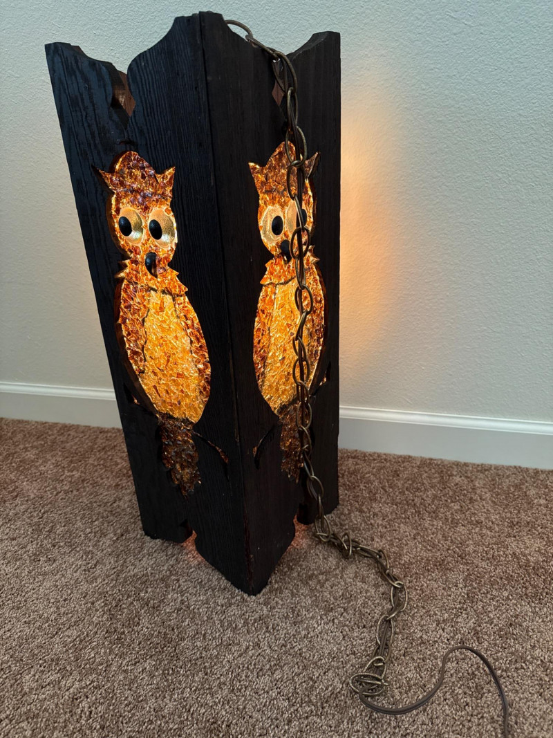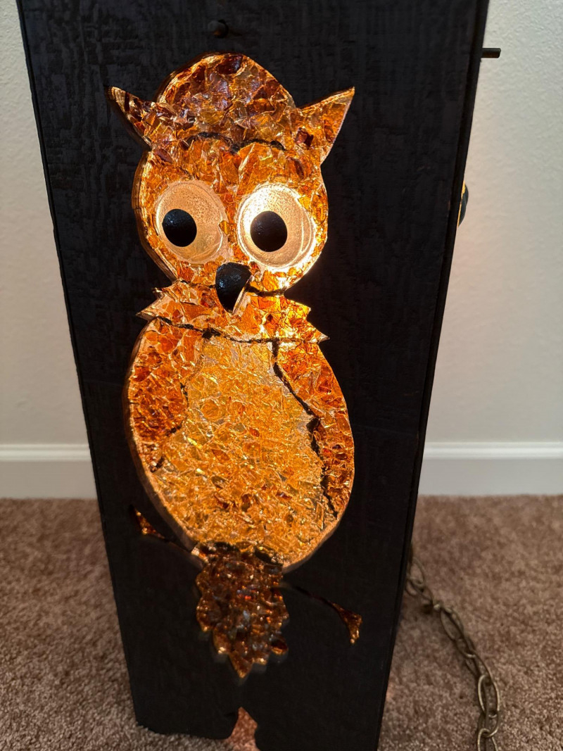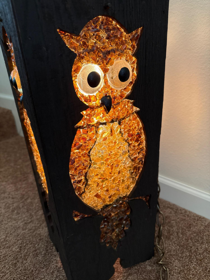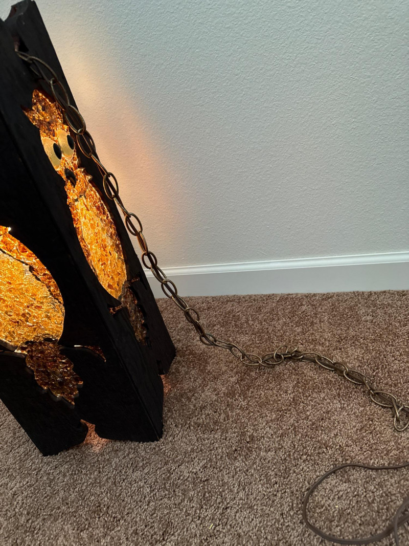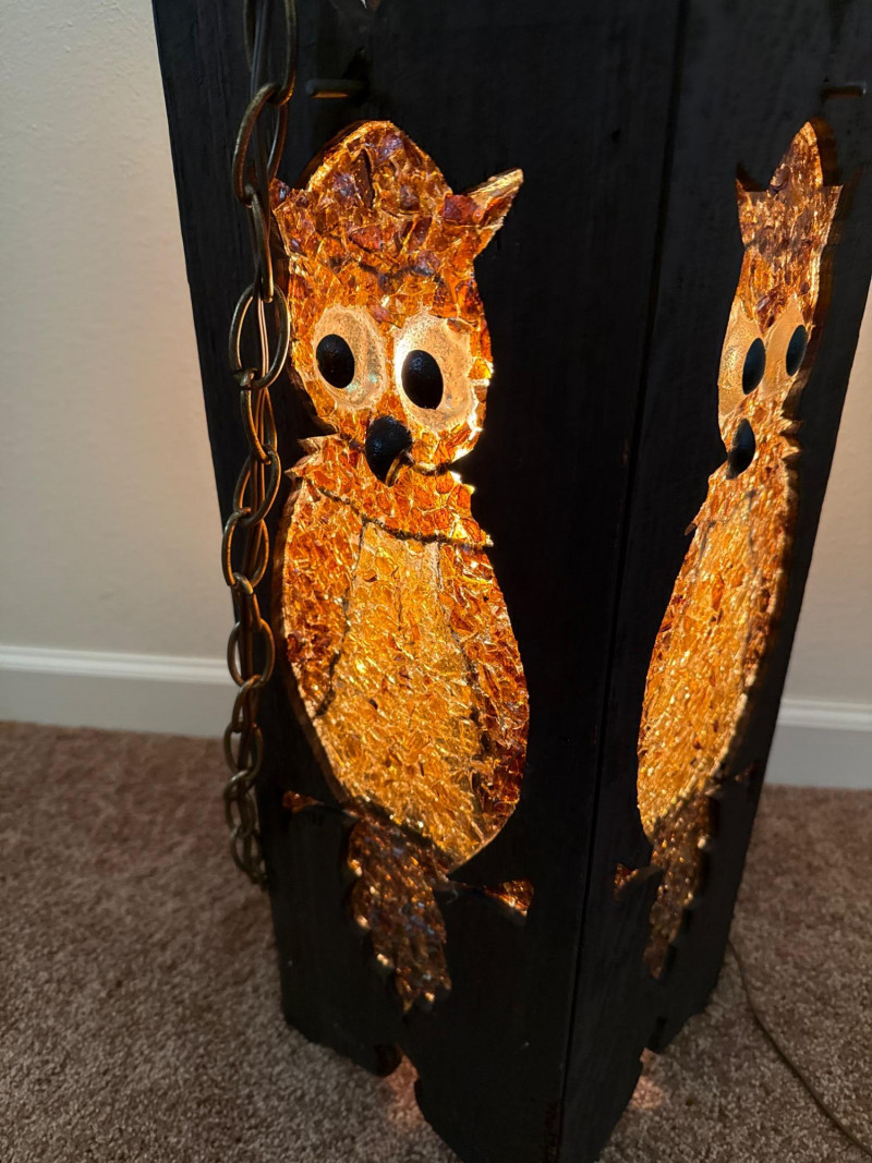 Owl Swag Lamp with Amber Crackle Glass, 24″H × 8.5″W This hanging swag lamp stands 24″ tall and 8.5″ wide. Four vertical wooden panels, finished in charcoal, each feature an amber-colored crackle glass inlay cut into an owl silhouette. When lit, the lamp casts a warm amber glow through the textured glass. The fixture hangs by a metal chain (included) and uses a standard 60W bulb (not included) with a pull-chain switch at the socket.