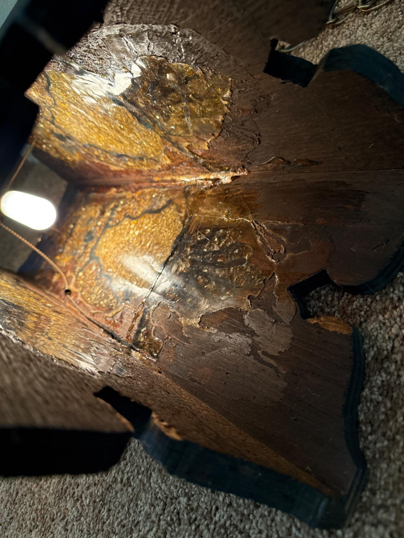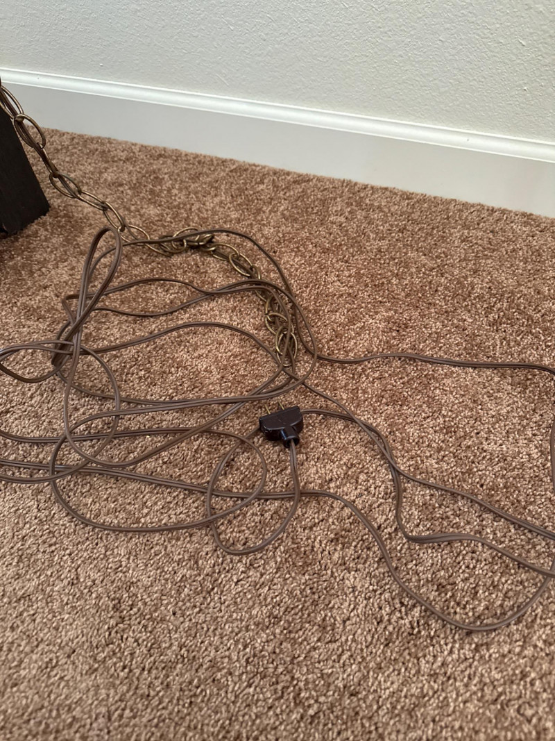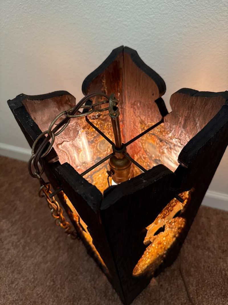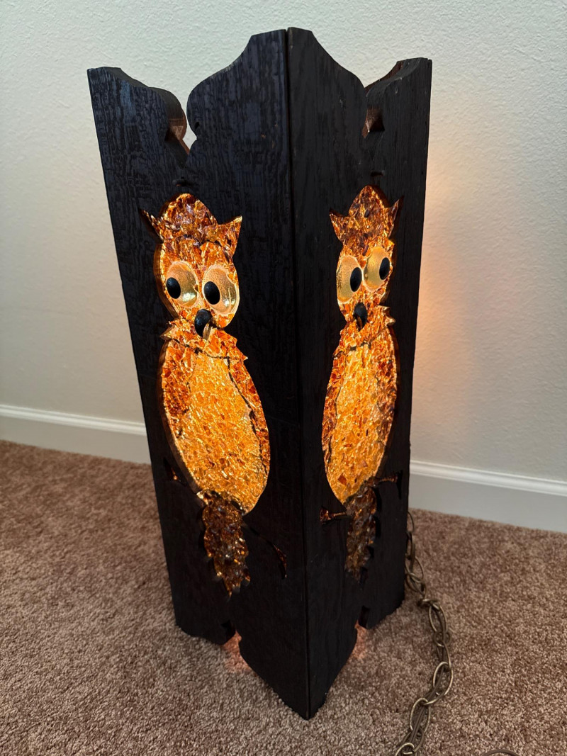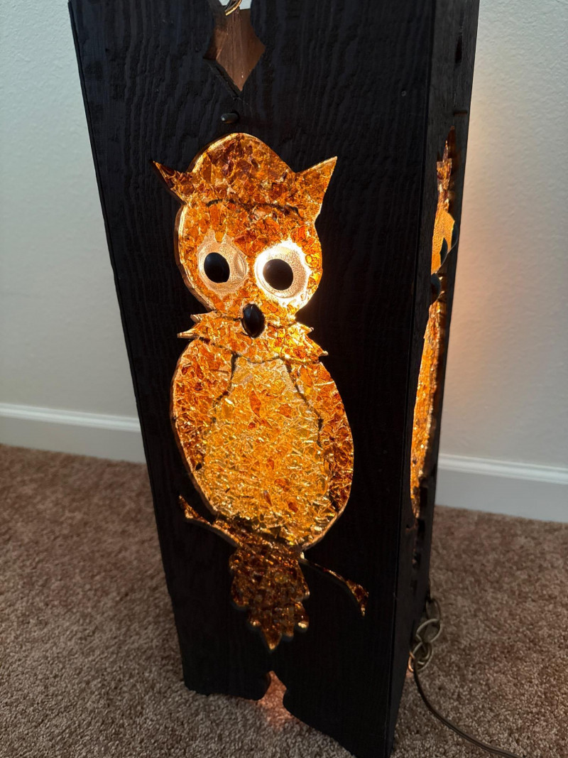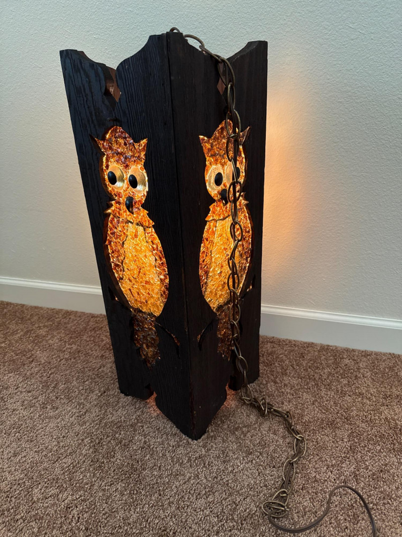 Owl Swag Lamp with Amber Crackle Glass, 24″H × 8.5″W This hanging swag lamp stands 24″ tall and 8.5″ wide. Four vertical wooden panels, finished in charcoal, each feature an amber-colored crackle glass inlay cut into an owl silhouette. When lit, the lamp casts a warm amber glow through the textured glass. The fixture hangs by a metal chain (included) and uses a standard 60W bulb (not included) with a pull-chain switch at the socket.