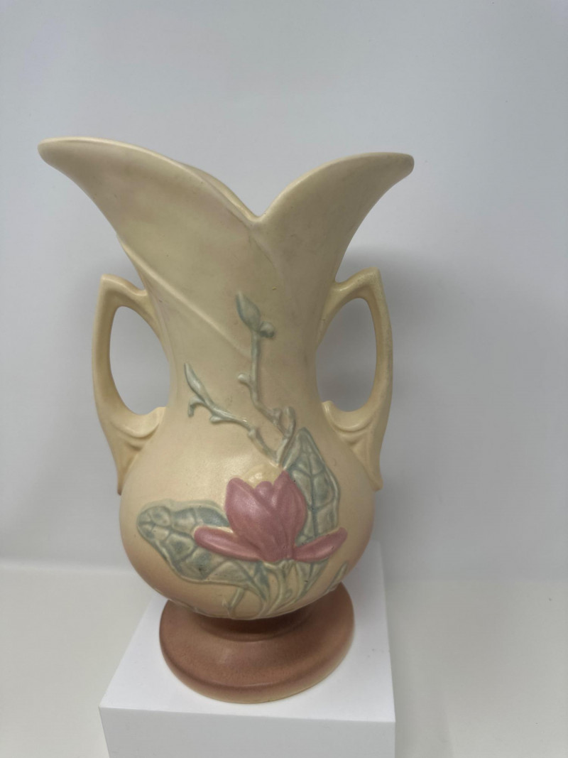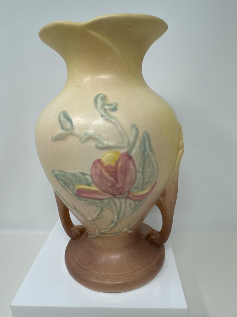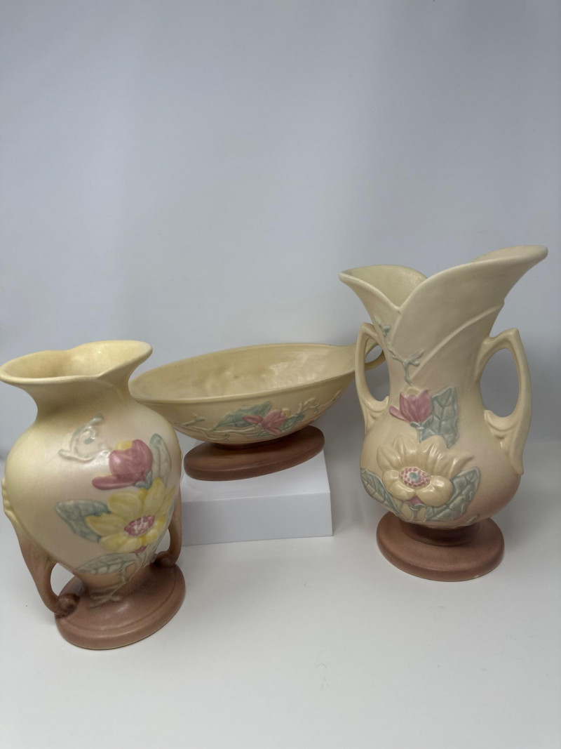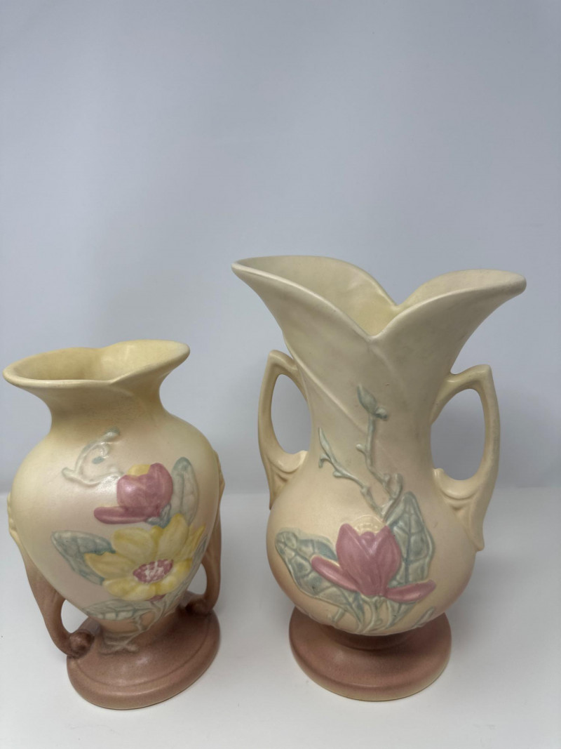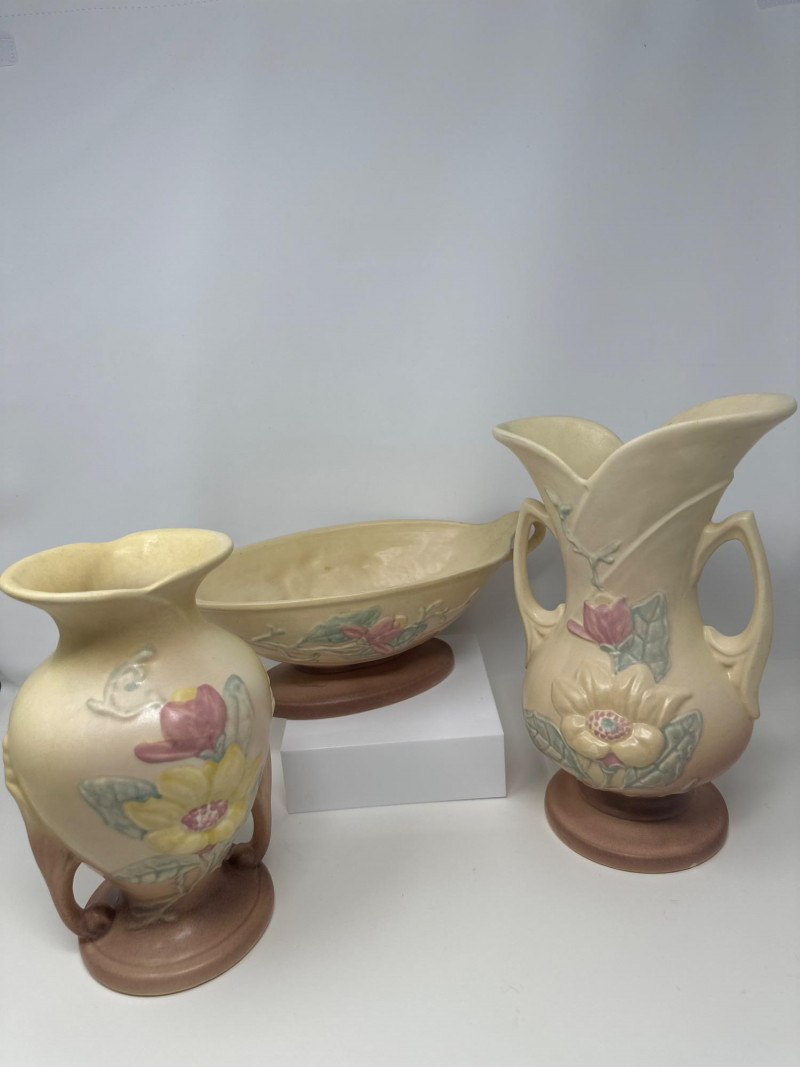 These three Hull Pottery pieces date to the 1940s and feature a dusty rose background with yellow and pink magnolia flowers in relief. The set includes two vases and a handled bowl. All pieces are free of cracks; one vase has a small chip on its base. Maker: Hull Pottery (USA) Pattern: Magnolia (dusty rose with yellow/pink flowers) Material: Glazed earthenware Dimensions: Vase 1: 10½″ tall Vase 2: 8¾″ tall (small chip on base) Bowl: 13½″ long × 4″ tall Condition: No cracks or repairs; light surface wear; one vase has a small base chip.