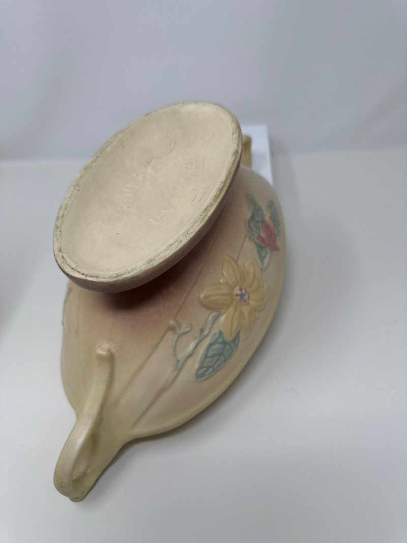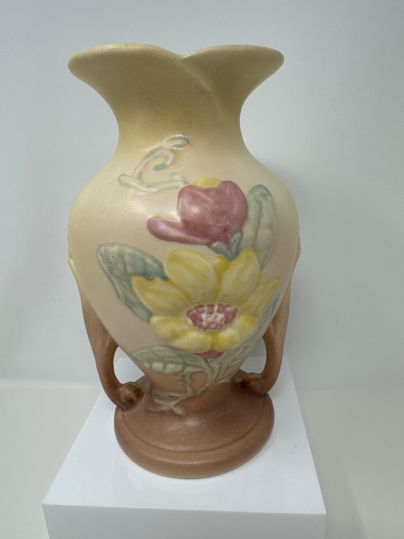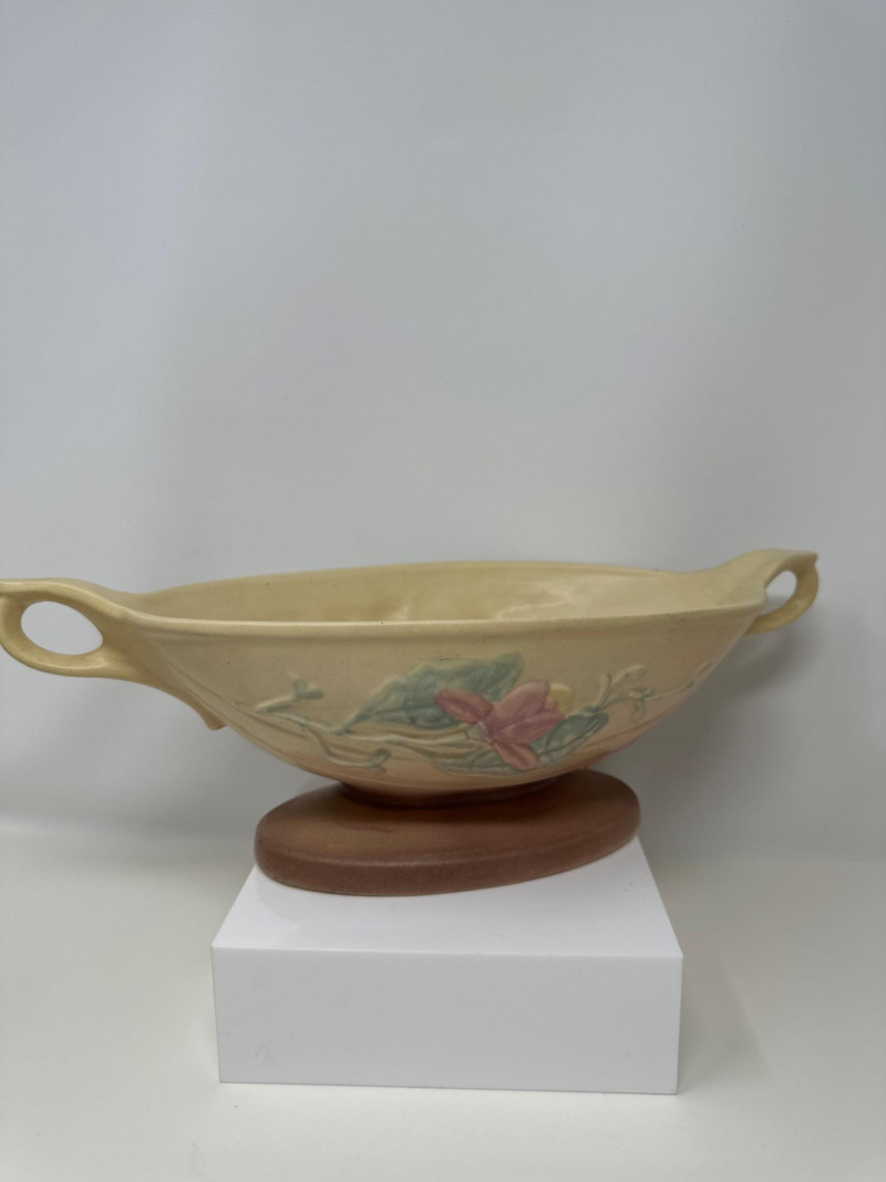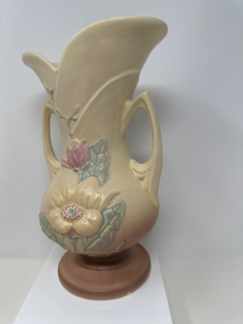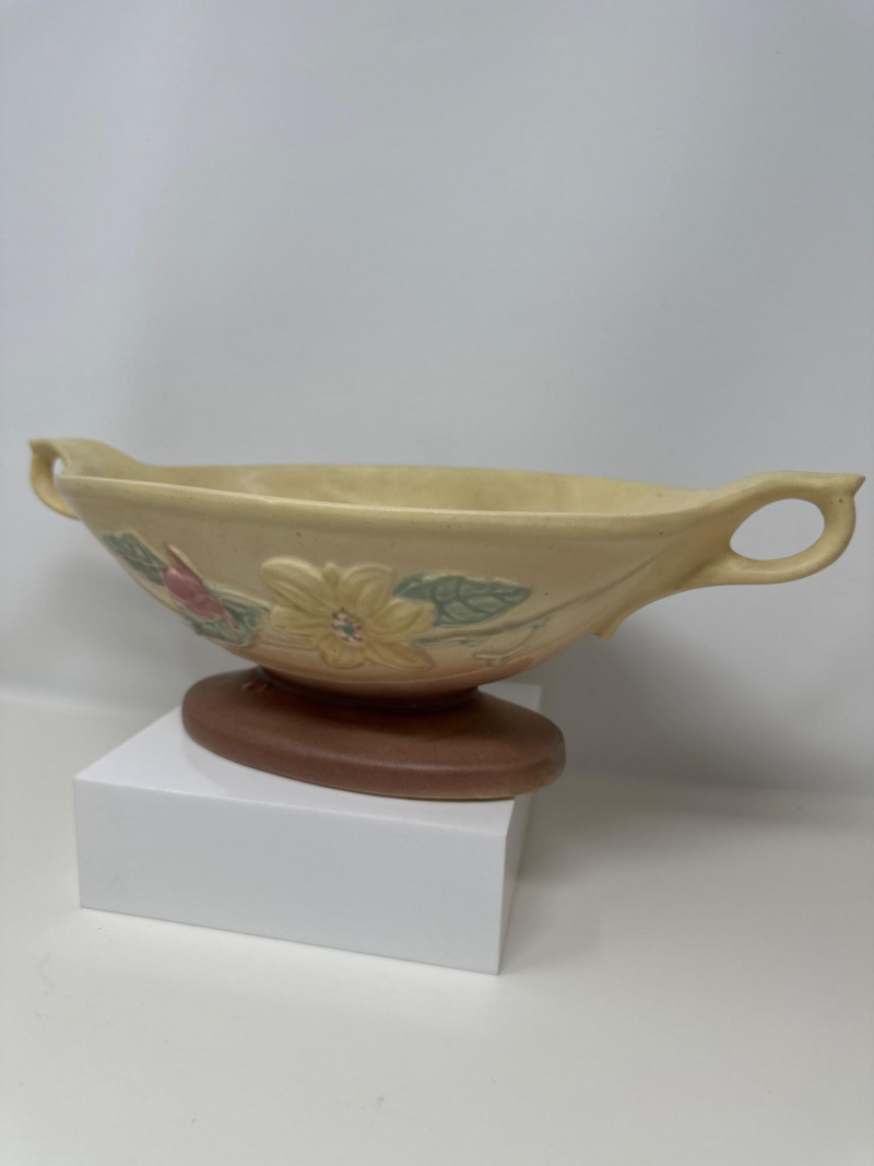These three Hull Pottery pieces date to the 1940s and feature a dusty rose background with yellow and pink magnolia flowers in relief. The set includes two vases and a handled bowl. All pieces are free of cracks; one vase has a small chip on its base. Maker: Hull Pottery (USA) Pattern: Magnolia (dusty rose with yellow/pink flowers) Material: Glazed earthenware Dimensions: Vase 1: 10½″ tall Vase 2: 8¾″ tall (small chip on base) Bowl: 13½″ long × 4″ tall Condition: No cracks or repairs; light surface wear; one vase has a small base chip.