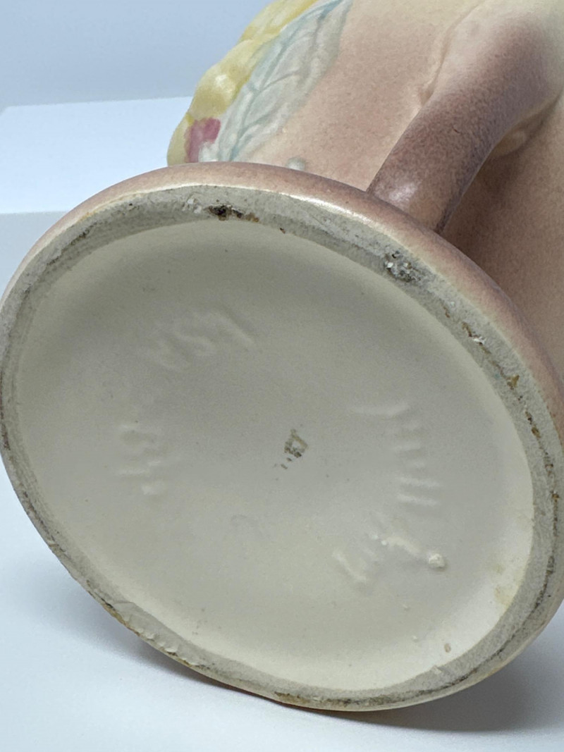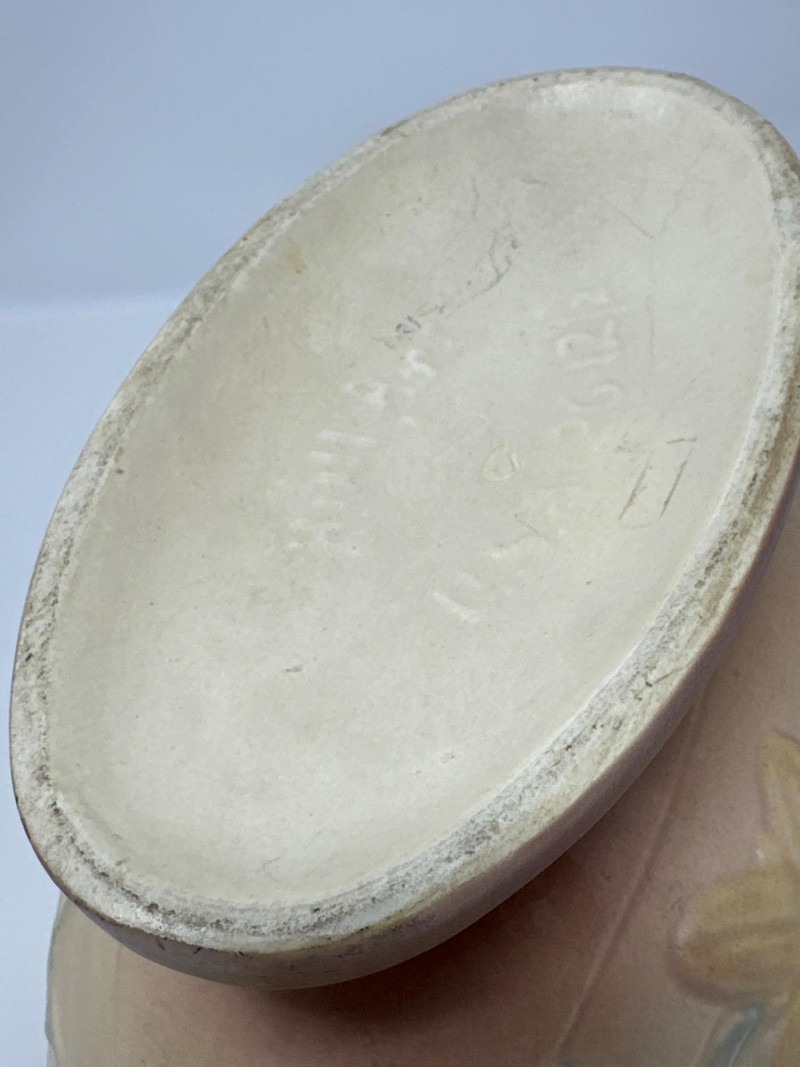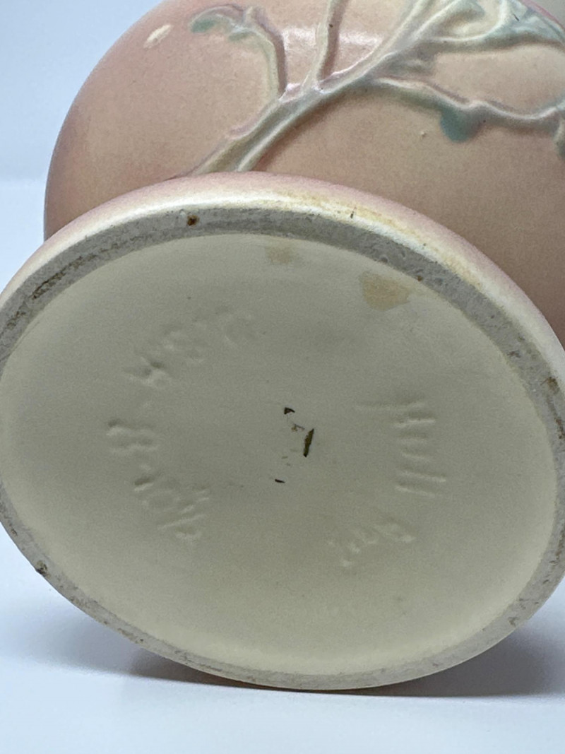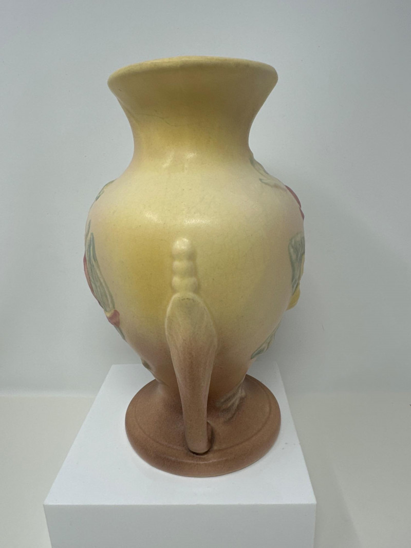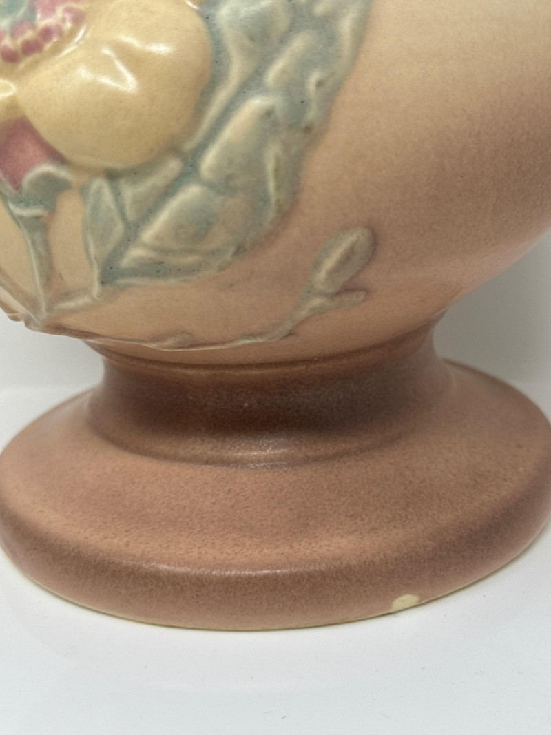 These three Hull Pottery pieces date to the 1940s and feature a dusty rose background with yellow and pink magnolia flowers in relief. The set includes two vases and a handled bowl. All pieces are free of cracks; one vase has a small chip on its base. Maker: Hull Pottery (USA) Pattern: Magnolia (dusty rose with yellow/pink flowers) Material: Glazed earthenware Dimensions: Vase 1: 10½″ tall Vase 2: 8¾″ tall (small chip on base) Bowl: 13½″ long × 4″ tall Condition: No cracks or repairs; light surface wear; one vase has a small base chip.