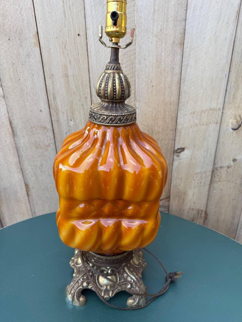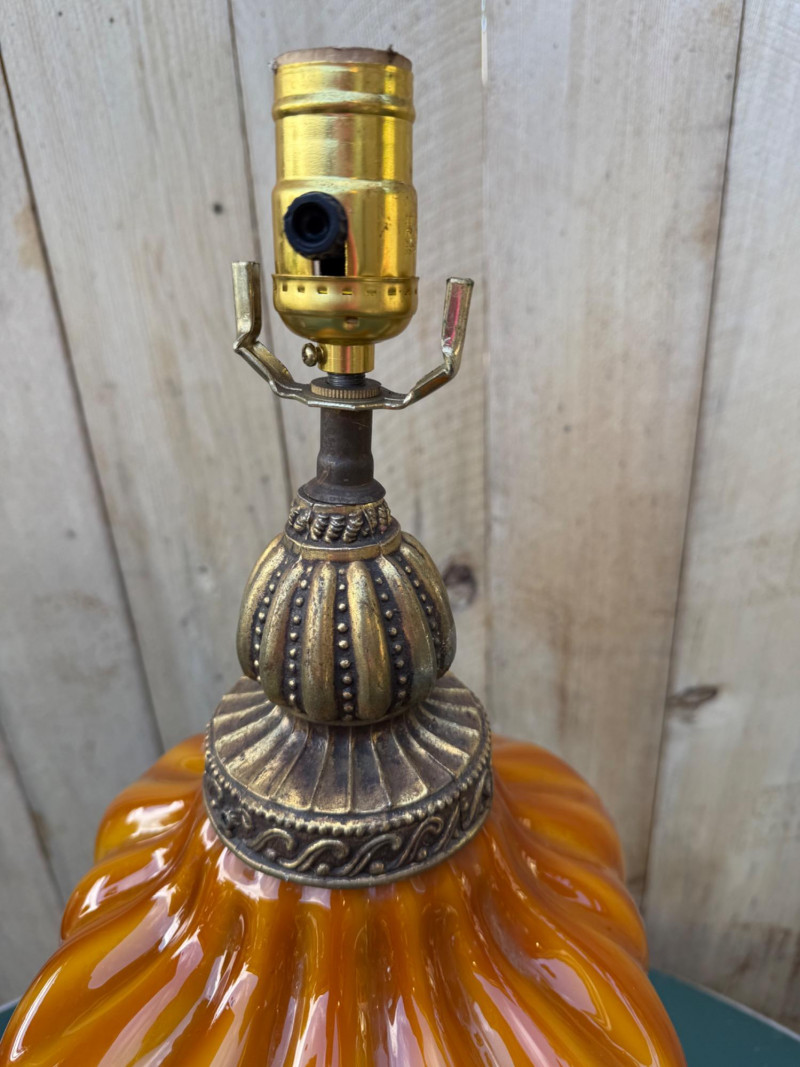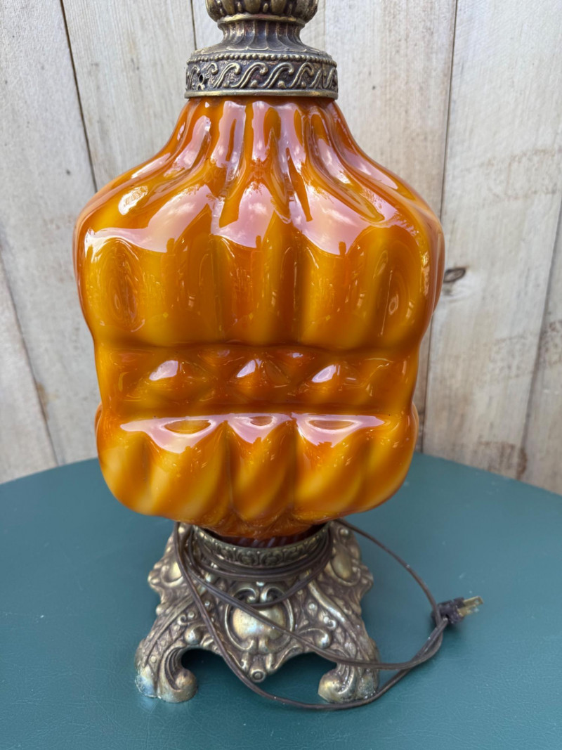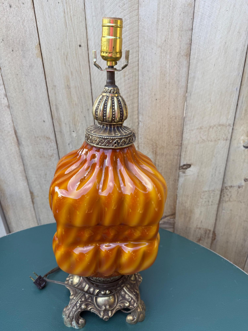 Vintage Amber Glass Table Lamp - Ribbed Design & Ornate Base This 22″ tall vintage table lamp features a molded amber glass body with a brass-tone, ornate metal base and finial. The swirling glass panels create a textured look, and the heavy metal fittings add classic appeal. Note: Electrical wiring has not been tested; lamp kits are available for easy re-wiring. Condition: No cracks or chips in glass; metal base shows light surface wear; wiring not tested (lamp kit recommended)