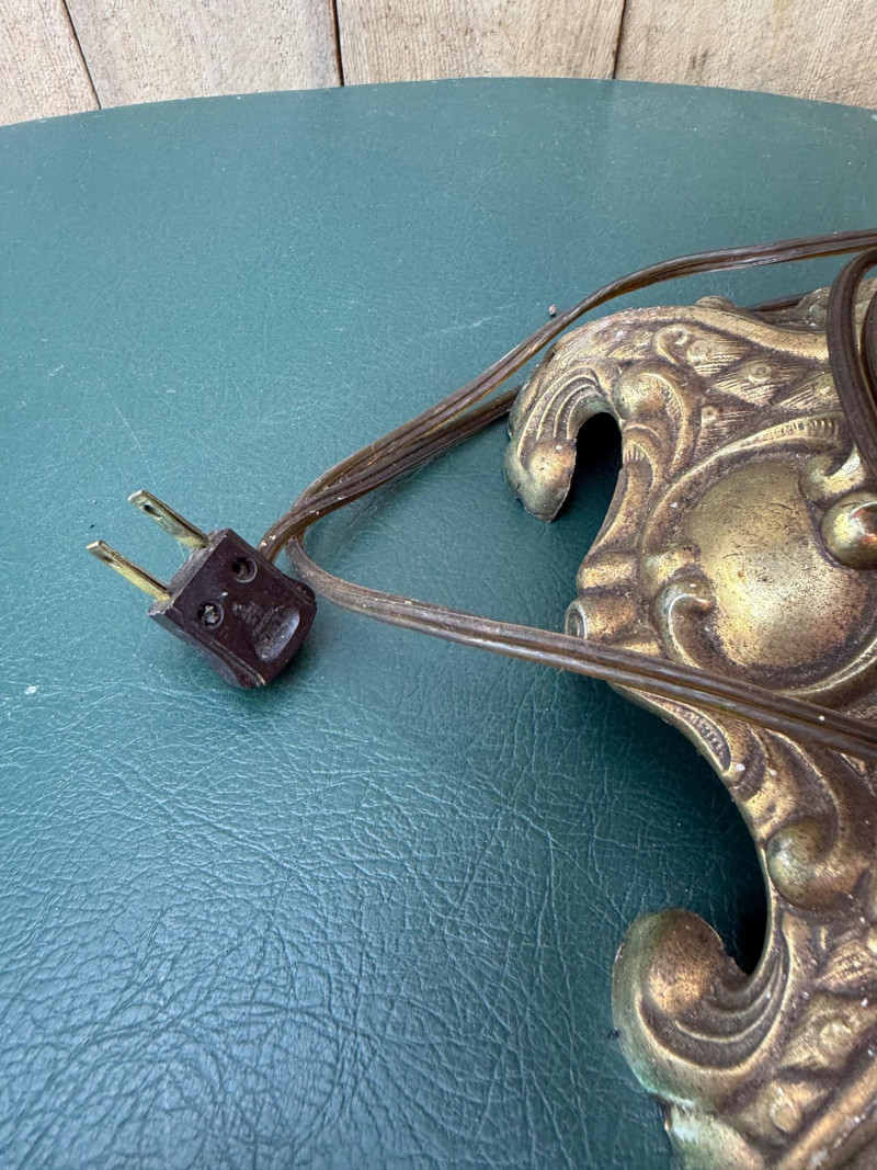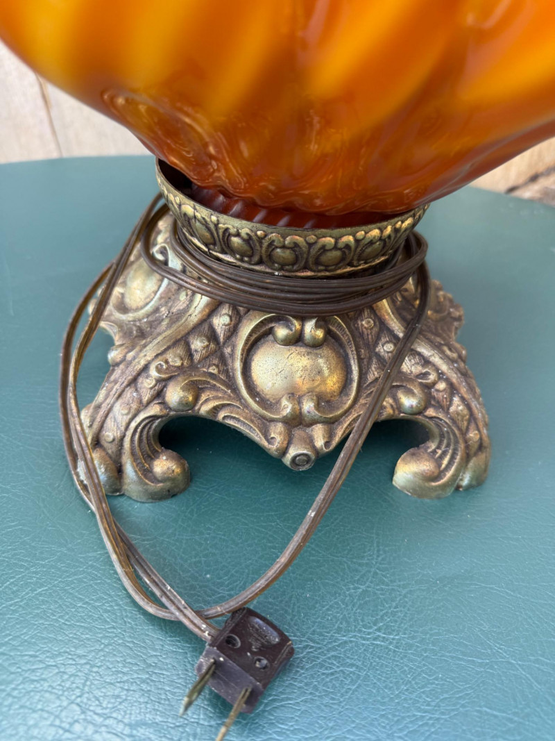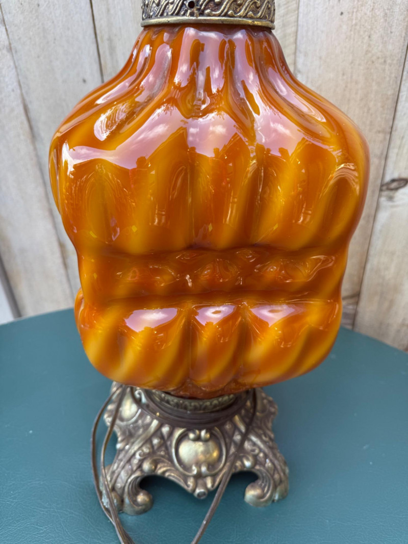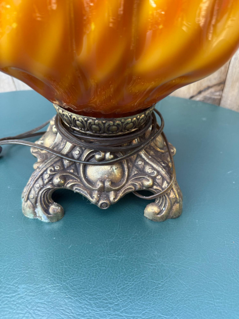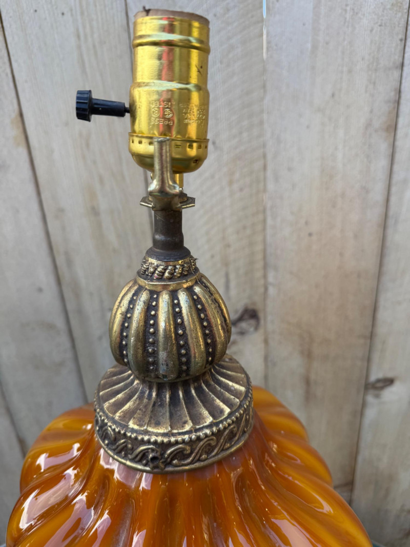 Vintage Amber Glass Table Lamp - Ribbed Design & Ornate Base This 22″ tall vintage table lamp features a molded amber glass body with a brass-tone, ornate metal base and finial. The swirling glass panels create a textured look, and the heavy metal fittings add classic appeal. Note: Electrical wiring has not been tested; lamp kits are available for easy re-wiring. Condition: No cracks or chips in glass; metal base shows light surface wear; wiring not tested (lamp kit recommended)