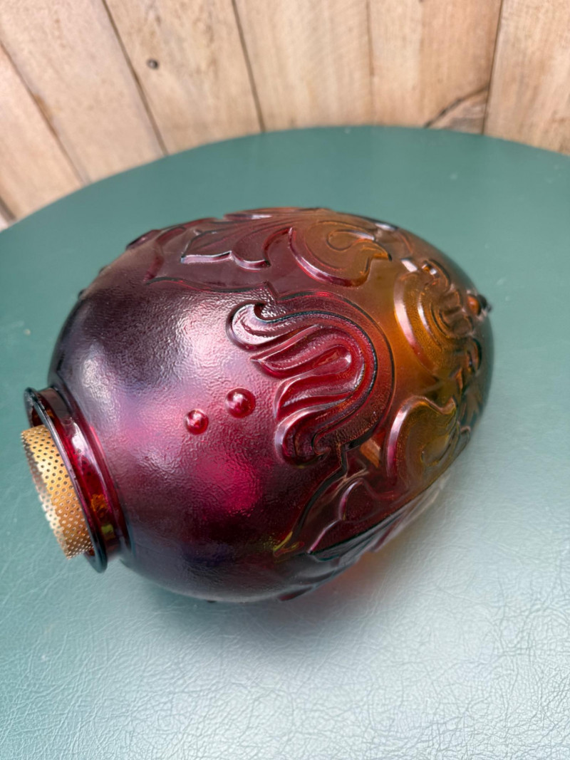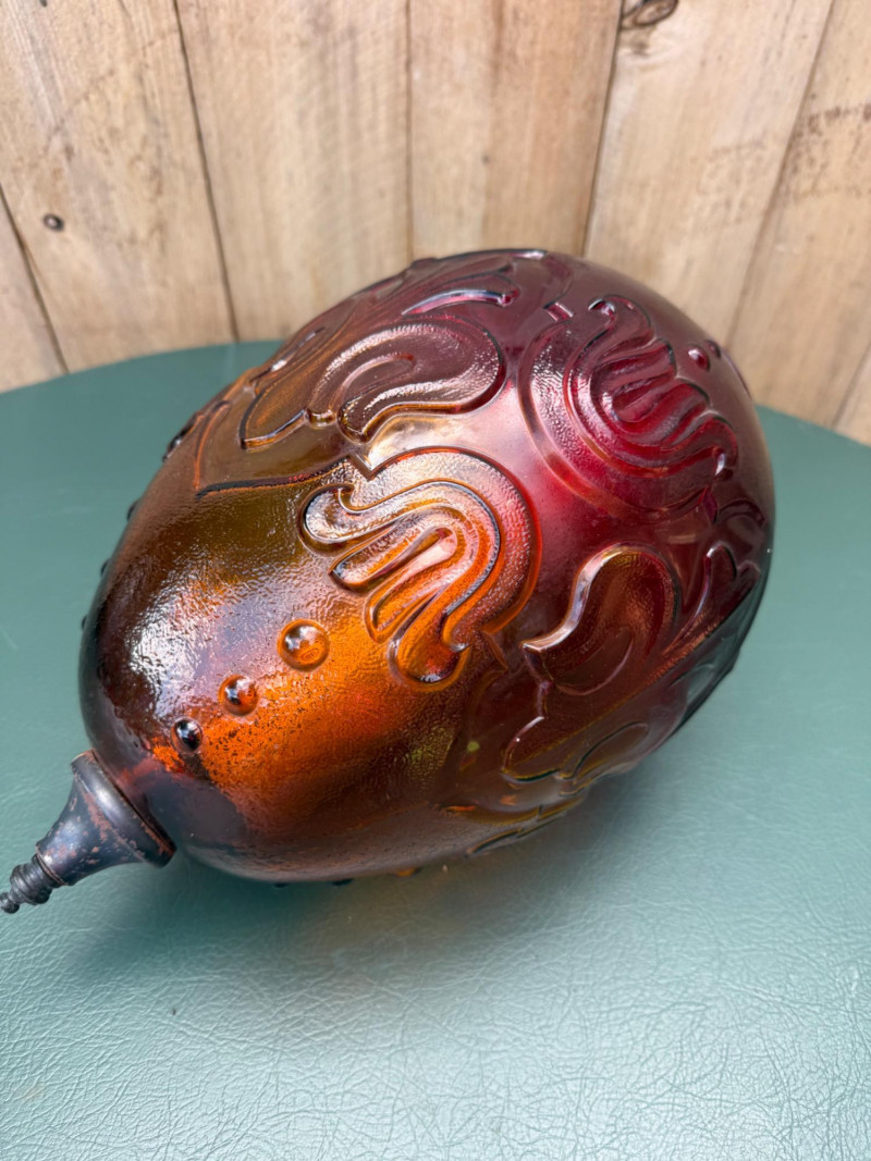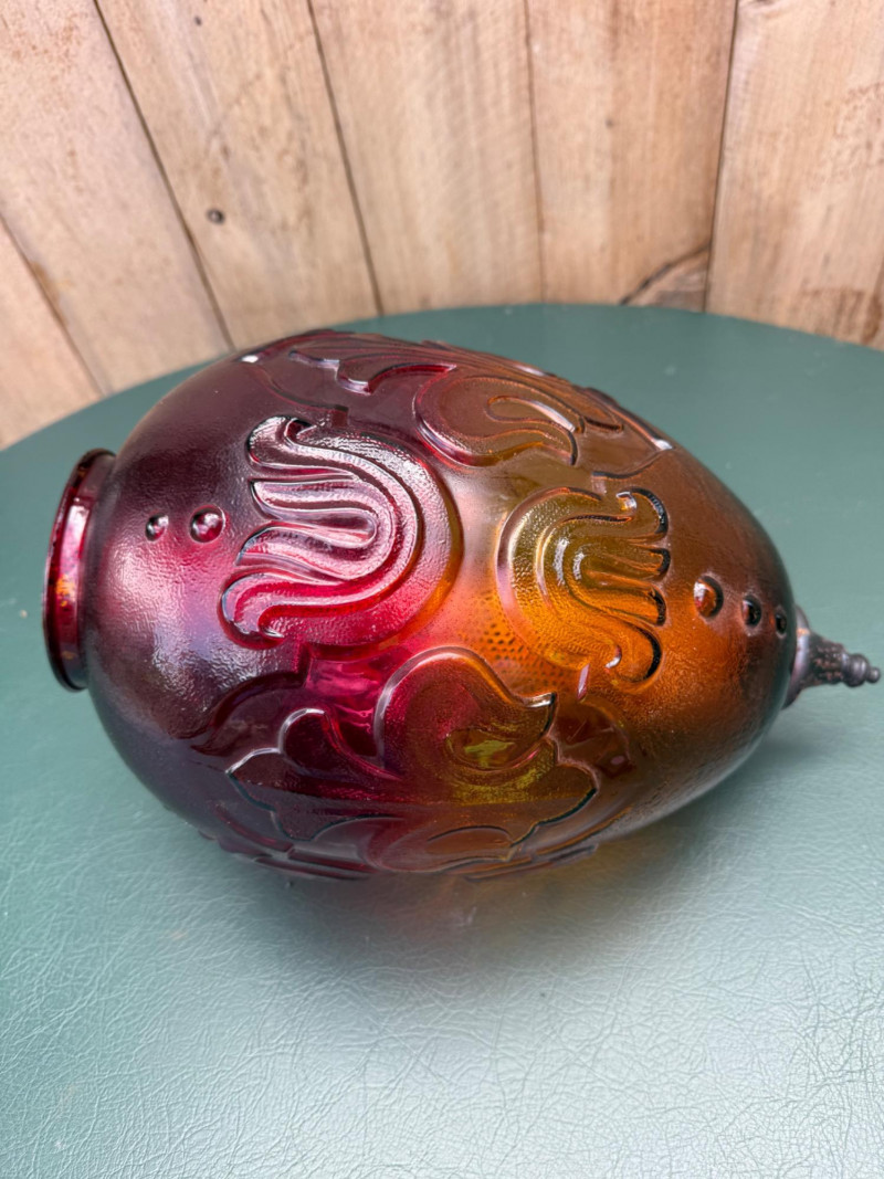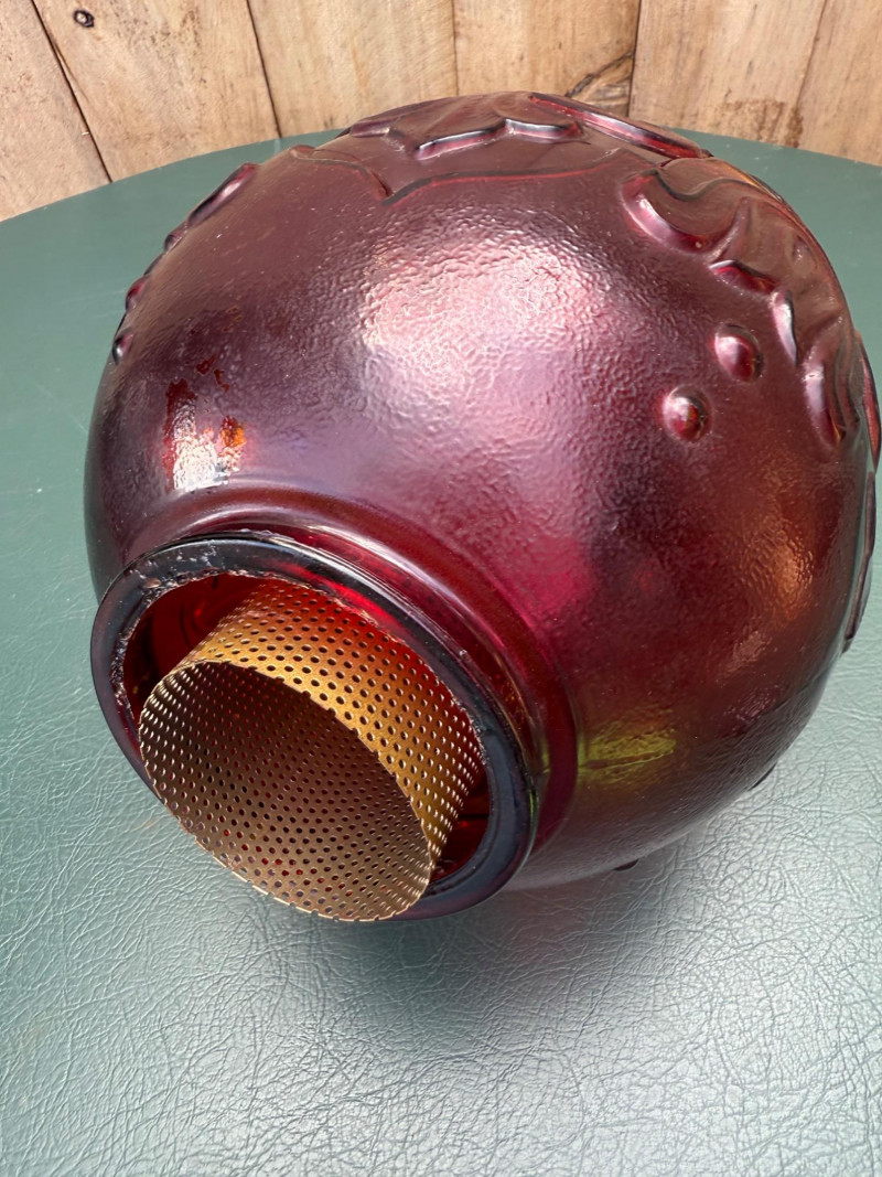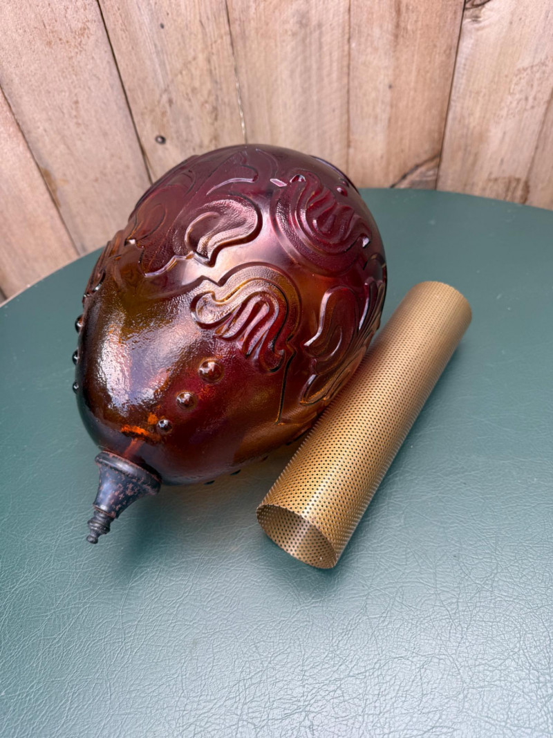 Vintage MCM Amberina Glass Hanging Lamp Shade This vintage Mid-Century Modern amberina glass shade features an embossed swirl pattern and a perforated brass-tone liner. It’s designed for a hanging fixture—no stand, pole, or hardware included. The glass has no cracks or chips, and the metal liner shows light patina consistent with age. Material: Amberina swirl-patterned glass with brass-tone metal insert Dimensions: 16″ height × 7½″ width Condition: No cracks or chips; minor surface wear on glass and patina on metal Includes: Glass shade and metal insert only; mounting hardware not included
