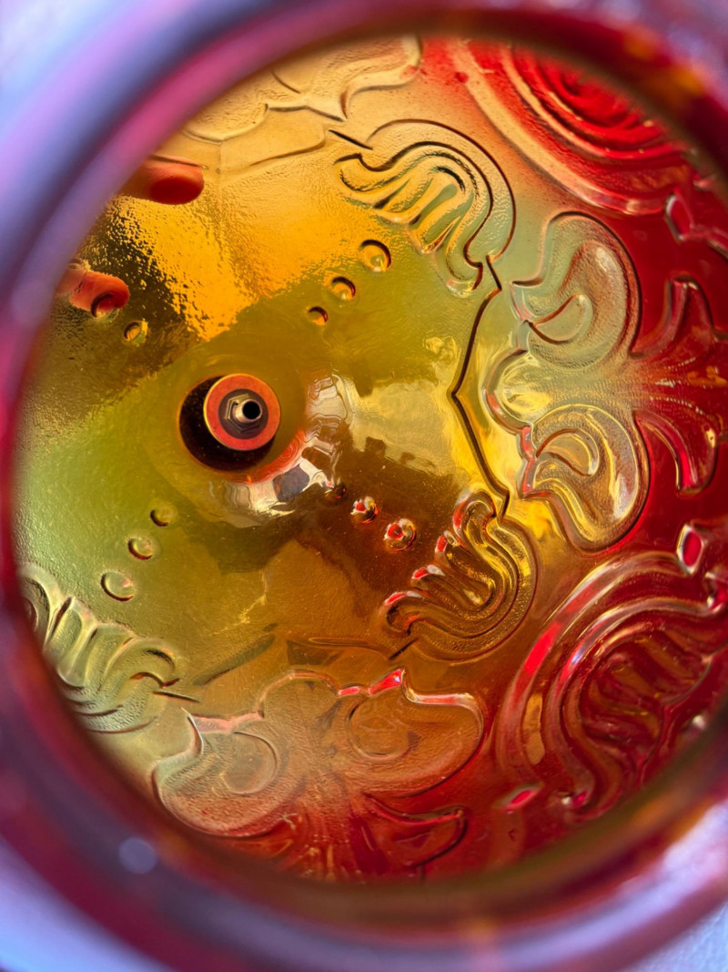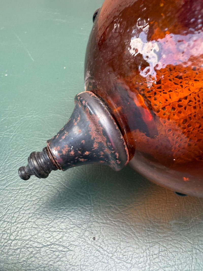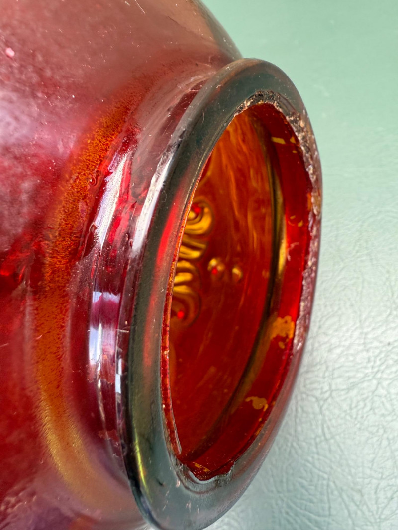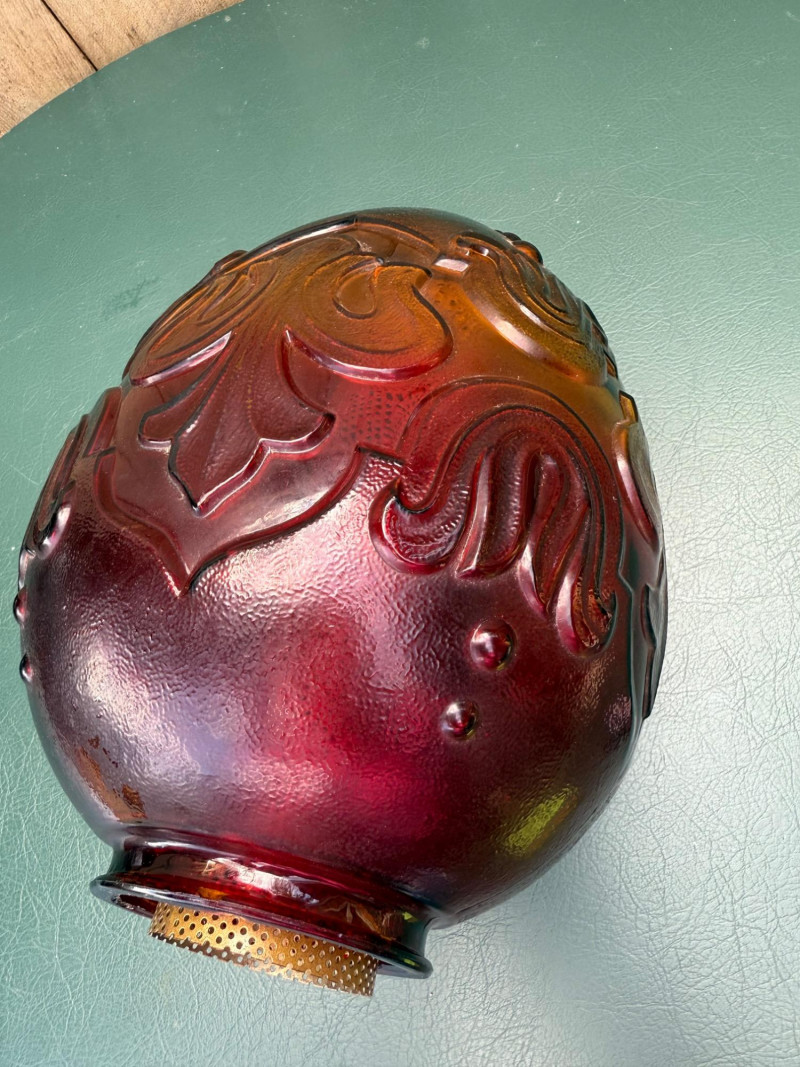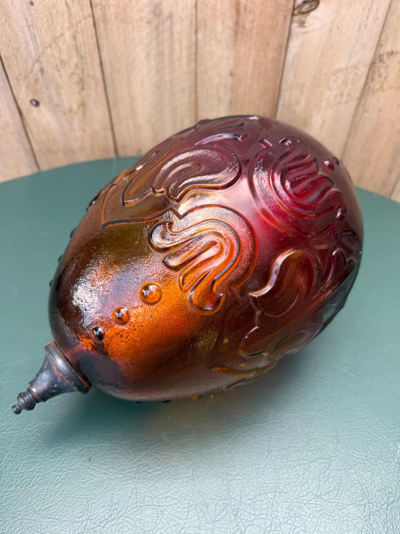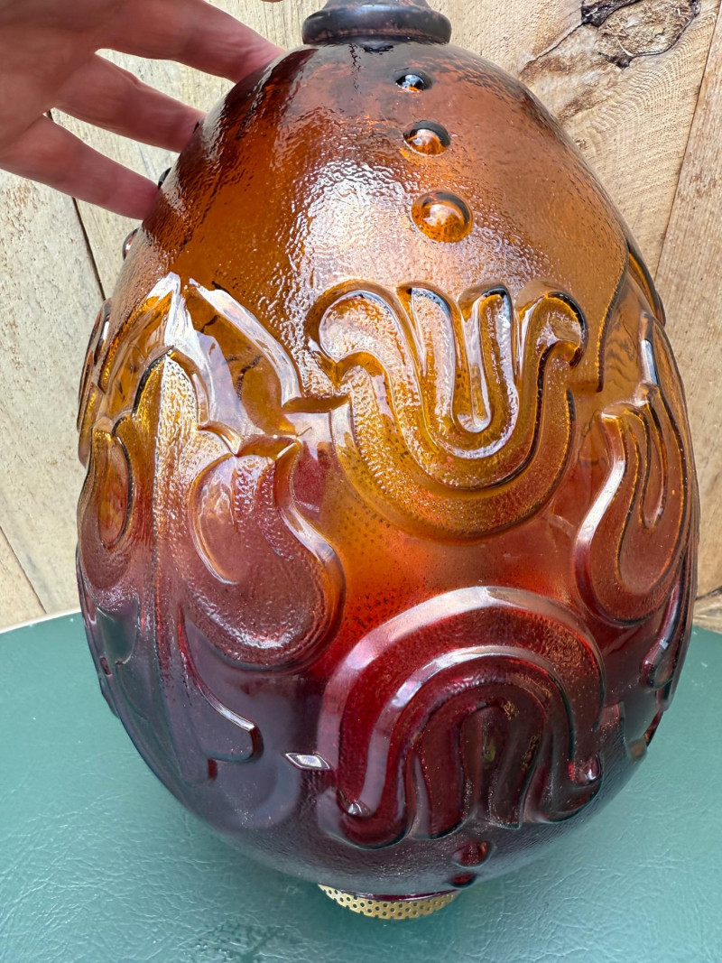Vintage MCM Amberina Glass Hanging Lamp Shade This vintage Mid-Century Modern amberina glass shade features an embossed swirl pattern and a perforated brass-tone liner. It’s designed for a hanging fixture—no stand, pole, or hardware included. The glass has no cracks or chips, and the metal liner shows light patina consistent with age. Material: Amberina swirl-patterned glass with brass-tone metal insert Dimensions: 16″ height × 7½″ width Condition: No cracks or chips; minor surface wear on glass and patina on metal Includes: Glass shade and metal insert only; mounting hardware not included
