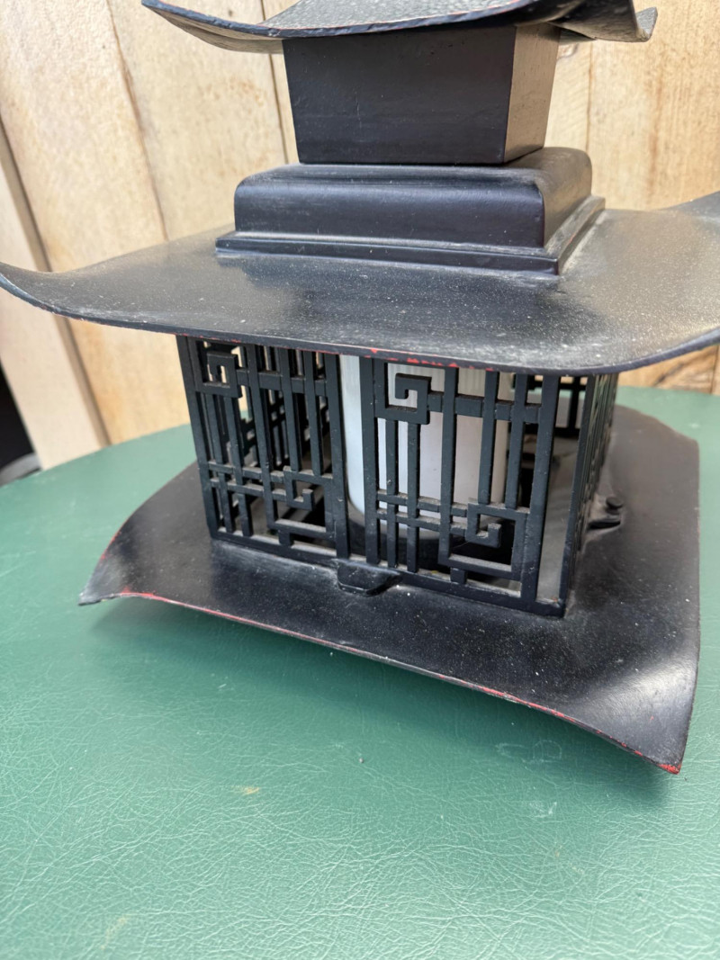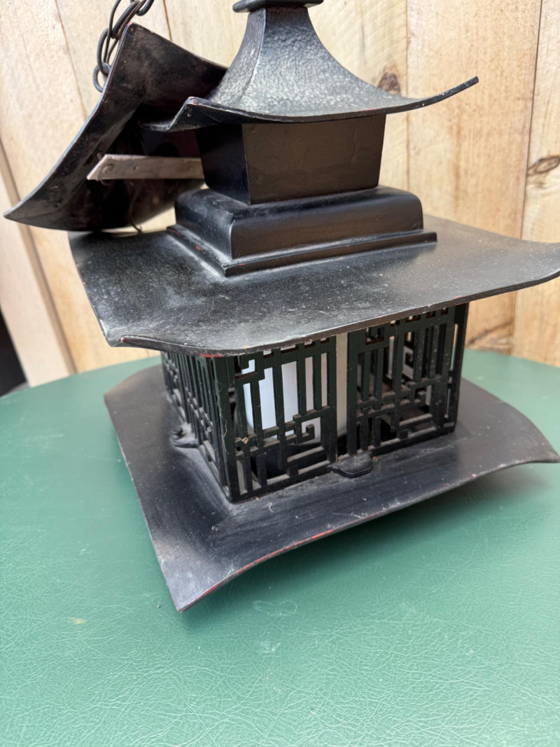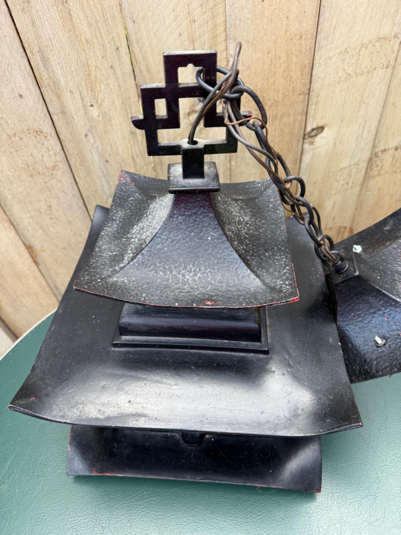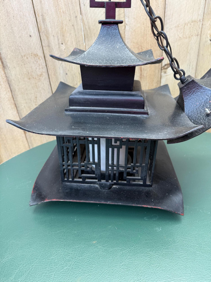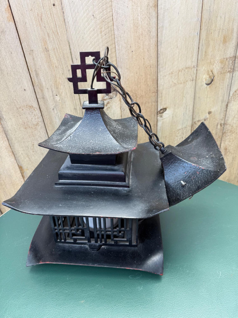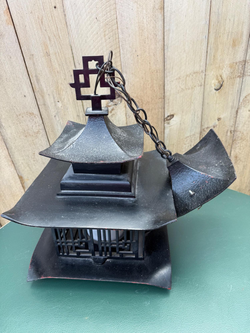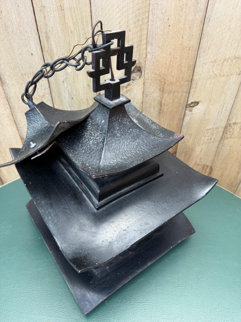 1960s Chinese Pagoda Hanging Lantern Chandelier, 18.5″×13″ Est. $800. This 1960s Chinoiserie-style pagoda lantern is crafted from black-finished metal with tiered roofs and lattice panels on all sides. It hangs by its original chain and fits a standard socket (wiring not tested). The finish shows light surface wear and minor paint loss consistent with age.