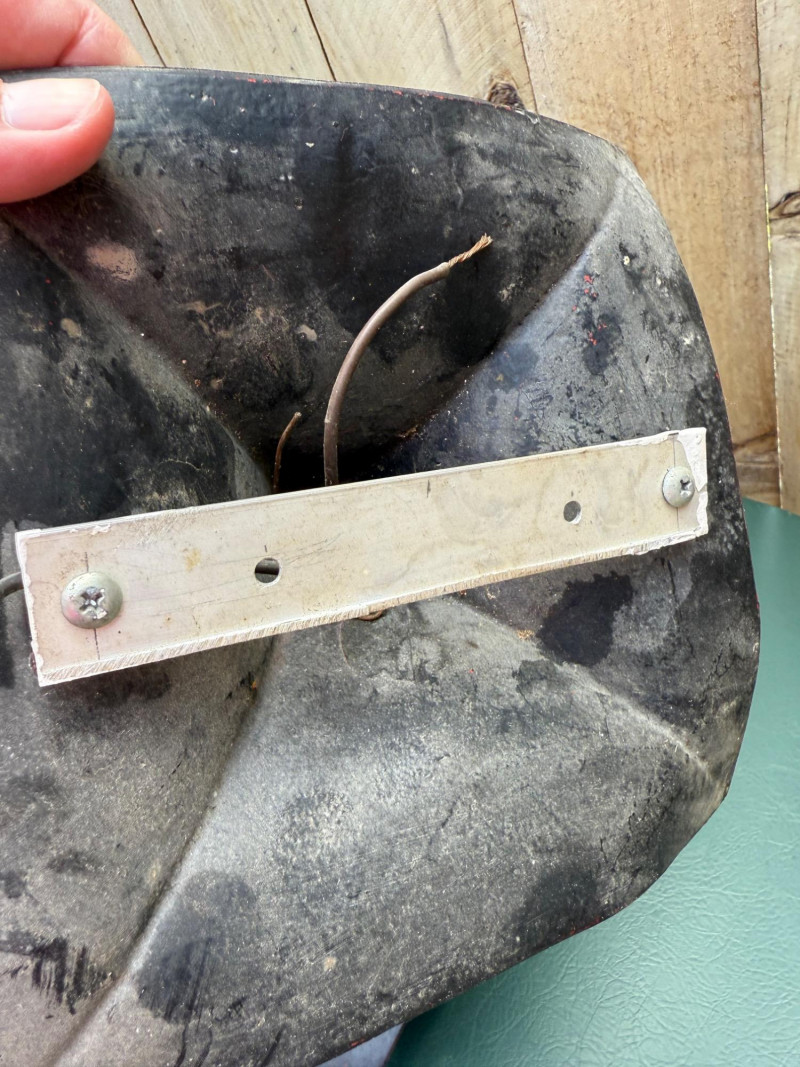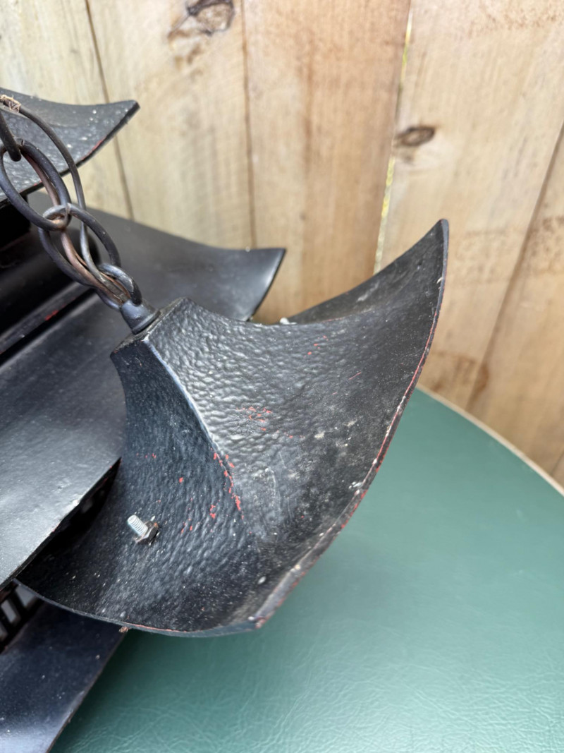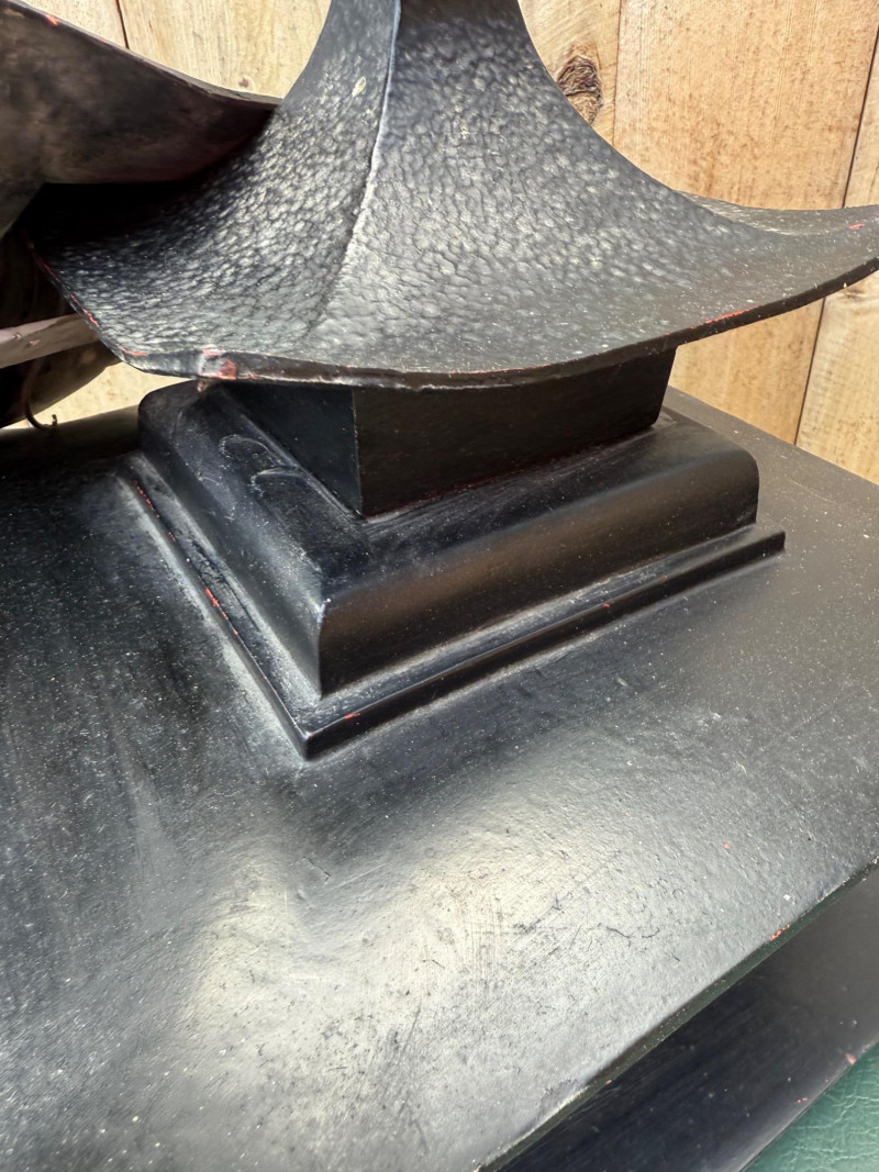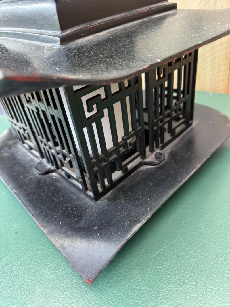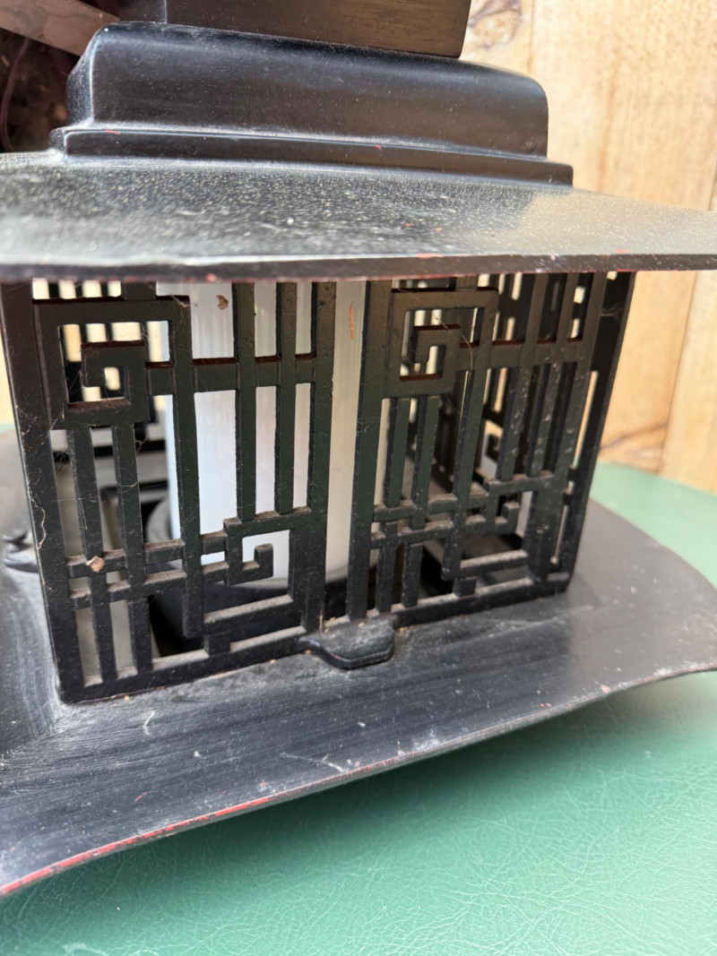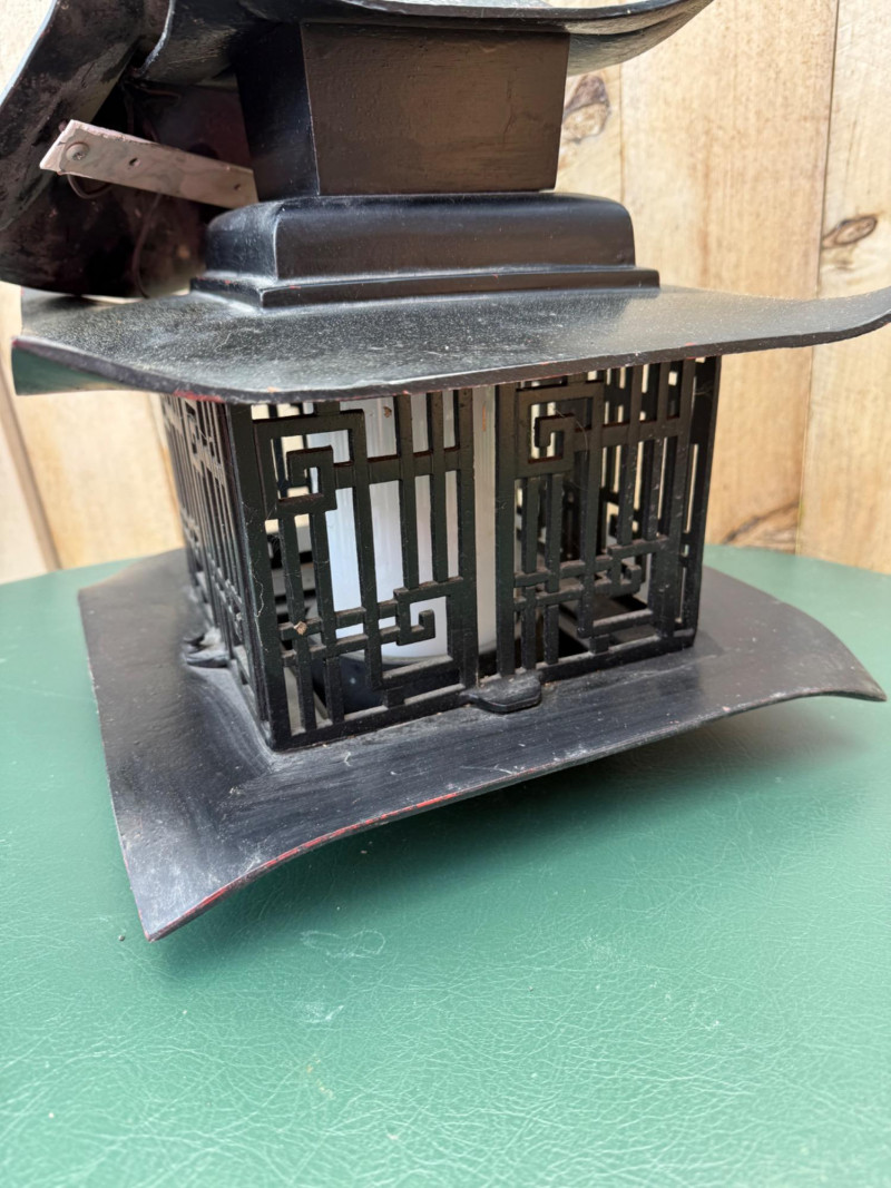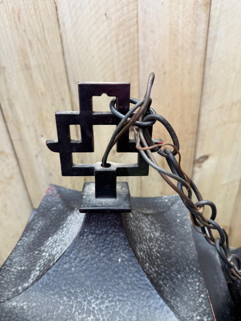 1960s Chinese Pagoda Hanging Lantern Chandelier, 18.5″×13″ Est. $800. This 1960s Chinoiserie-style pagoda lantern is crafted from black-finished metal with tiered roofs and lattice panels on all sides. It hangs by its original chain and fits a standard socket (wiring not tested). The finish shows light surface wear and minor paint loss consistent with age.