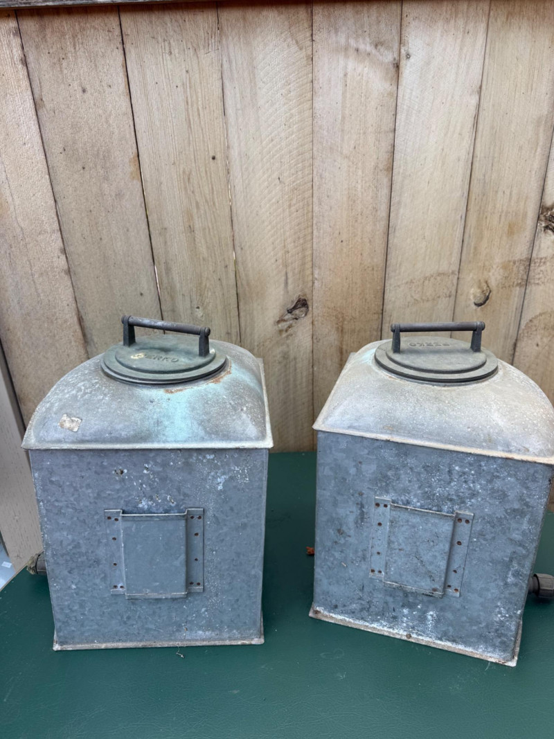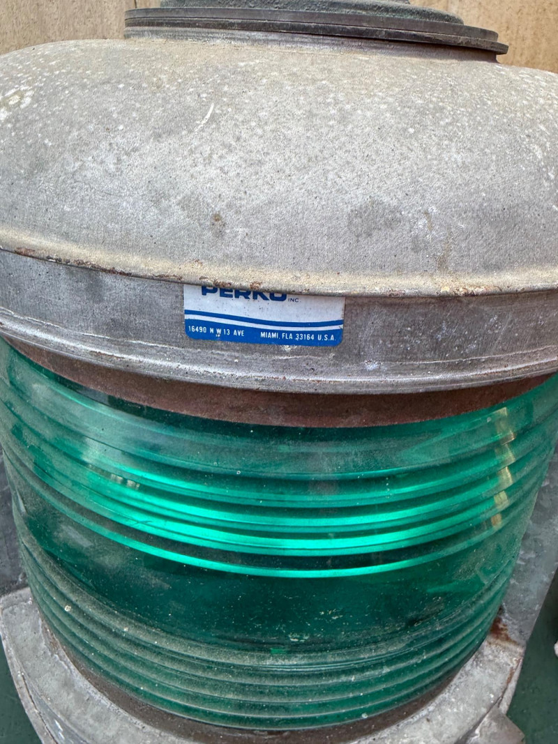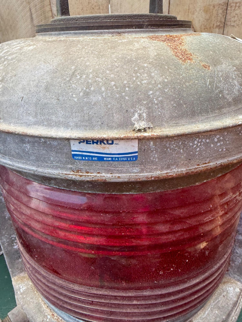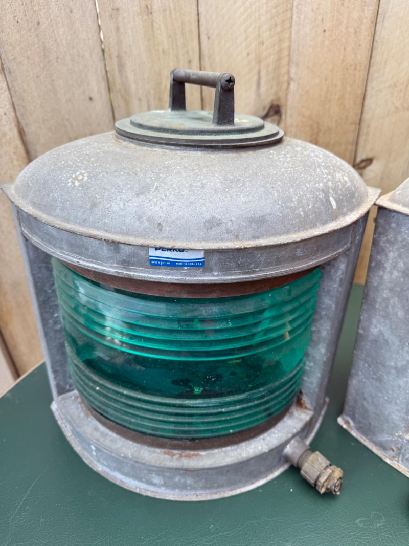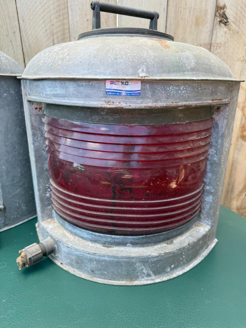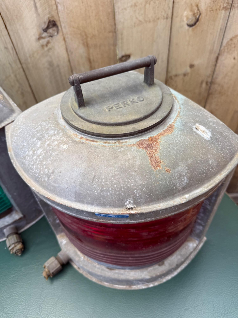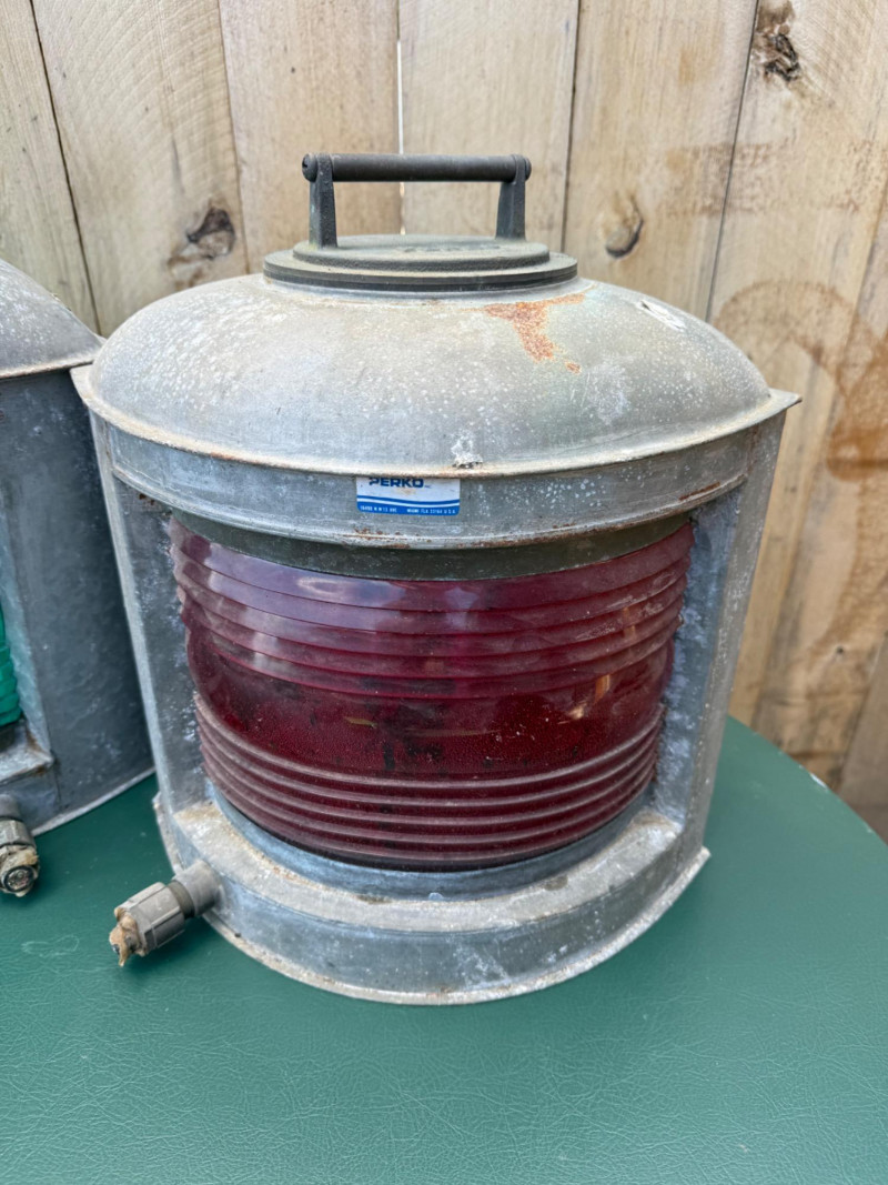 Pair Vintage Perko Marine Navigation Lights - Red & Green Lanterns This lot features a pair of vintage Perko marine navigation lights, one with a red lens and one with a green lens. These authentic ship lanterns show their age and use, making them great for maritime decor or as a collector's item. They retain their original Perko Inc. labels.