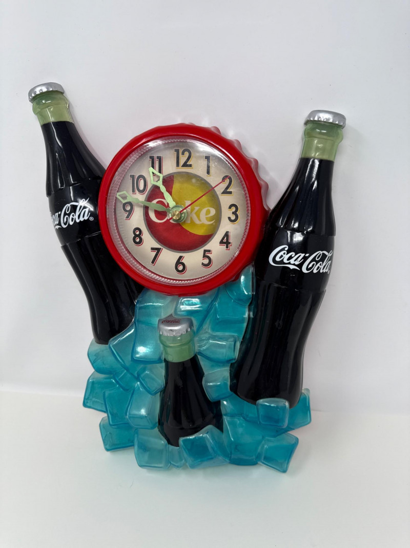 Vintage Coca-Cola Wall Clock - Bottles & Ice Cubes Design - Works! This is a vintage Coca-Cola themed clock. It features two Coca-Cola bottles with a clock face designed like a bottle cap, sitting on an 'ice' base. The clock has been tested with a new battery and is working correctly. It is a good item for any Coke collector or retro decor.