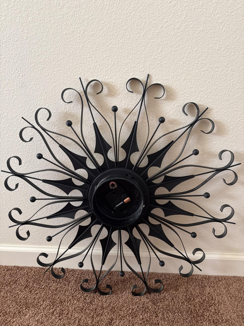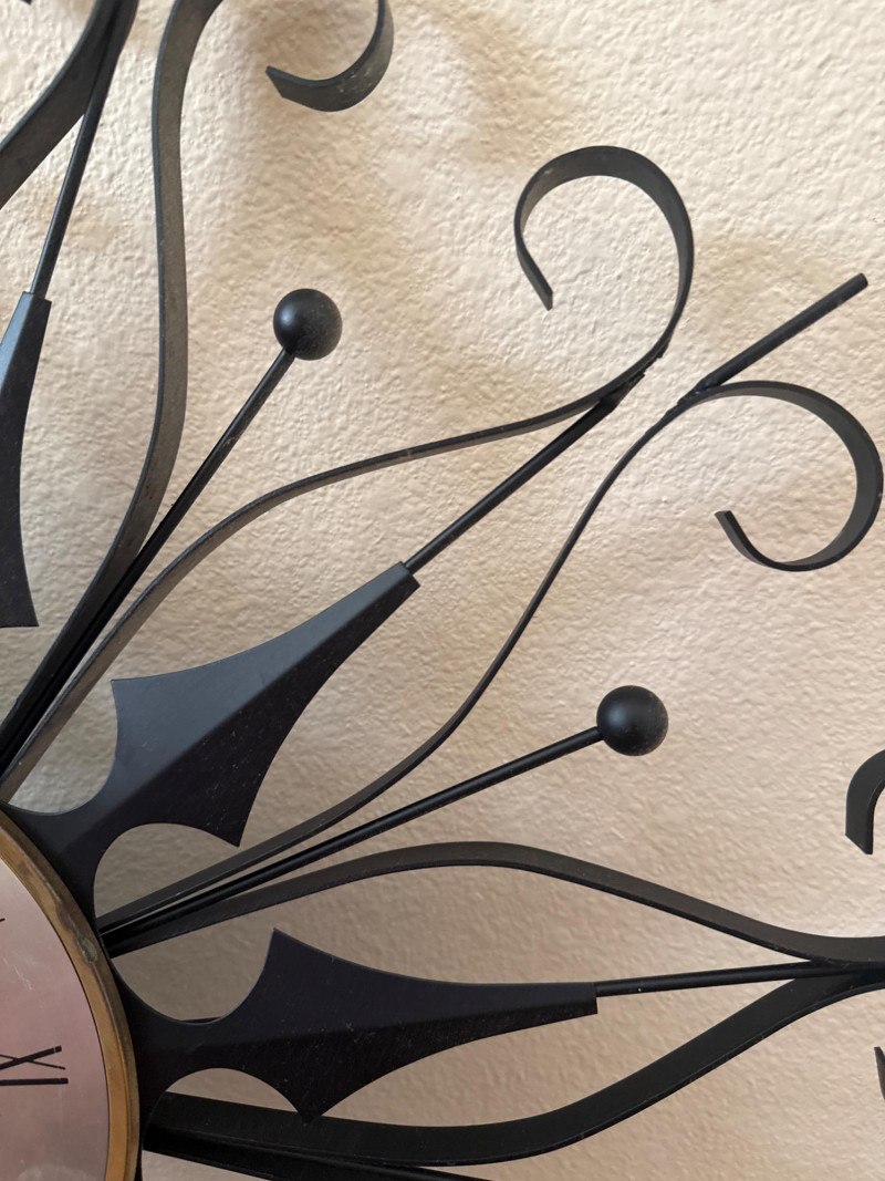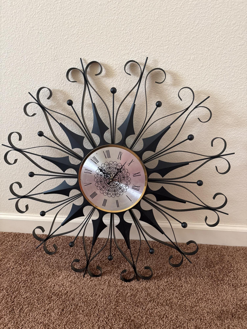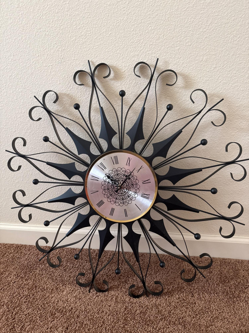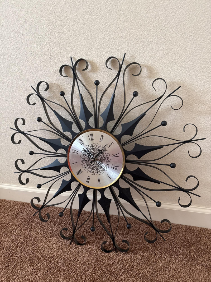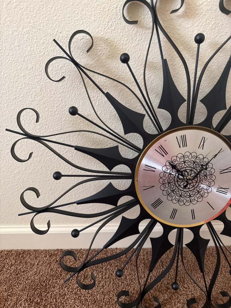 Vintage MCM Elgin Black Metal Starburst Wall Clock - 26" - Works This is a vintage Mid Century Modern wall clock by Elgin. It features a black metal starburst design and is 26 inches in diameter. The clock has been tested and is working.